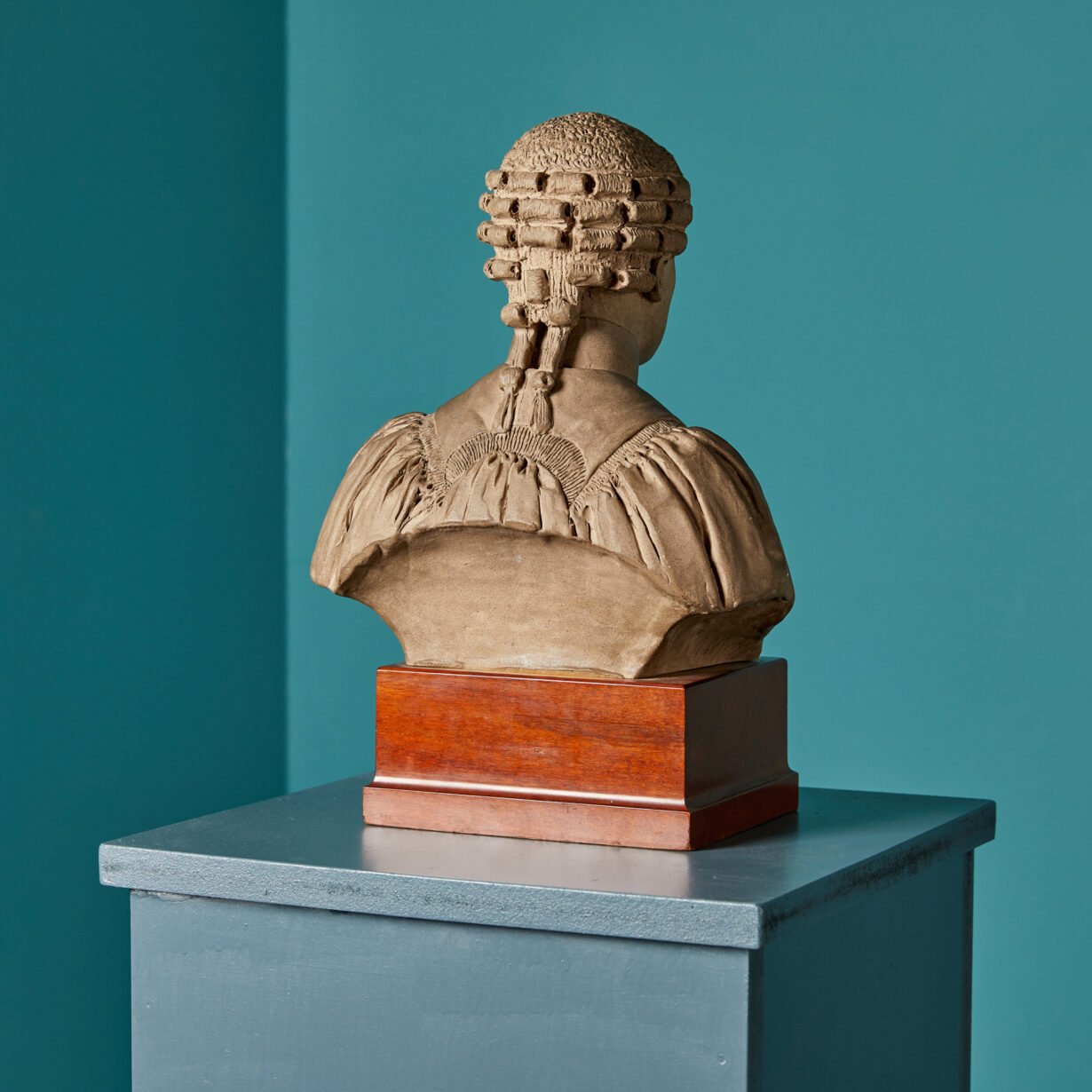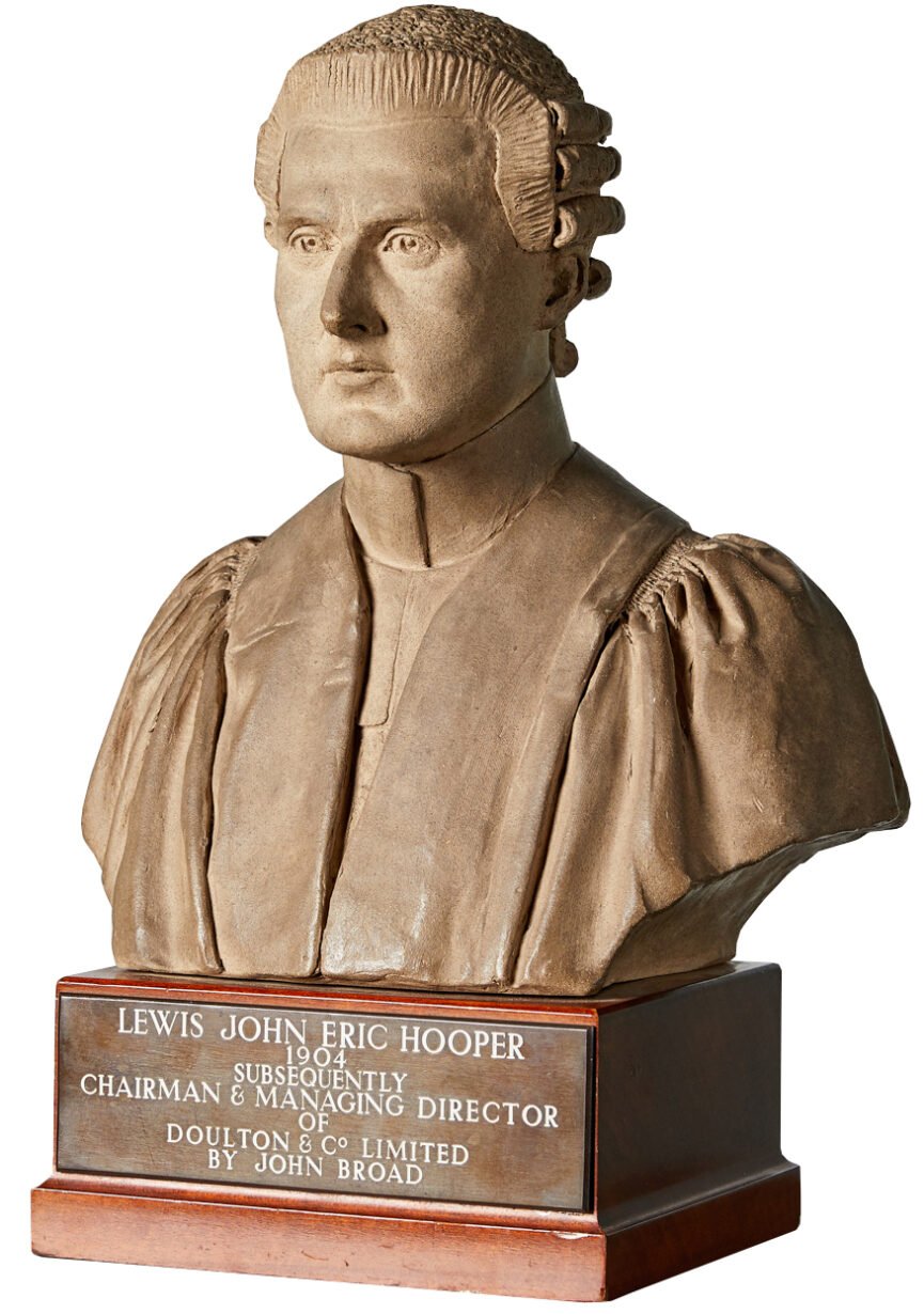 back to topDated 1904, this stoneware bust was made by late 19th century Doulton sculptor John Broad. It depicts Lewis John Eric Hooper, descendant of John Doulton who was founder of the famous Doulton & Co. of Lambeth, London. A barrister at the time, Hooper became Managing Director of the ceramics company from 1919 and subsequently Chairman from 1925. Here he is depicted in his barrister dress by the talented hand of Broad, giving us a glimpse into the character of Hooper as well as Broad’s artistic talent for statuary. The bust is in good condition, made in stoneware and sits on a wooden plinth detailed with plaque. This bust is likely a one-off commission.