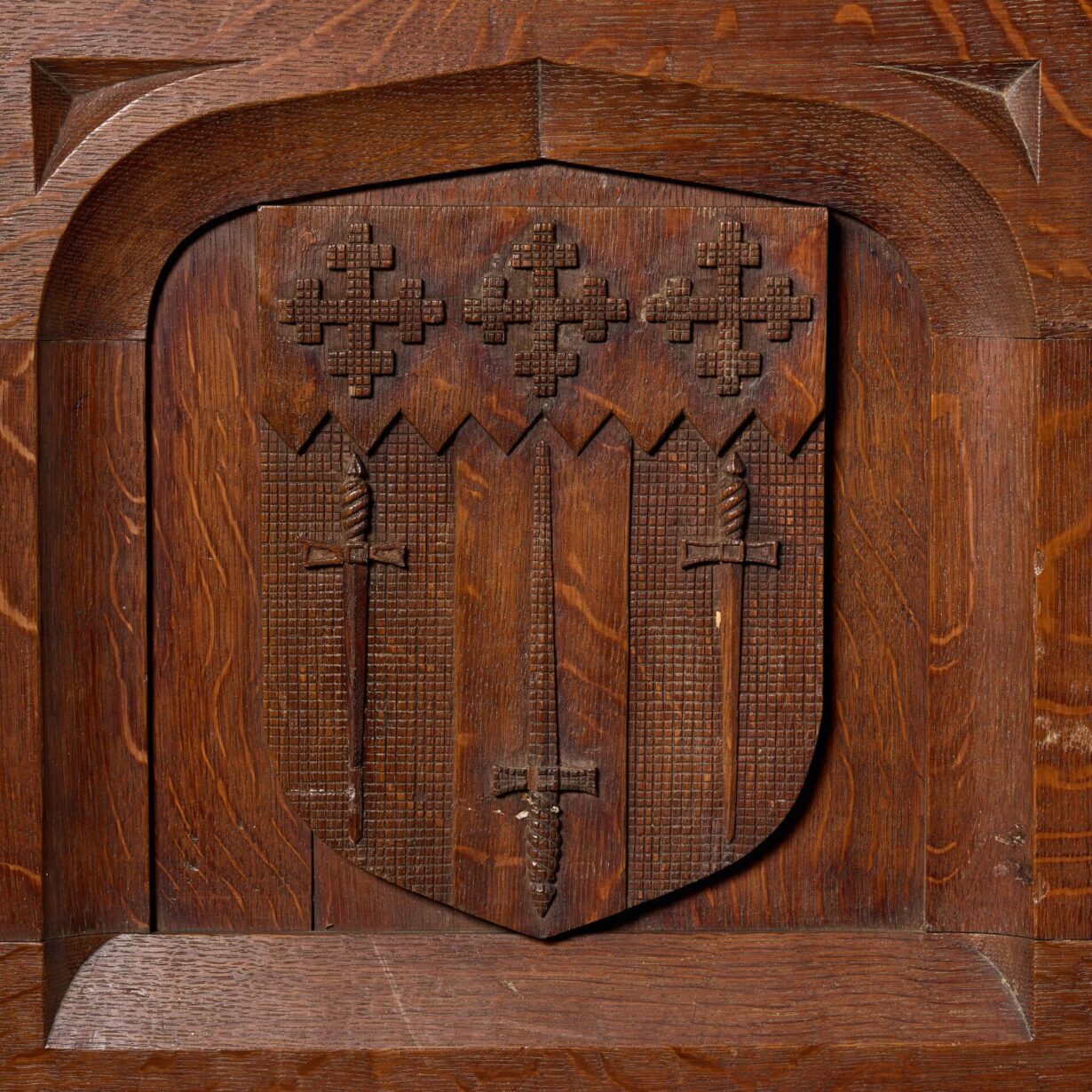 Known in heraldry as impalement, the central shield blends the symbols of the left shield, three crosses above three swords, with the right, a rampant lion with a central banner across, to create one combined coat of arms, suggesting a union. Perhaps this was a marriage panel to commemorate the union of two families, with the family motto above. Traditionally, the husband’s crest occupied the left part of the shield and the wife’s the right.