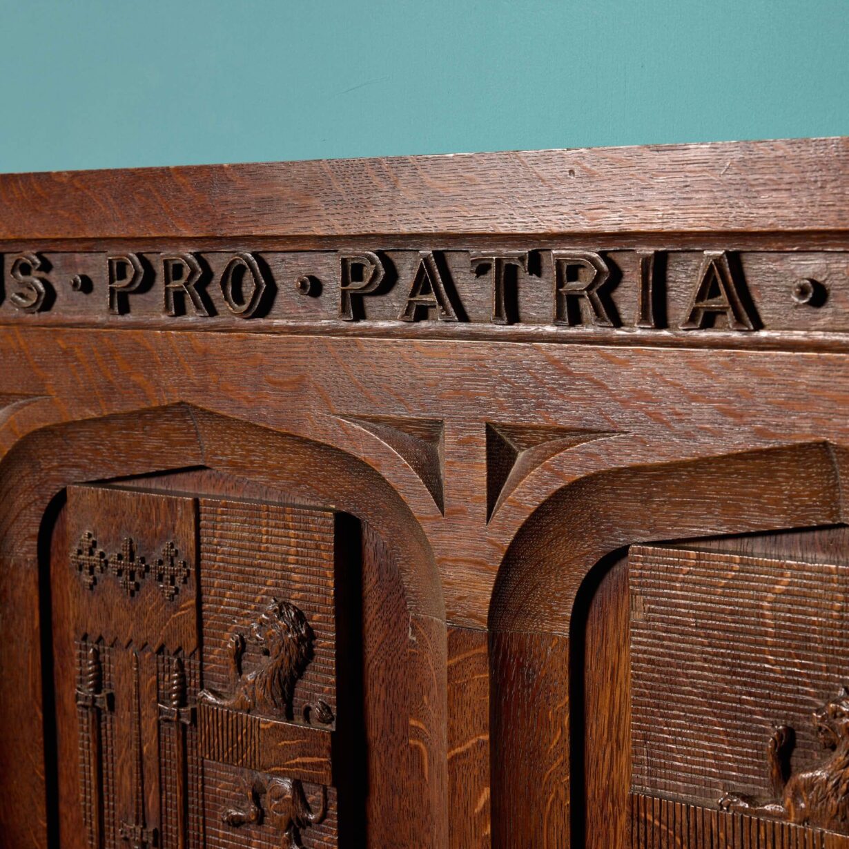 back to topA carved English oak armorial wall panel of handsome subject, colour and quality dating from the mid 19th century. Excellently carved, the wooden panel depicts three armorial crests below the Latin inscription “Non timidus pro patria mori” (translating to “fearless die for the fatherland”).
