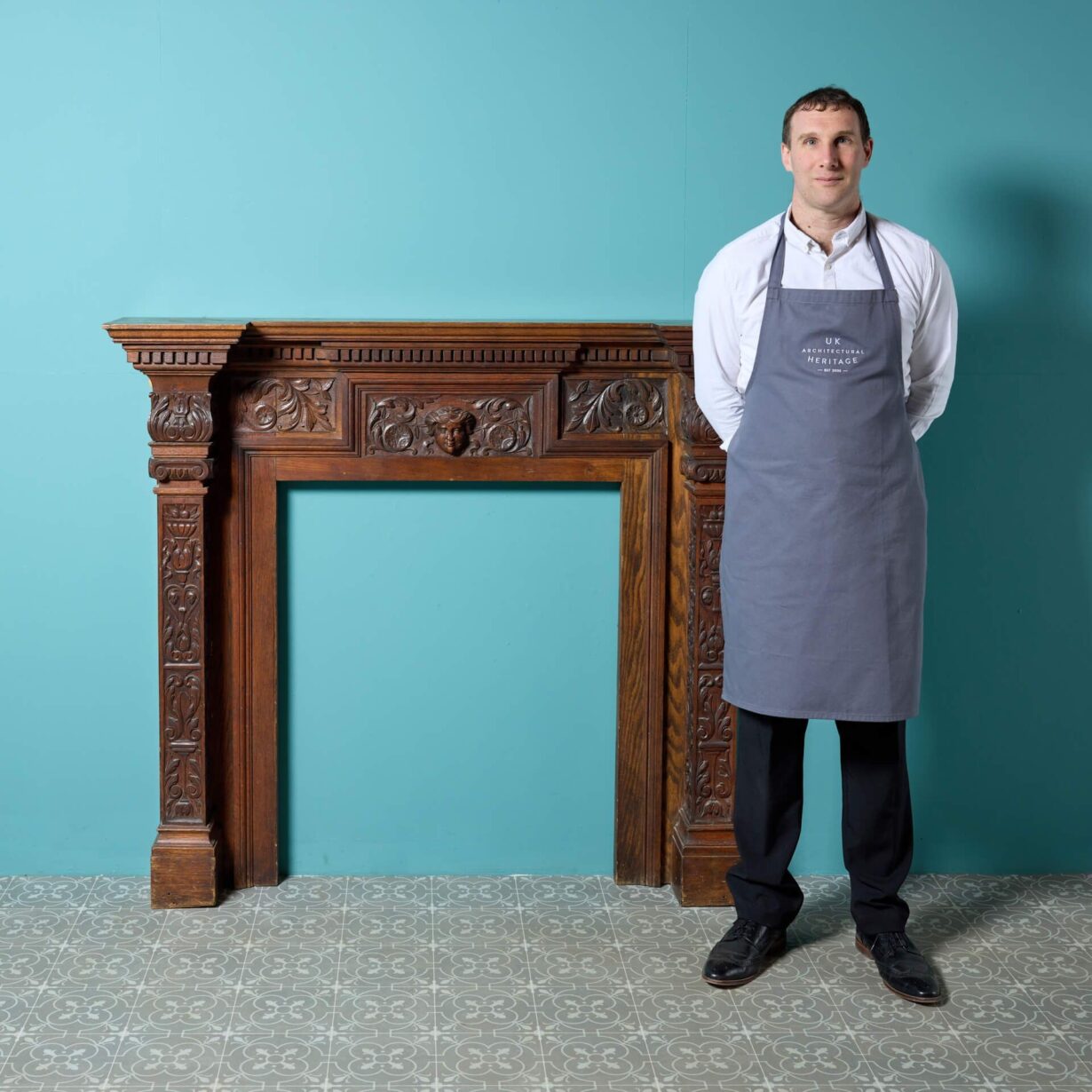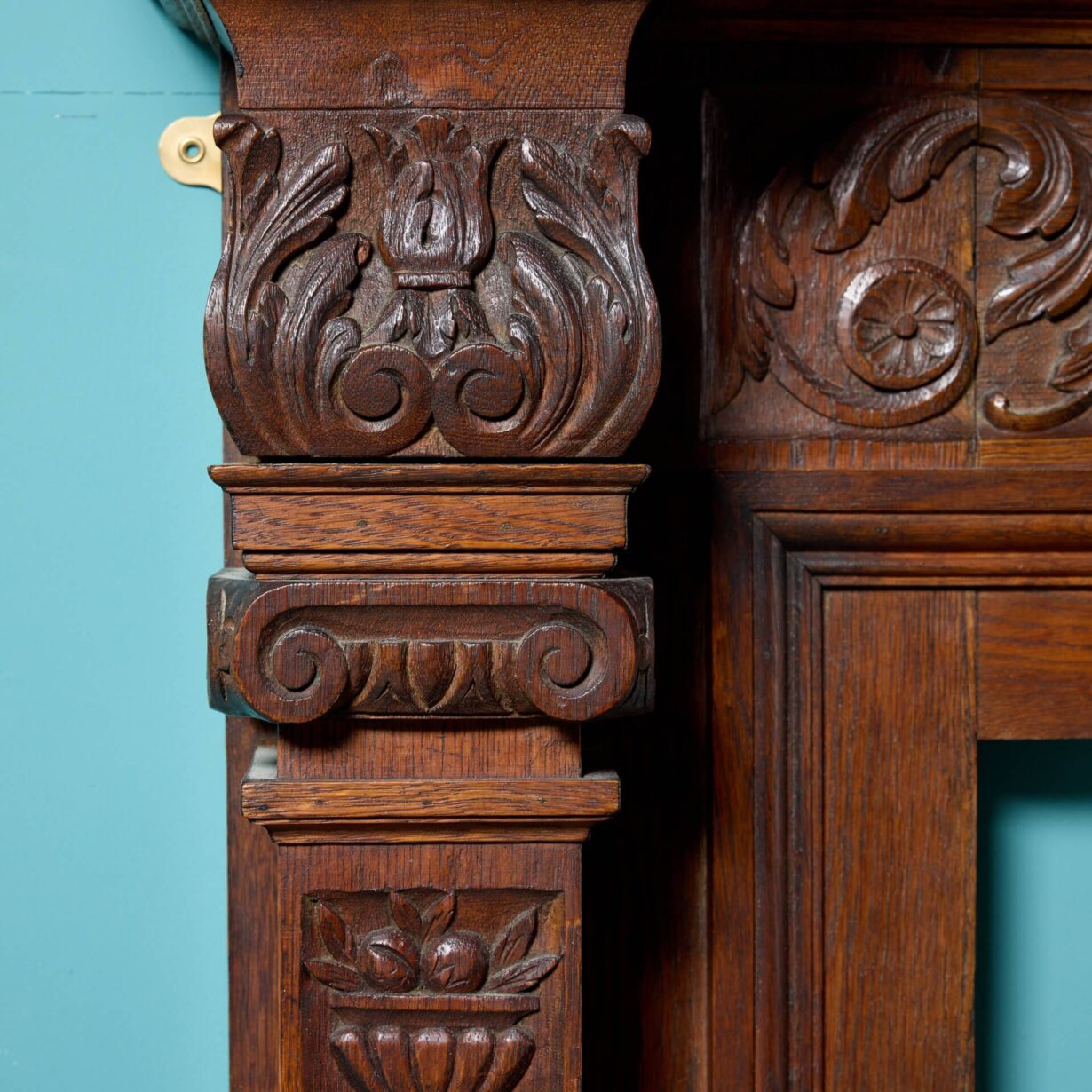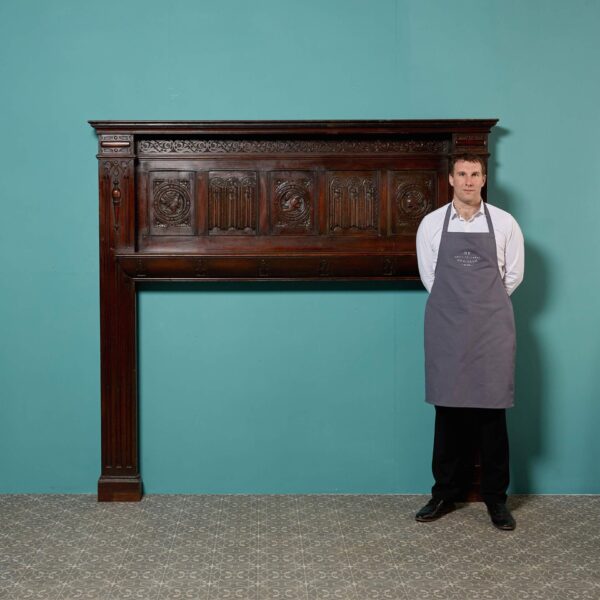 back to topA very heavy and beautifully hand carved solid English oak Jacobean style fireplace. This spectacularly detailed antique fire surround dates from the early 20th century but showcases influences of earlier Tudor and Jacobean styling, instilling it with an aged character. Look closely at the frieze and you’ll discover a carved female mask on the central tablet among scrolling foliage which continues onto each of square column jambs, carved with urns holding fruit. Ornate and highly detailed, this antique oak fireplace is certain to look impressive wherever it is situated.