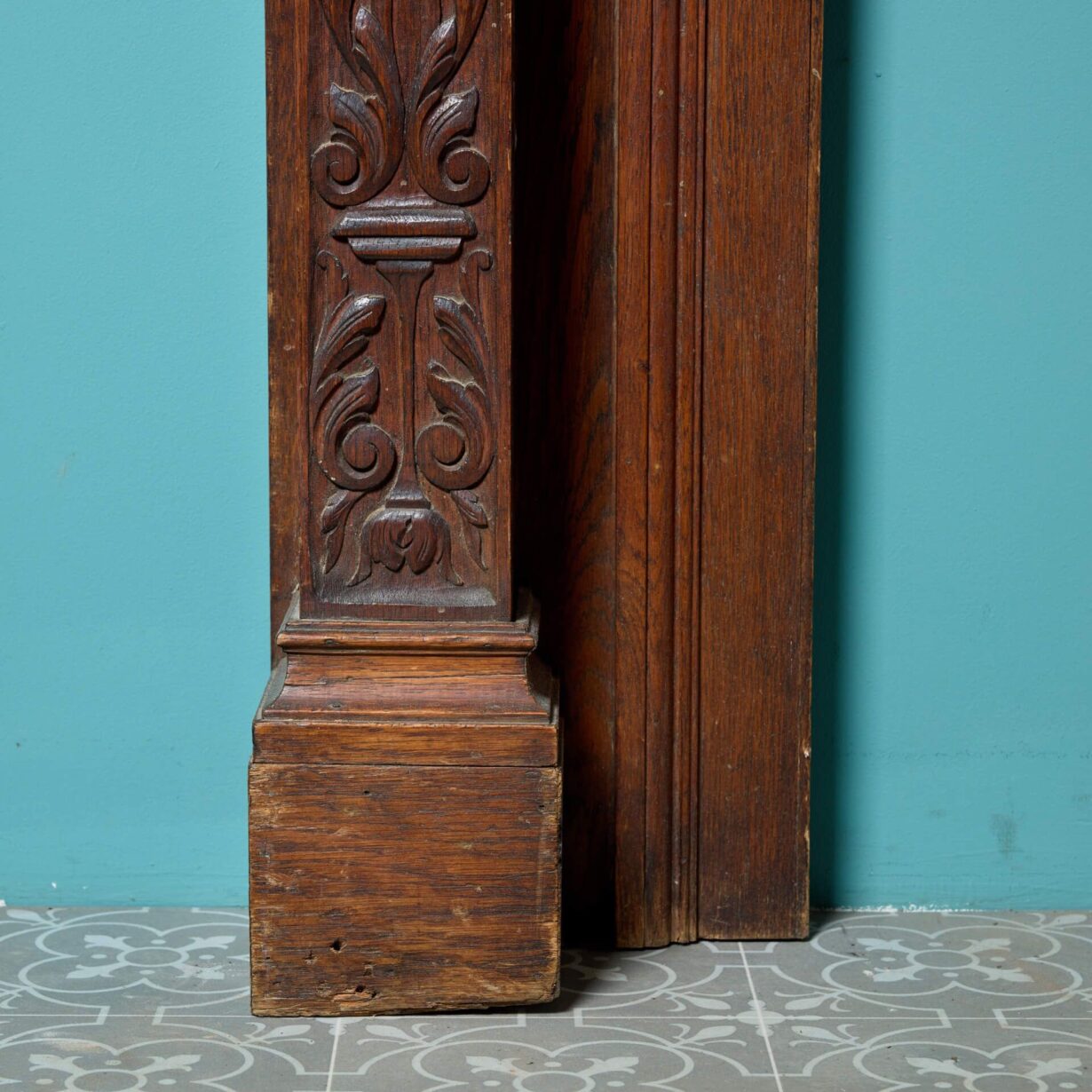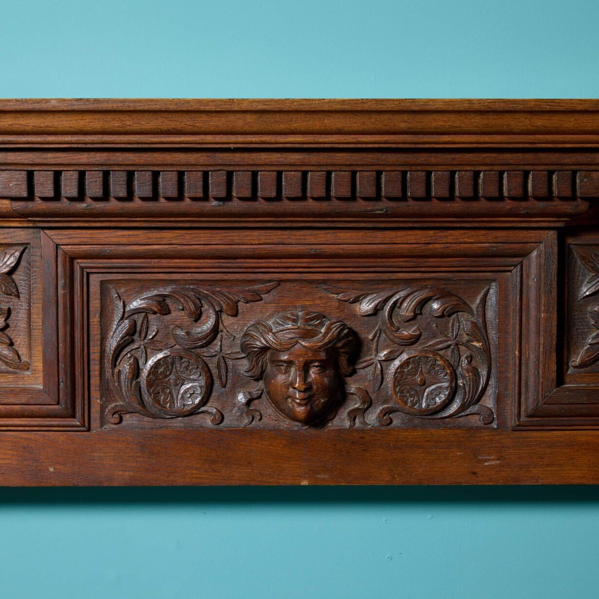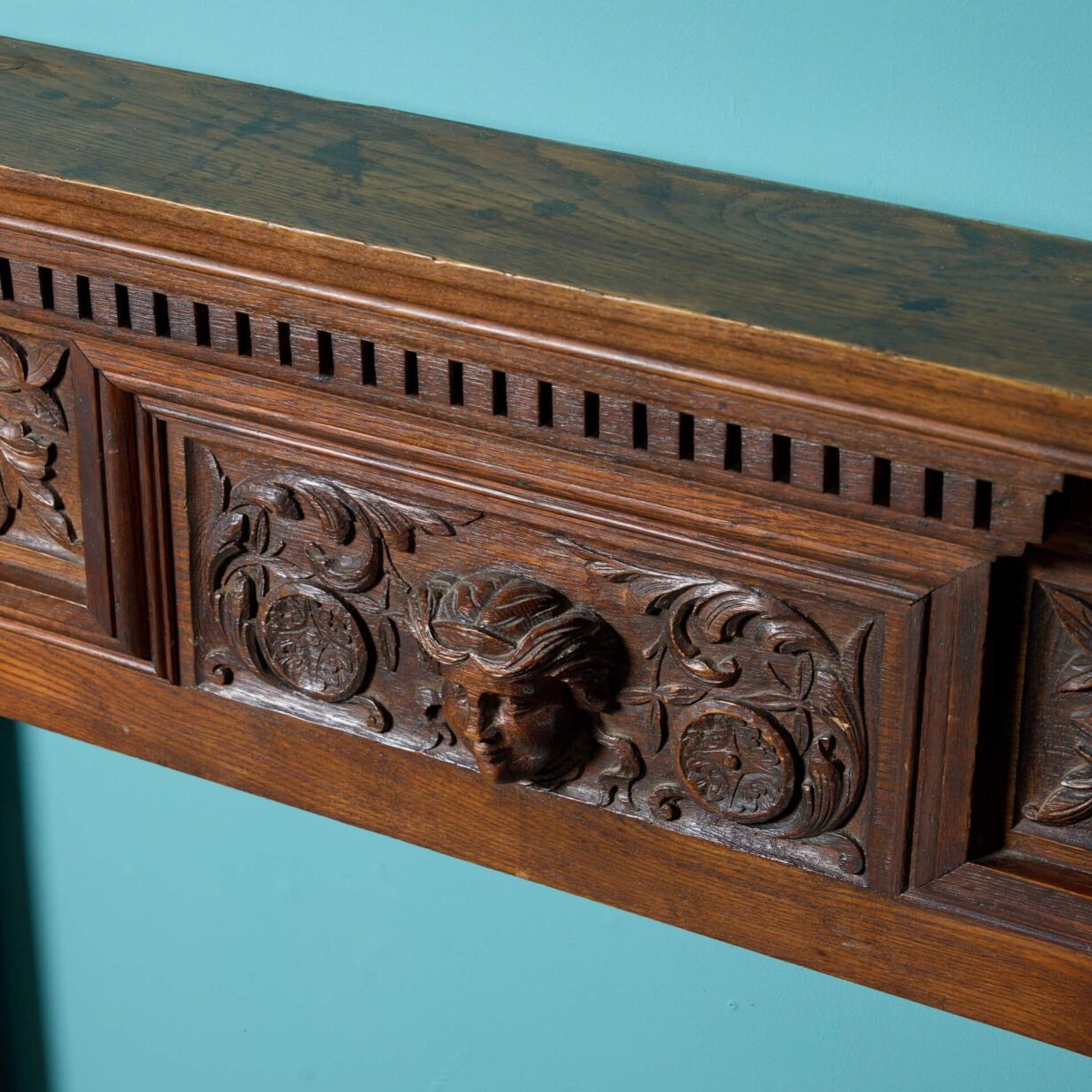 back to topA very heavy and beautifully hand carved solid English oak Jacobean style fireplace. This spectacularly detailed antique fire surround dates from the early 20th century but showcases influences of earlier Tudor and Jacobean styling, instilling it with an aged character. Look closely at the frieze and you’ll discover a carved female mask on the central tablet among scrolling foliage which continues onto each of square column jambs, carved with urns holding fruit. Ornate and highly detailed, this antique oak fireplace is certain to look impressive wherever it is situated.