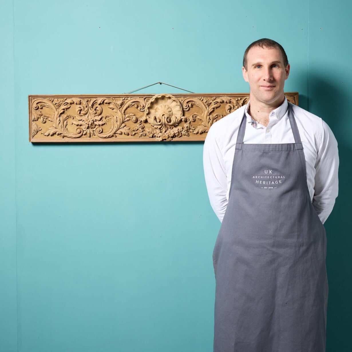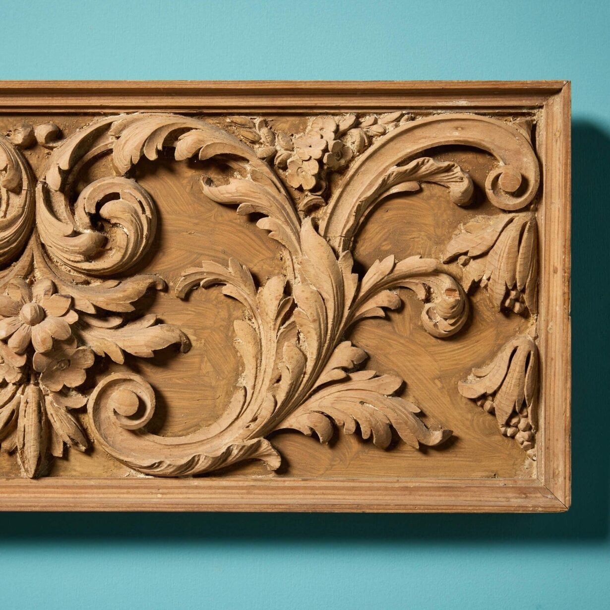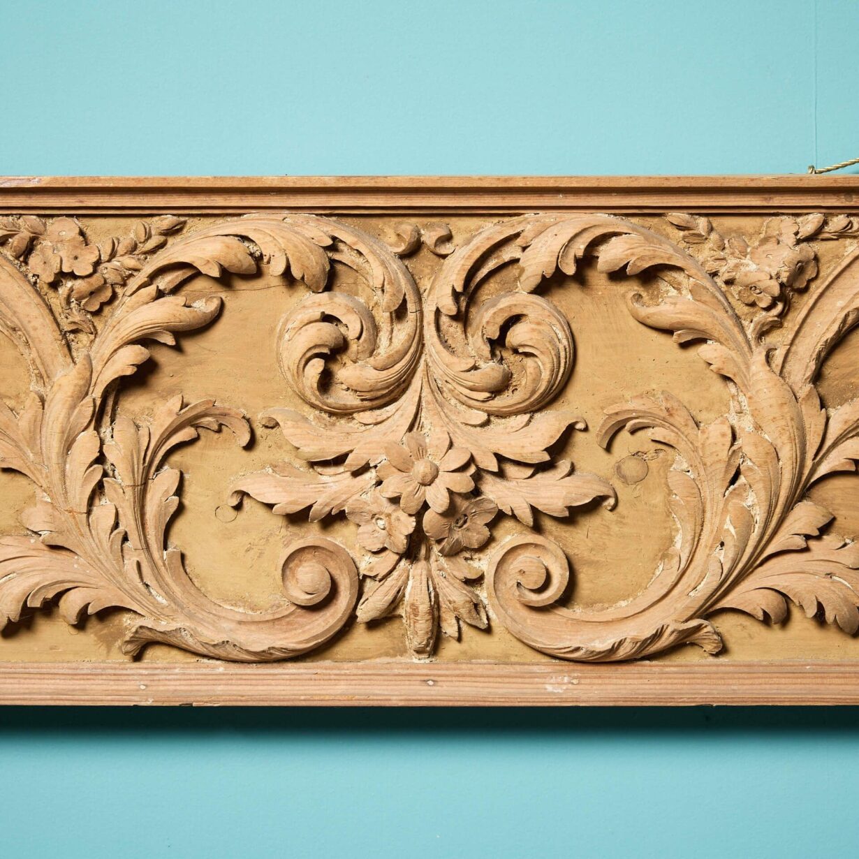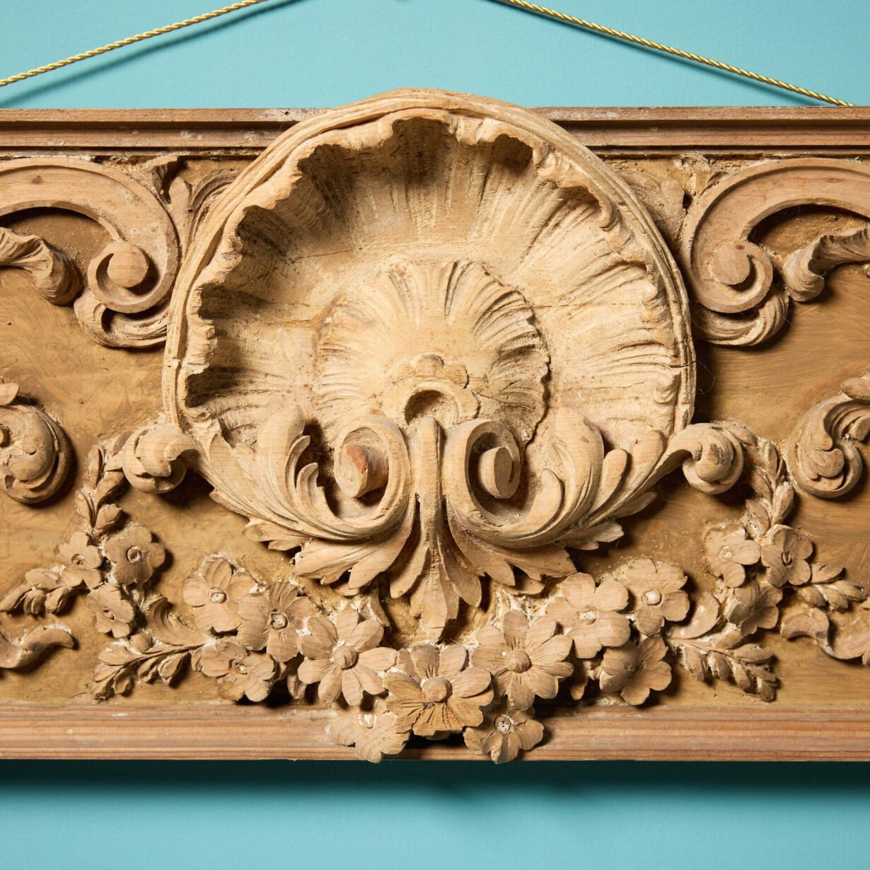back to topAn original Georgian architectural pine frieze panel c.1800, handcarved with scallop shell to the centre and scrolling foliage. Fitted with string for hanging, this antique frieze section is ready for wall mounting in an interior. It will look particularly striking above a sideboard or console where it’s fine intricacy and late 18th/early 19th century craftsmanship can be observed and admired.