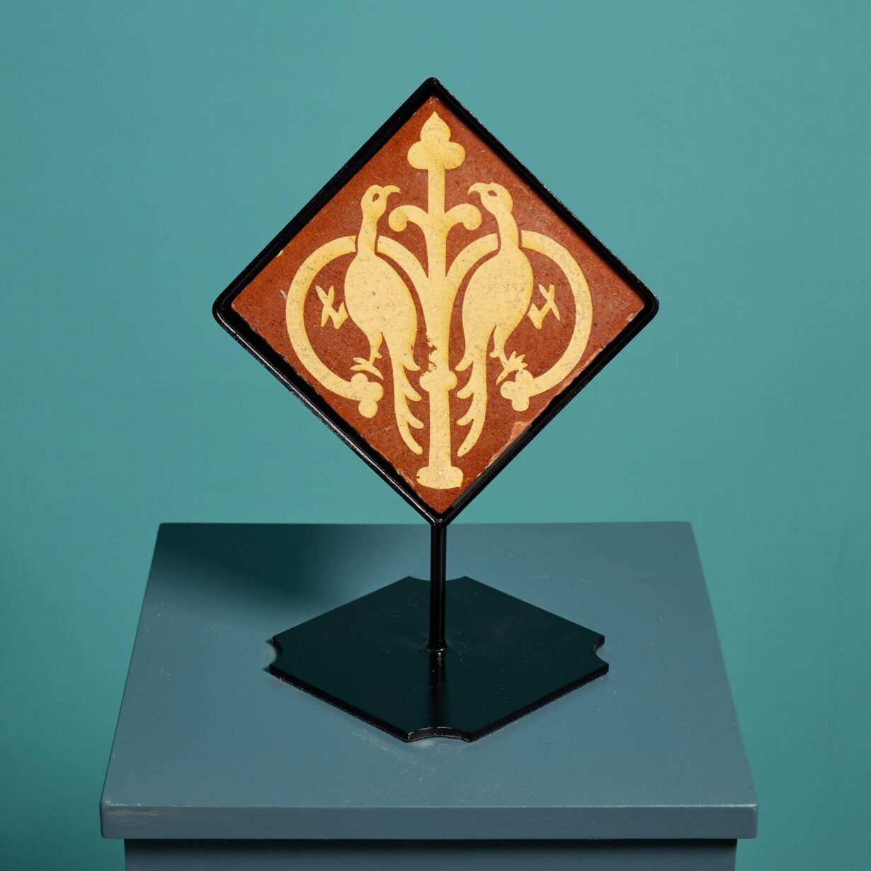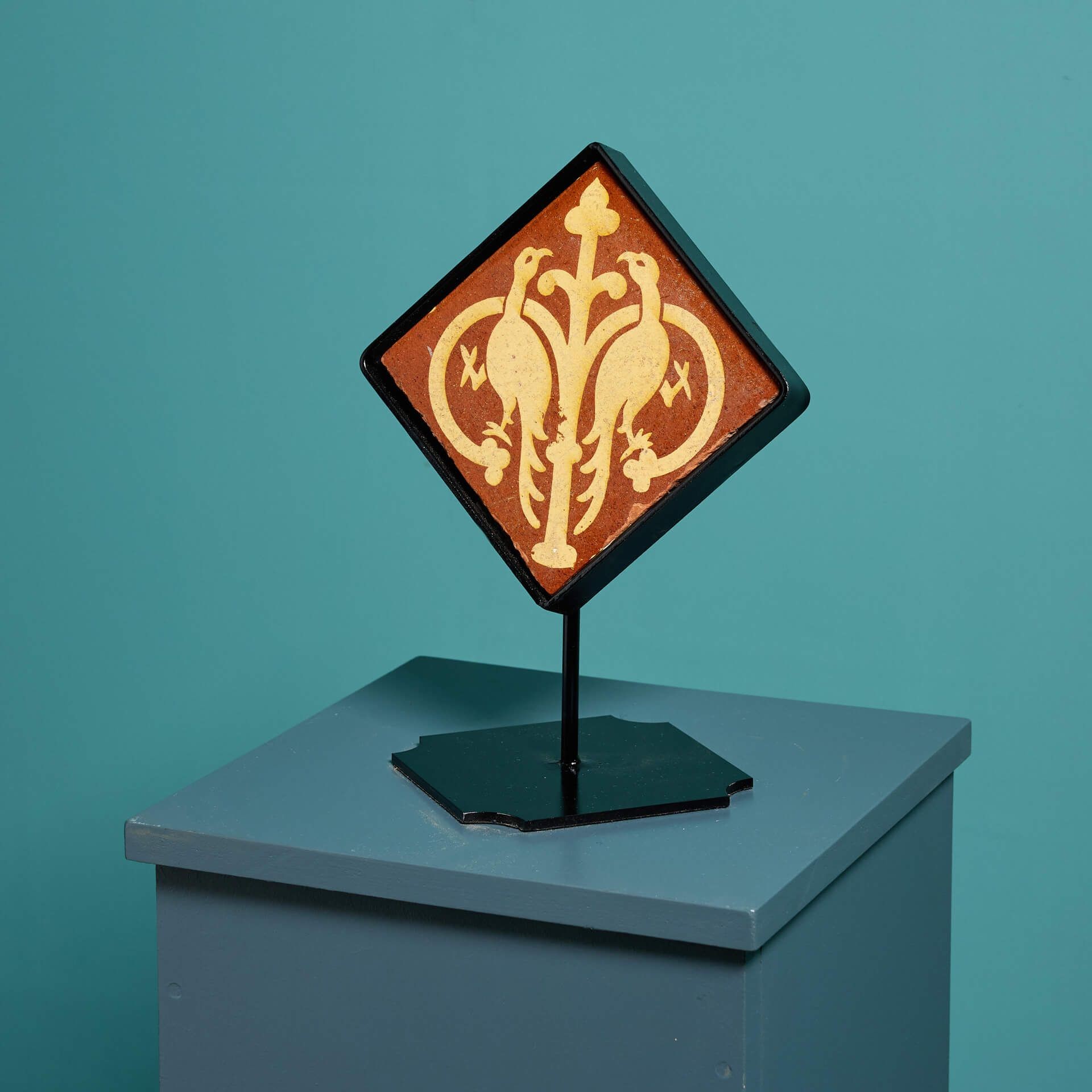 back to topA mid 19th century glazed encaustic floor tile by Chamberlain & Co (stamped) depicting a pair of entwined addorsed birds, likely pheasants.