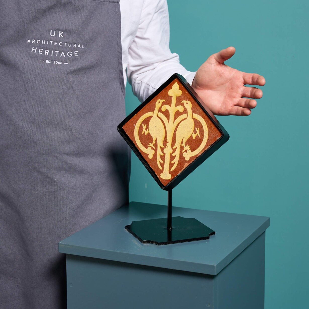 This 6-inch tile includes a bespoke steel stand as pictured, making a striking decorative interior piece or a welcome addition to an encaustic collector.