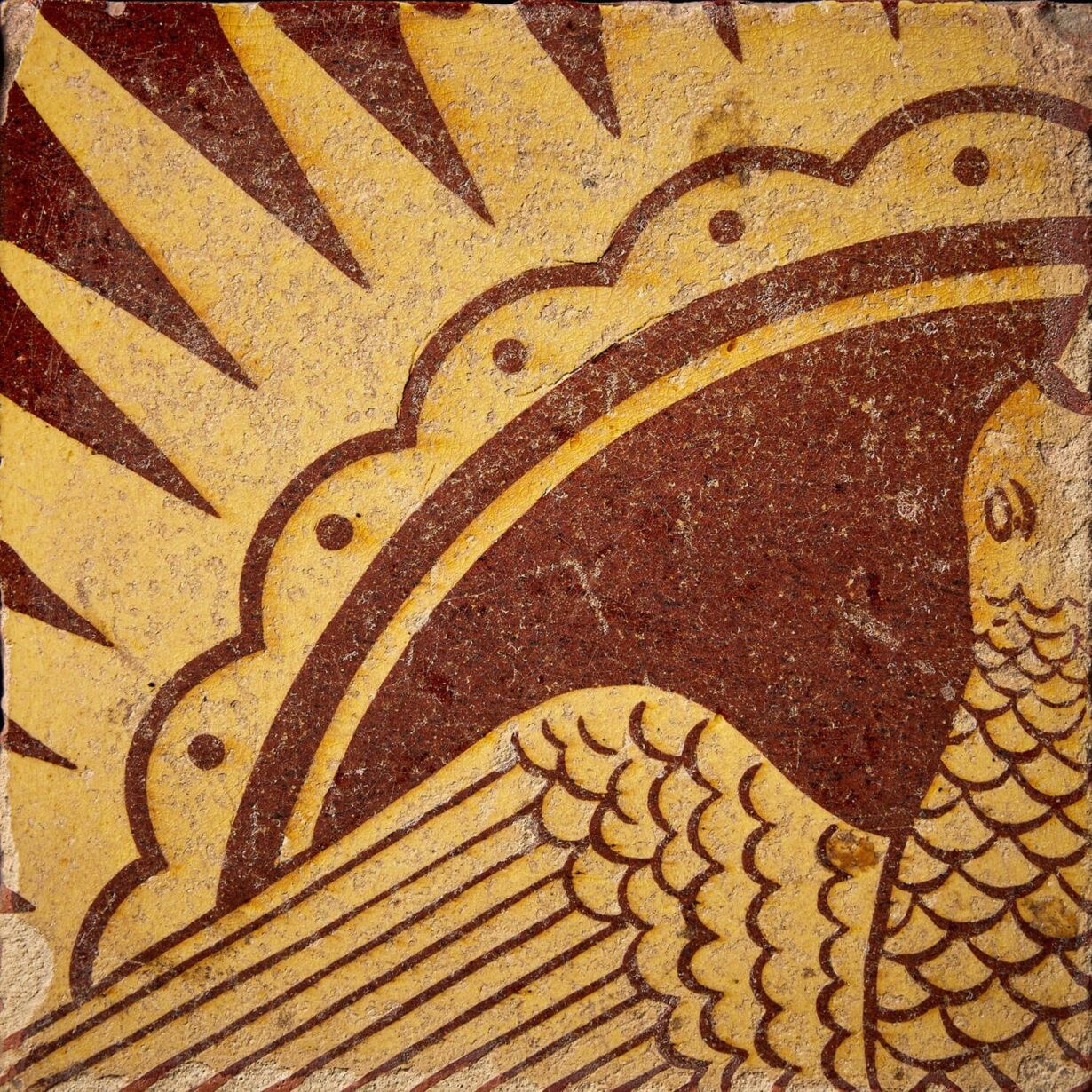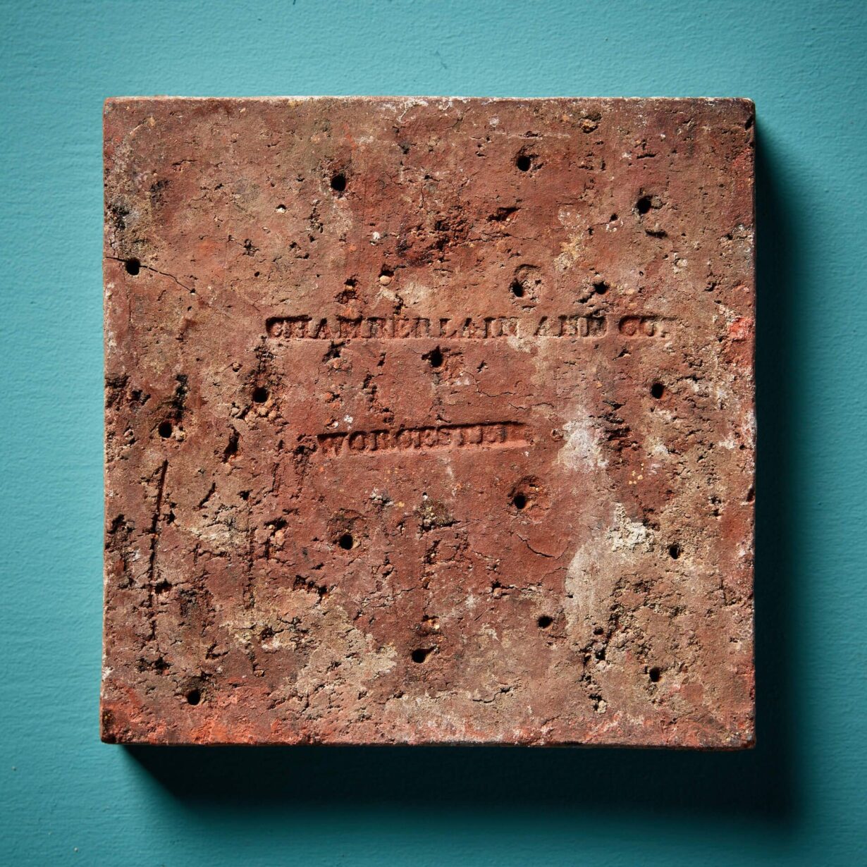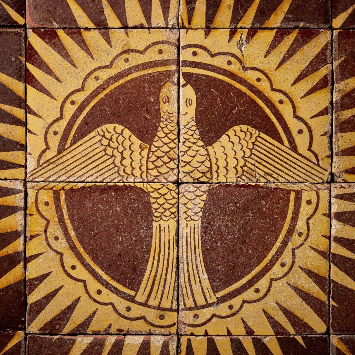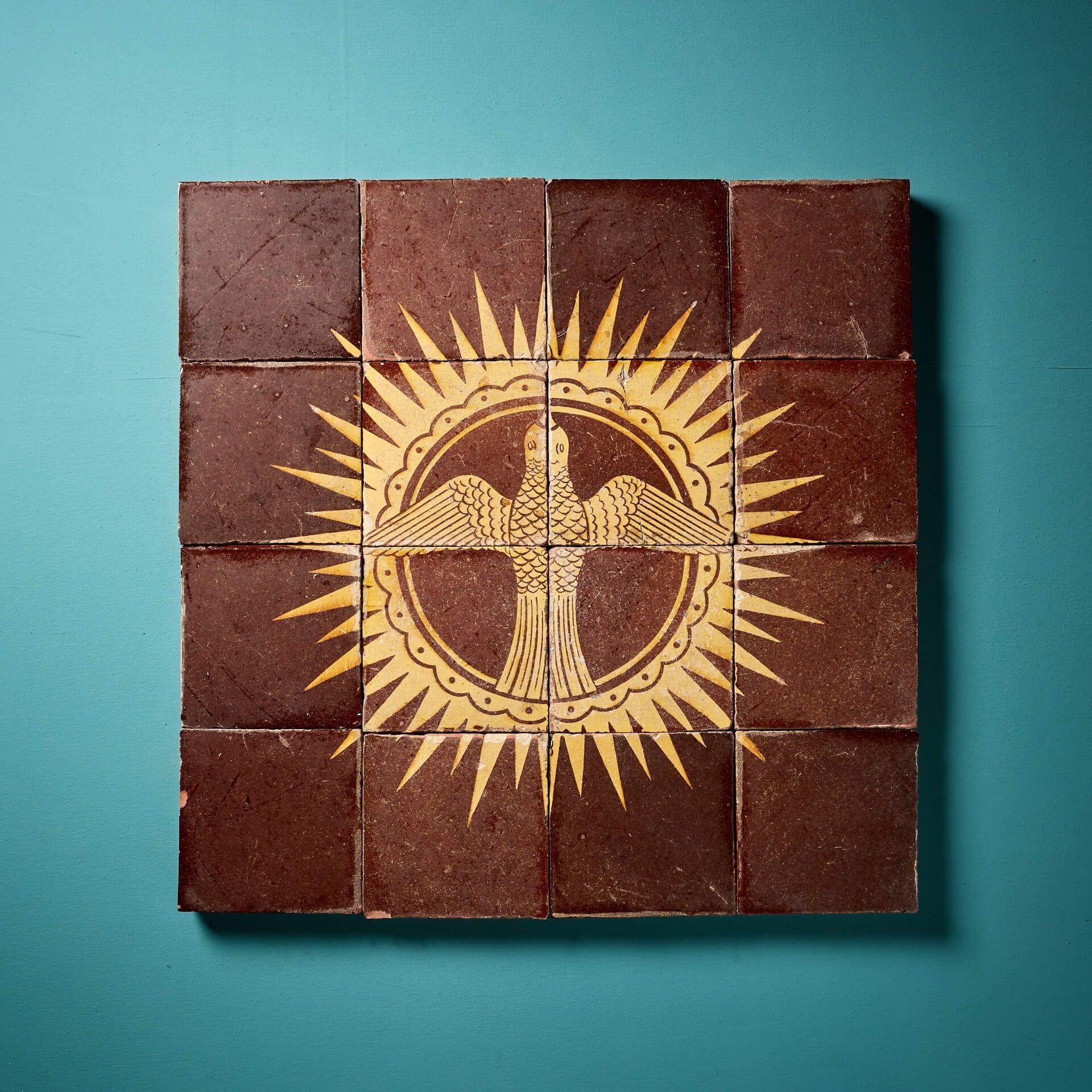 back to topA complete and incredibly rare mid 19th century decorative tile panel of a dove in starburst, made up of sixteen 6-inch glazed encaustic tiles by Chamberlain & Co (stamped). Likely unique, these reclaimed tiles date from circa 1850 and are in good condition for their age with only small chips and wear to the surface from previous use.