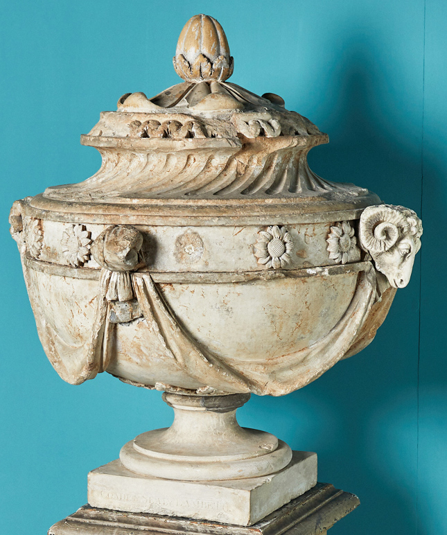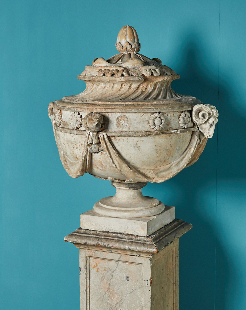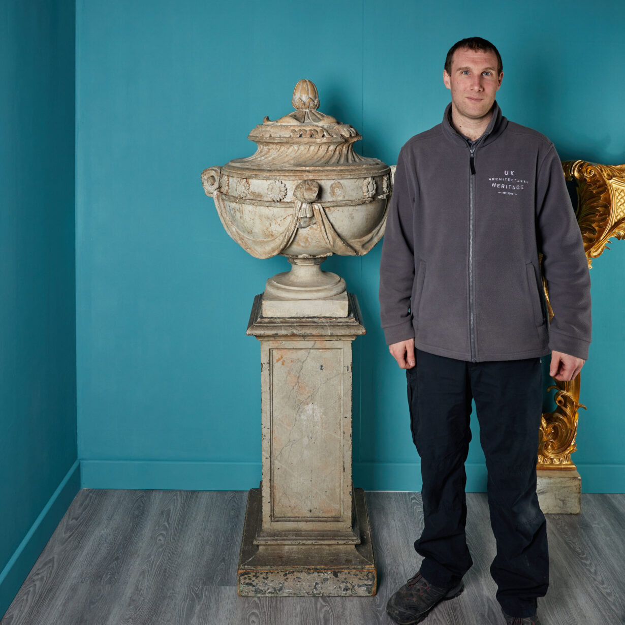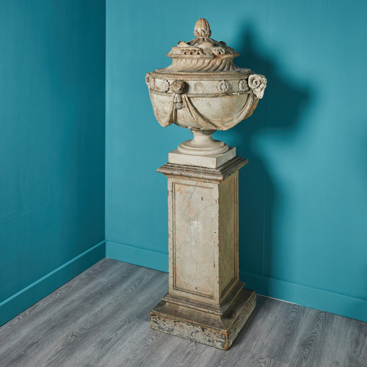 back to topCoade and Sealy Lidded Urn. The urn was manufactured by Coade & Sealy in the early 19th century. There is a COADE & SEALY LAMBETH stamp to the base, together with a mid-19th century simulated marble, painted pine pedestal.