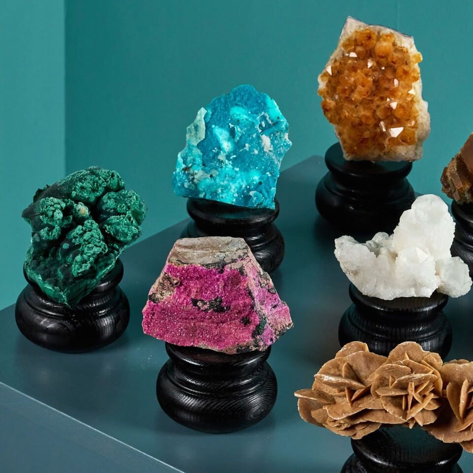 Highlights of the collection include a vibrant blue chrysocolla specimen originating from the Congo, the stone of wealth and wisdom citrine, and a large desert rose selecting crystal formation. Further details below: