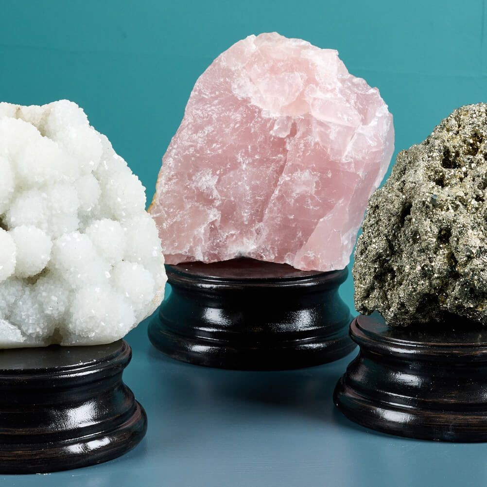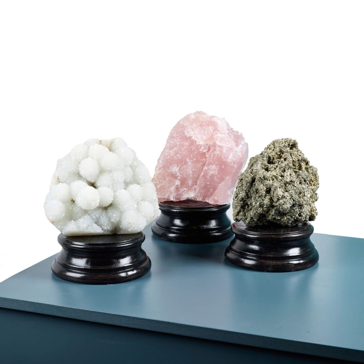 Each impressive cabinet specimen, including a Chalcedony, rose quartz, and pyrite, has its only striking form and finish complimenting one another.