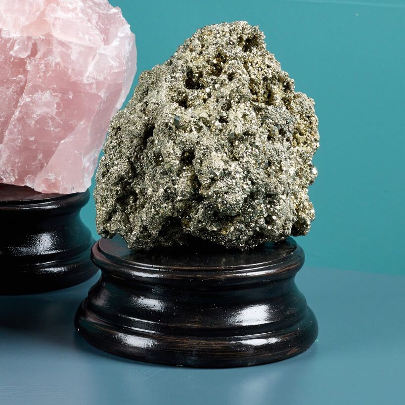 Naturally formed over millions of years, this striking mineral specimen showcases a distinctive golden colour, typical of pyrite, for which its metallic lustre is famously named ‘Fool’s Gold’.