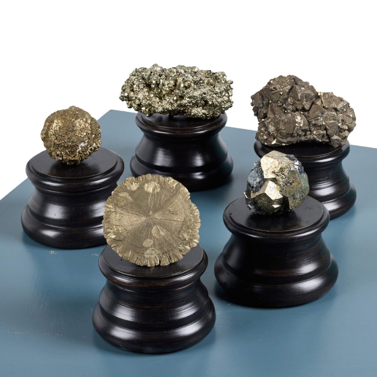 back to topA varied collection of 5 natural pyrite mineral specimens, each presented on an exclusive small wooden display base.