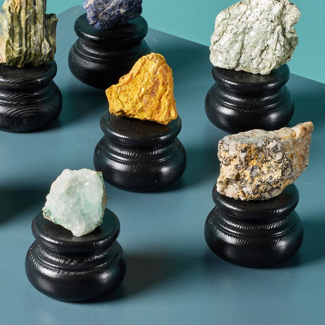 This impressive group of mineral specimens have been hand-selected from collections to create a unique set, ideal for use as natural sculpture in an interior. Arranged in any formation, they make striking small cabinet pieces for a collectors, showcasing wondrous specimens of natural history.