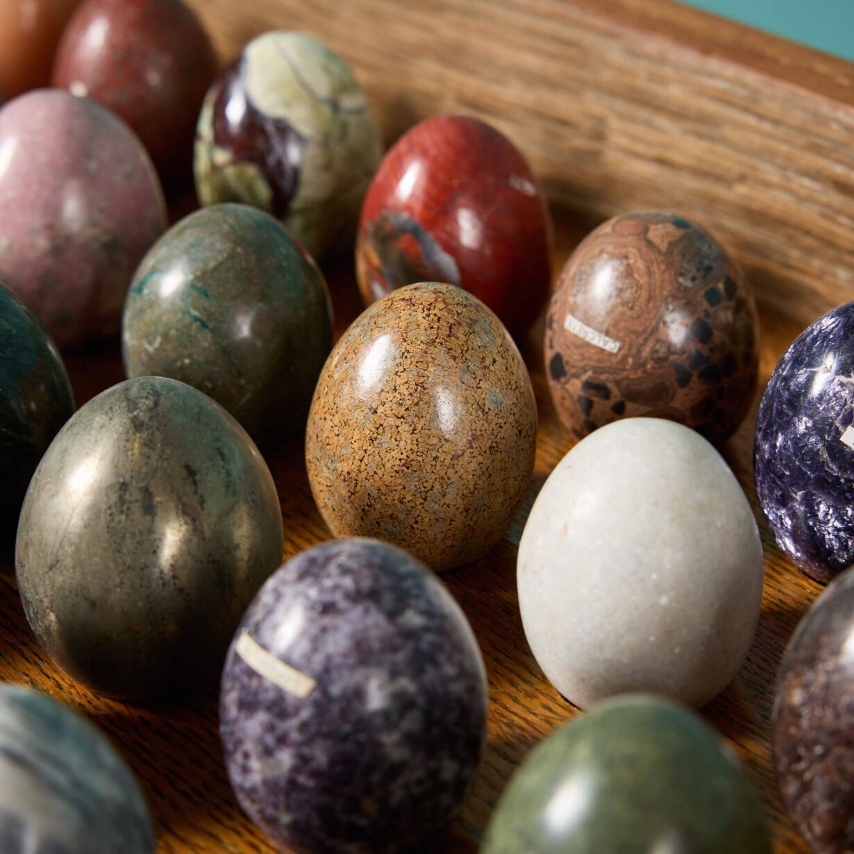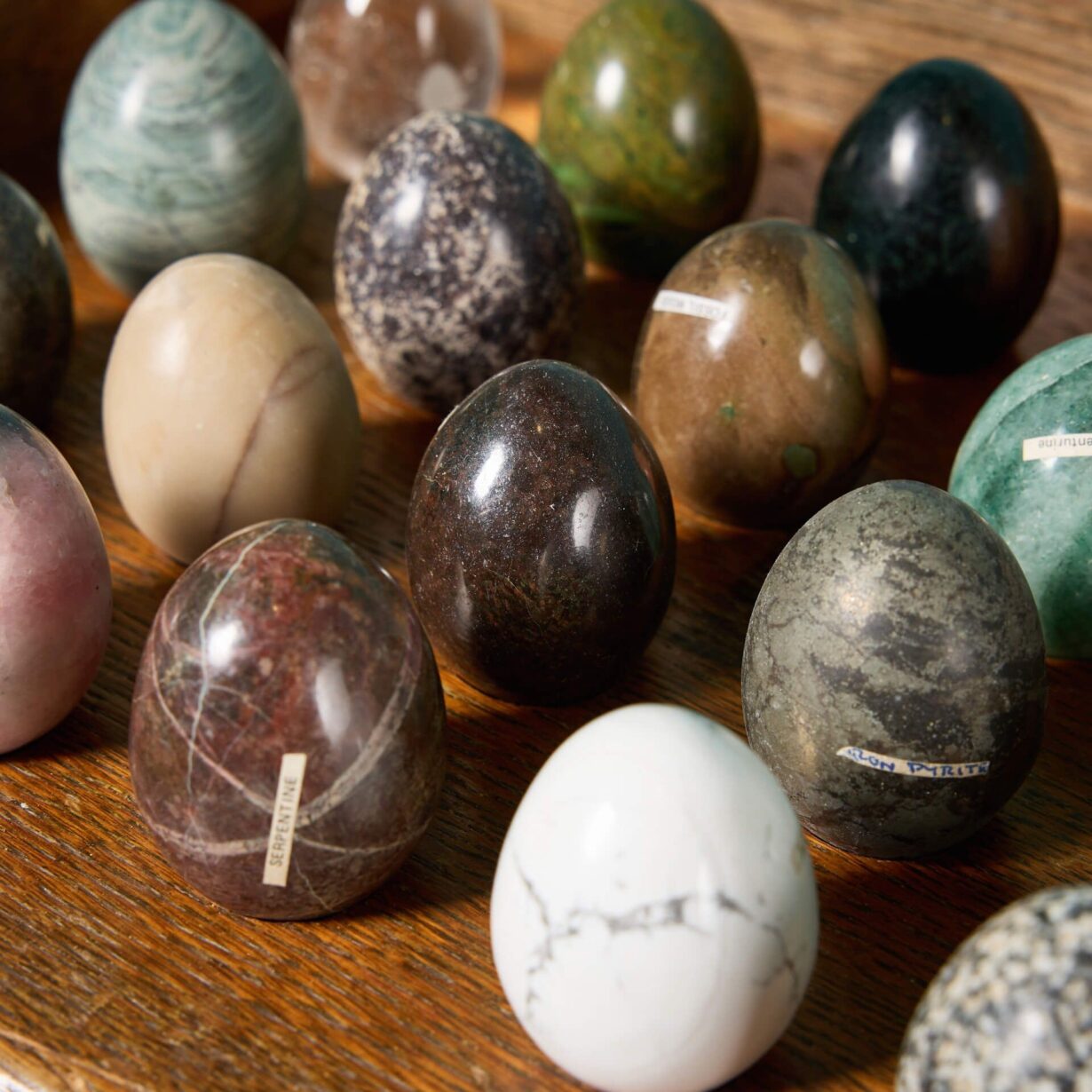 Displayed in an oak stand with round brass feet, these beautiful eggs include lepidolite, pyrite, calcrete, unakite, serpentine, calcite and optimin in various sizes loosely placed. Some have labels showing their names.