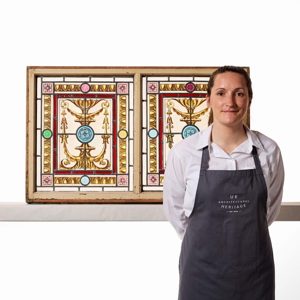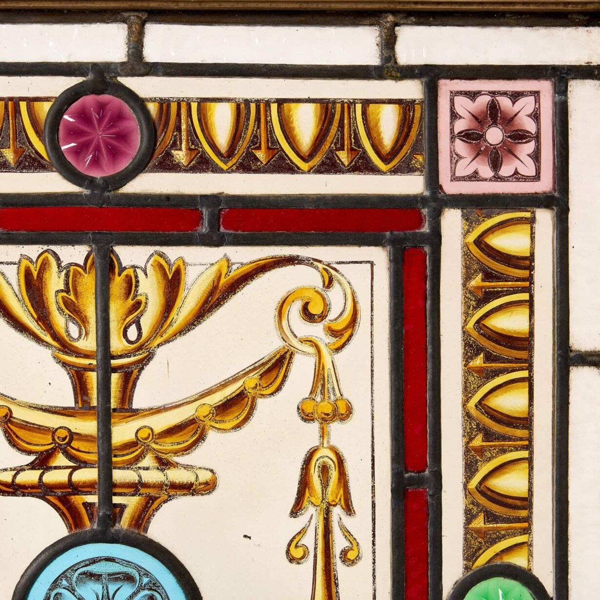 To the centre of each is a blue glass roundel, hand painted with a Tudor style rose, among golden garlands and foliage, instilling each window with a sense of grandeur. This sits within a gold rectangular border with a stylised egg and dart pattern among blue, yellow, pink and green roundels, cut and polished to give a faceted diamond-like appearance.