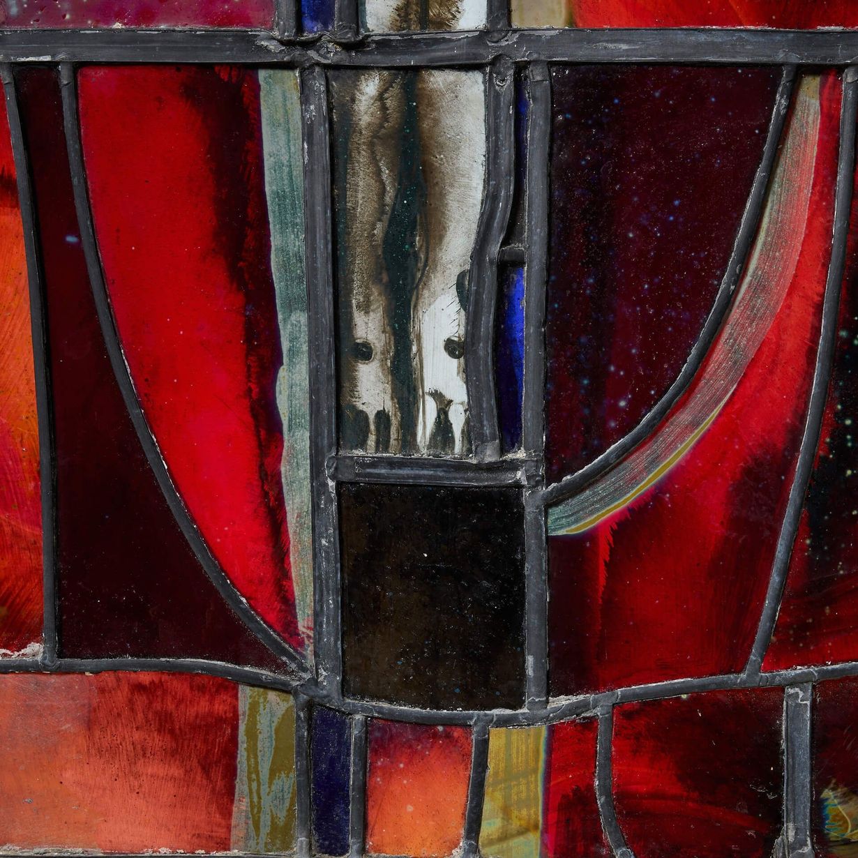 Unsigned, this impressive window is typical of Patrick Reyntien’s stained glass works, displaying fluid shapes and abstract forms across a diverse colour palette. With its abundance of red colours and large scale, it will make a stunning feature window in any property.
