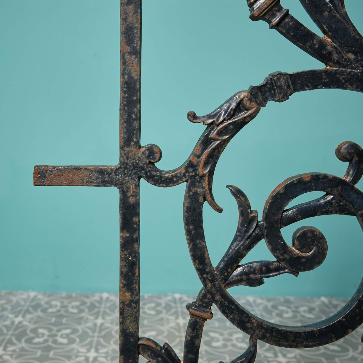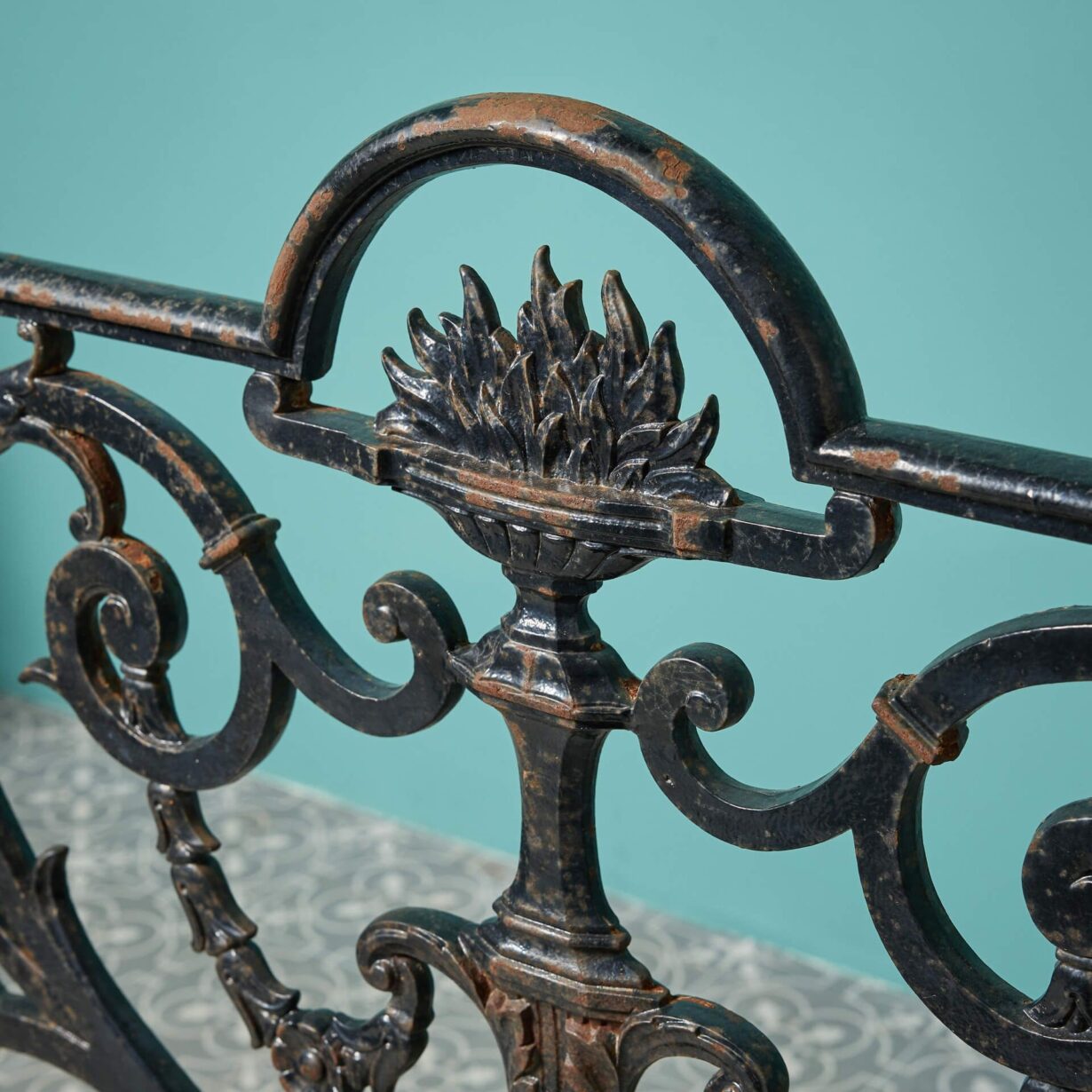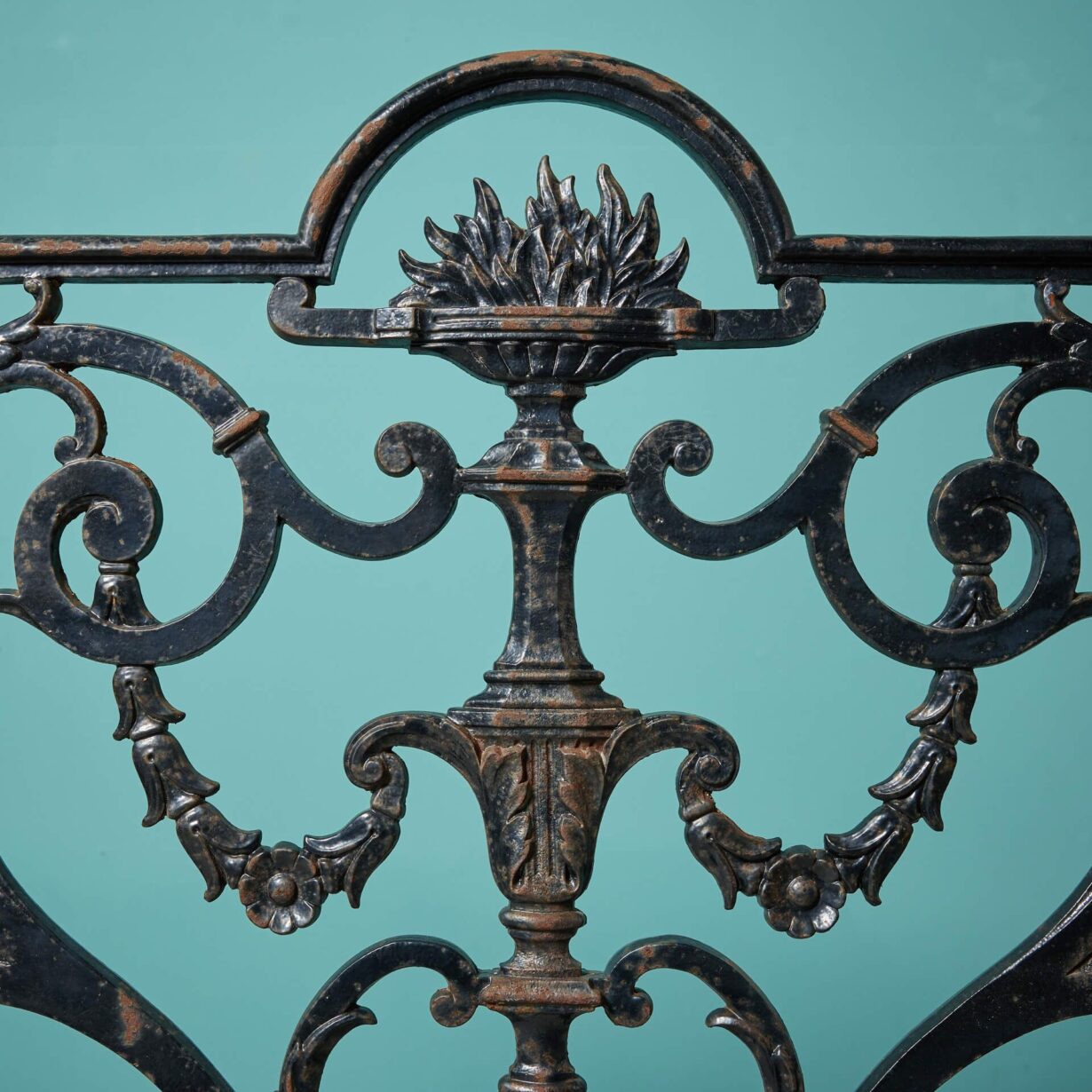 This 19th century iron panel is ornately cast with a torchiere finial to the centre and scrolling foliage to either side. Having stood the test of time for more than 135 years, this antique cast iron railing panel is a piece of reclaimed history for your property, looking beautiful as part of a traditional English garden scheme or a heritage feature of a modern home.
