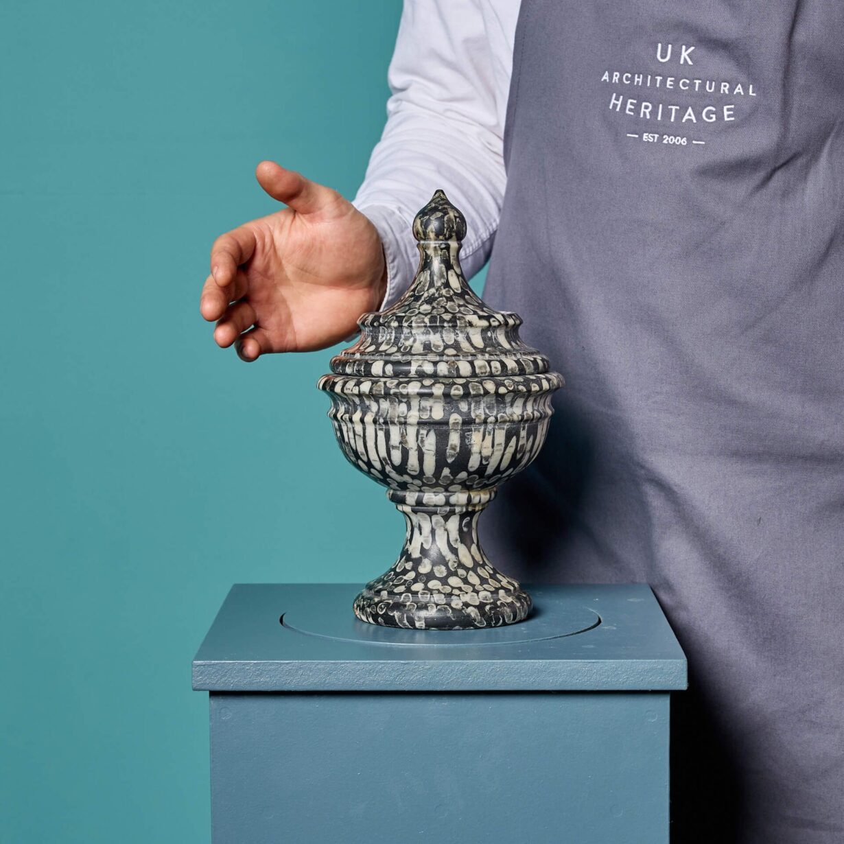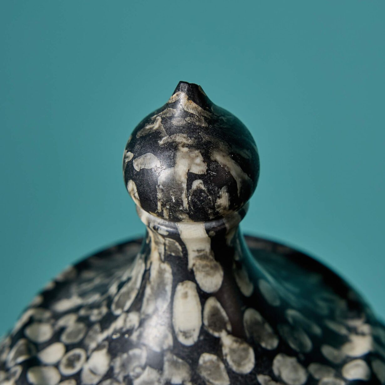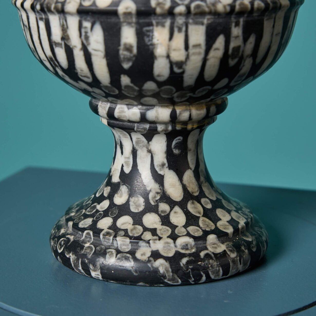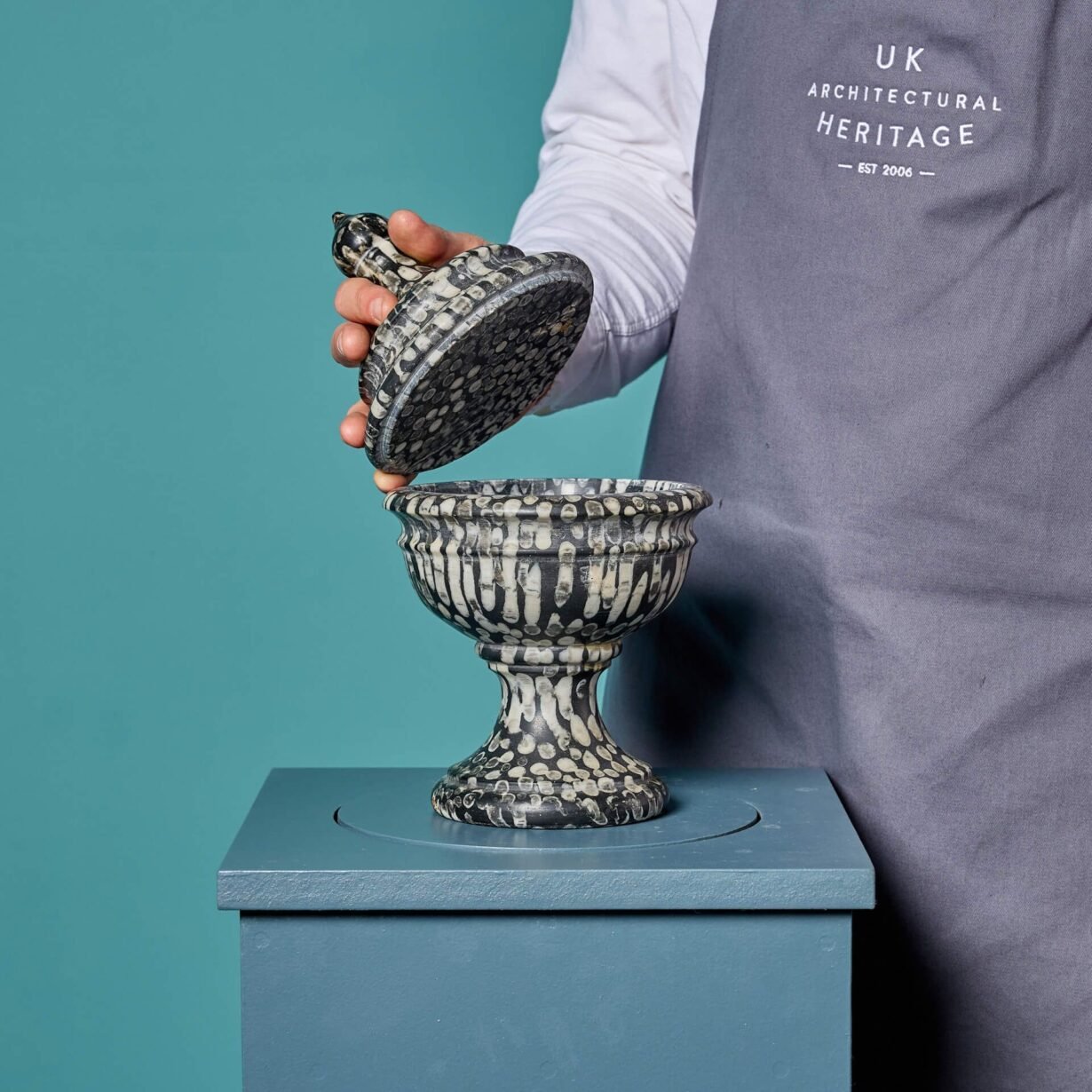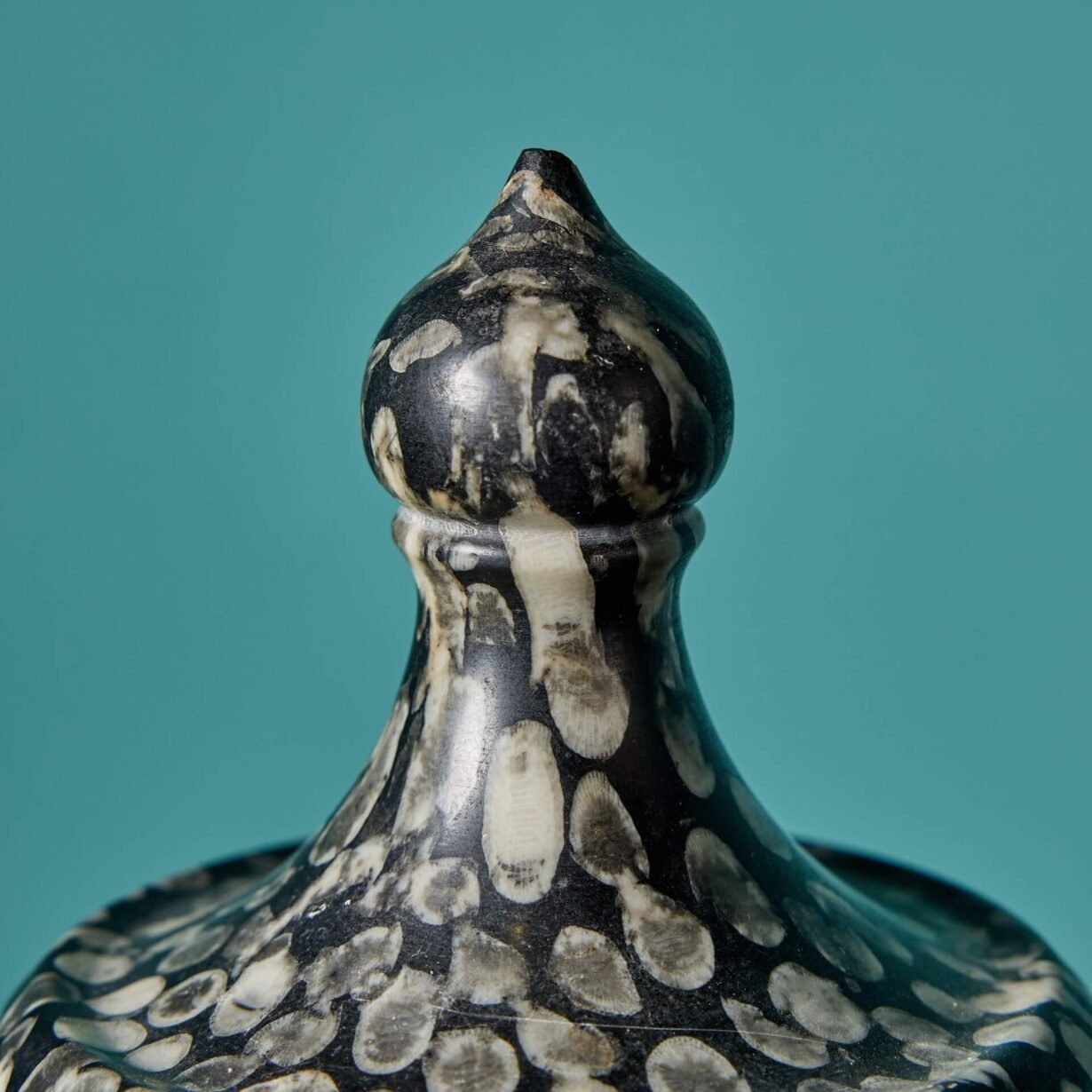 Resembling marble, this urn is made from natural Orthoceras. Orthoceras is known for its black or grey colour, usually with straight conical shells, which for the purpose of this urn have been used to create a unique pattern that appears evenly spaced and runs in the same direction.