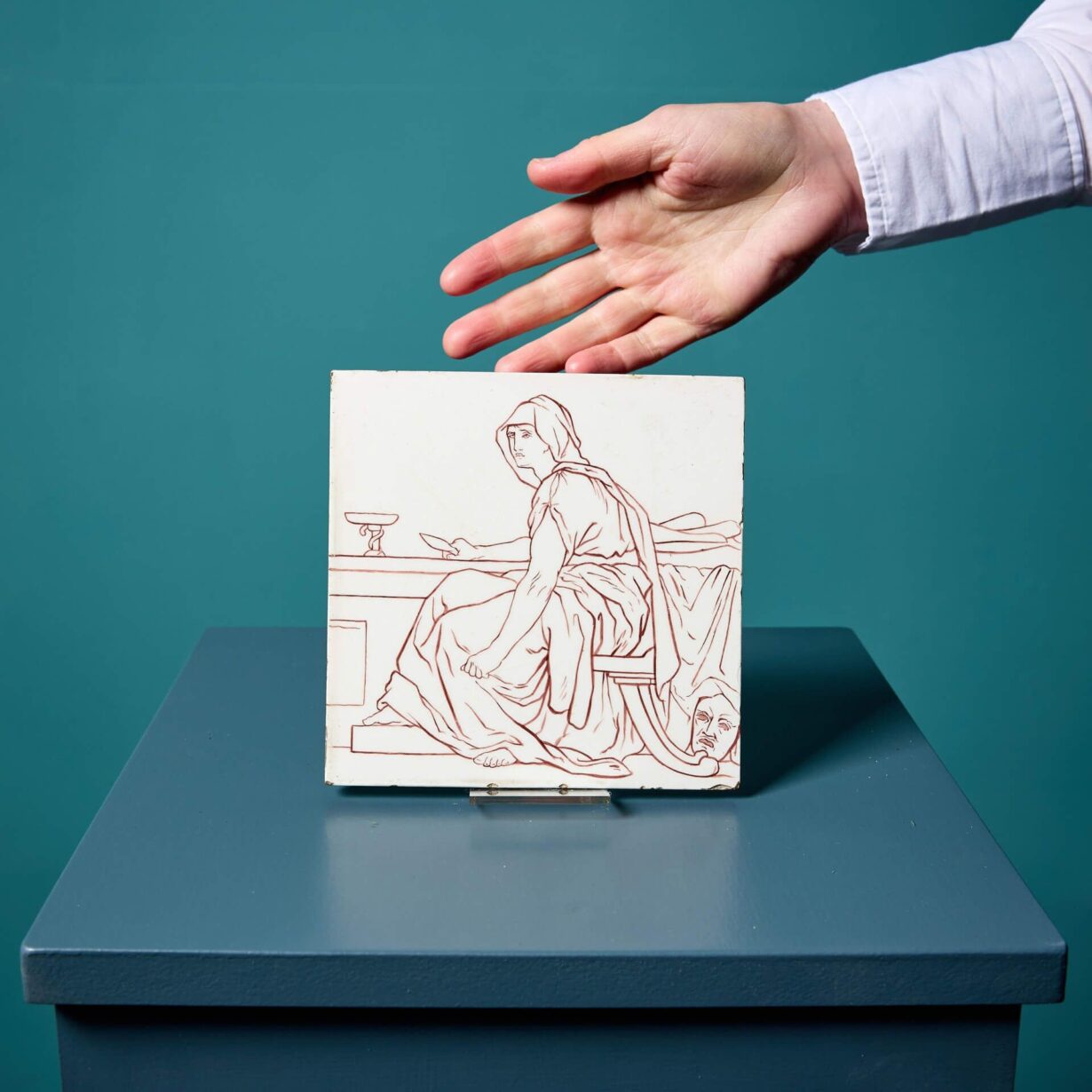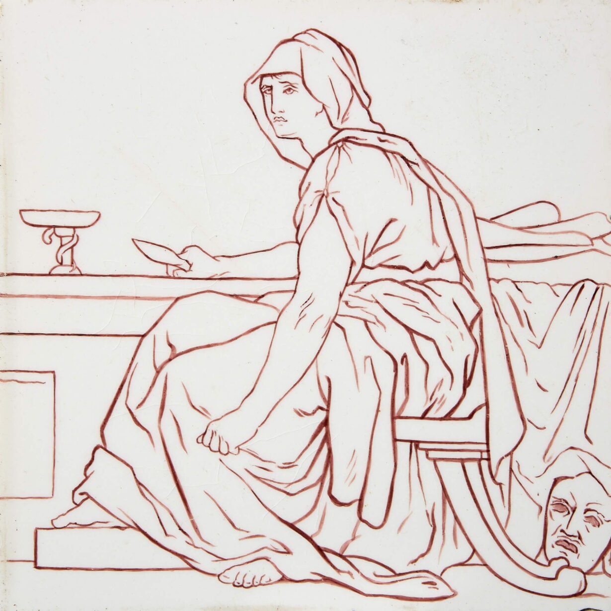 back to topA rare antique 6-inch glazed tile by Doulton and Co. of Lambeth (stamped) depicting a hooded neoclassical figure symbolising Tragedy.