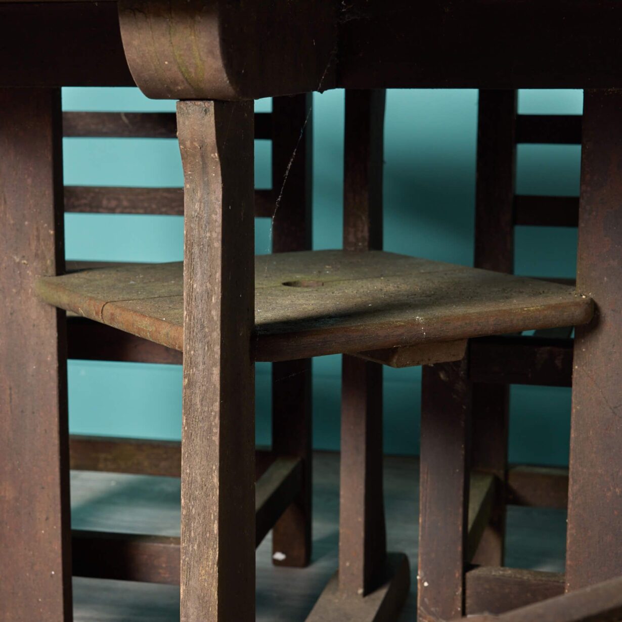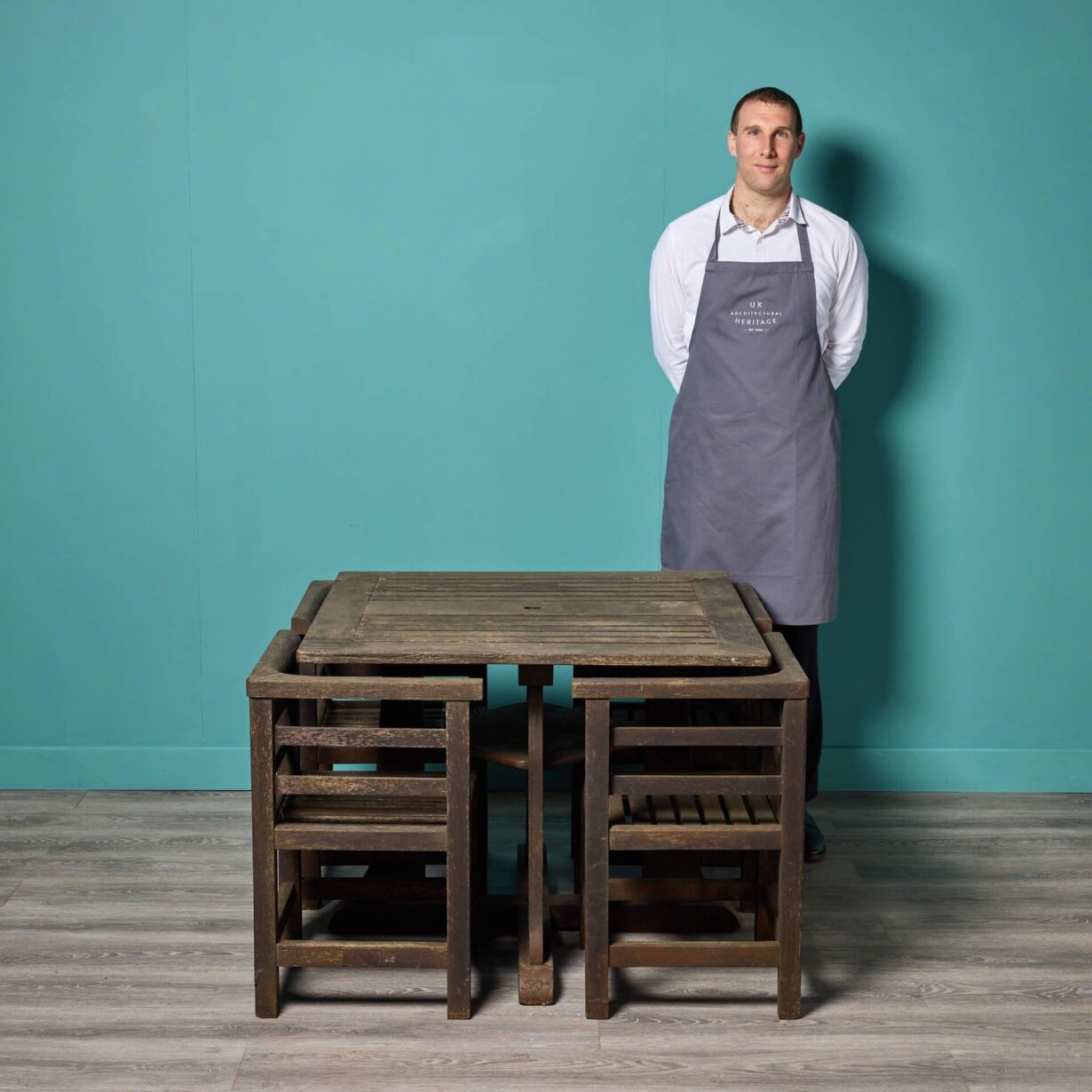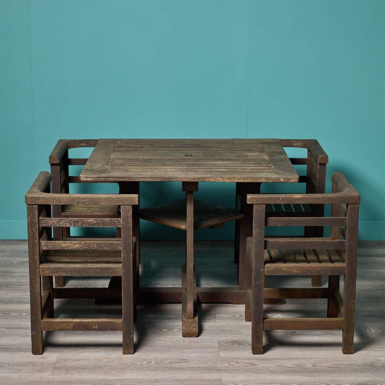 back to topA complete early 20th century garden dining table and four chairs made from teak taken from reclaimed war ships, attributed to Heals of London. This functional teak garden dining set is innovatively designed; the four chairs tucking perfectly beneath the tabletop when not in use.