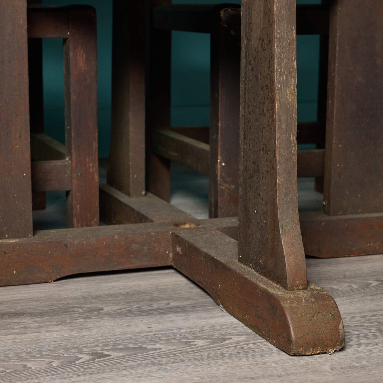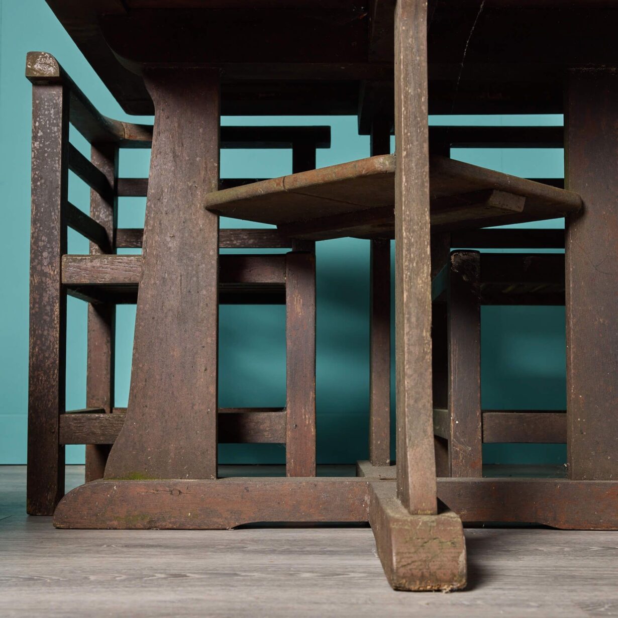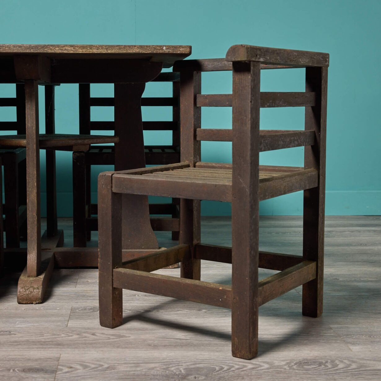 back to topA complete early 20th century garden dining table and four chairs made from teak taken from reclaimed war ships, attributed to Heals of London. This functional teak garden dining set is innovatively designed; the four chairs tucking perfectly beneath the tabletop when not in use.