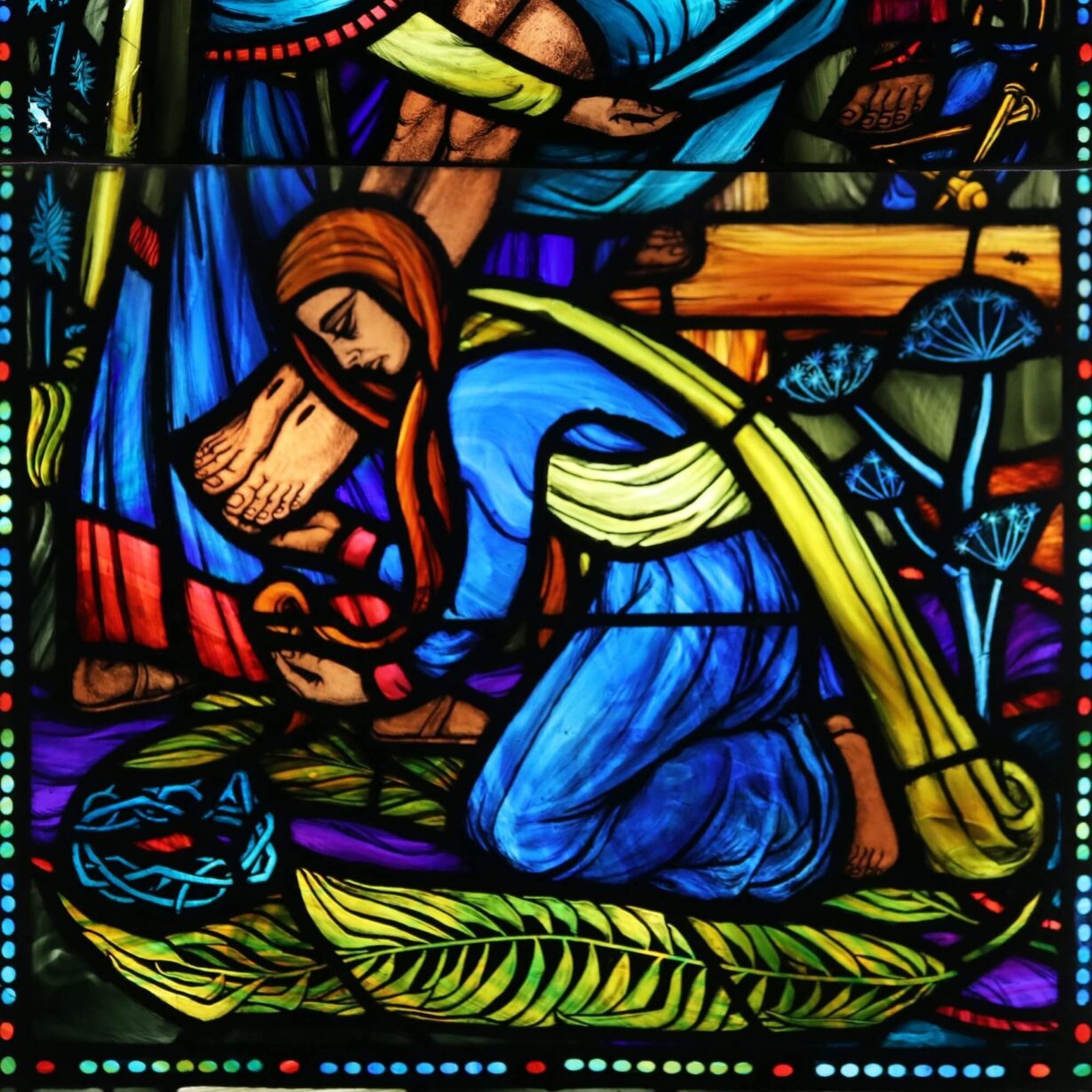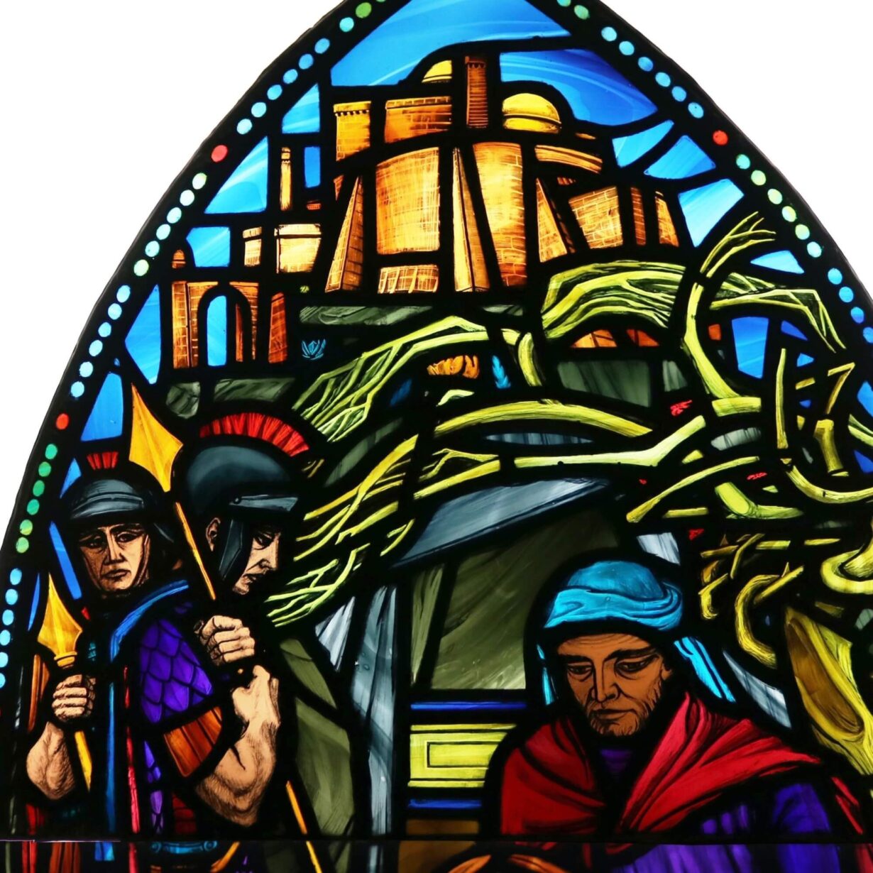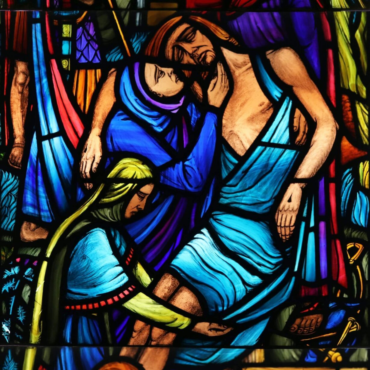 back to topA vibrant ecclesiastical stained glass window depicting a religious scene dating from the mid 20th century. This beautiful stained glass window is one of four we are offering for sale, originally installed at the former parish church in Glenlivet, Scotland. It details a Christian scene in bold and vibrant colours in a modern depiction of Jesus being laid in the tomb.
