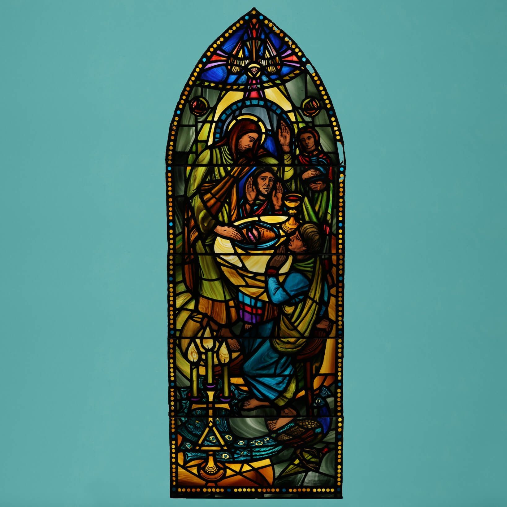 back to topA vibrant ecclesiastical stained glass window depicting a religious scene dating from the mid 20th century. This beautiful stained glass window is one of four we are offering for sale, originally installed at the former parish church in Glenlivet, Scotland. It details a Christian scene in bold and vibrant colours in a modern depiction of the first communion.