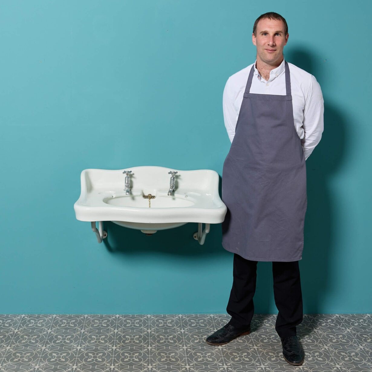 back to topA very large scale Edwardian 1920s ceramic sink with two enamelled cast iron brackets ready for wall mounting.