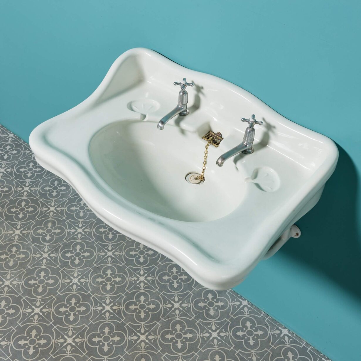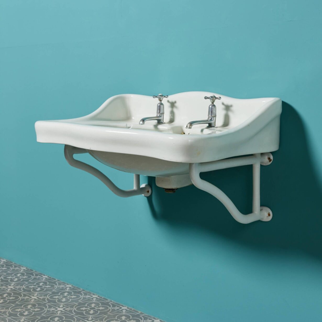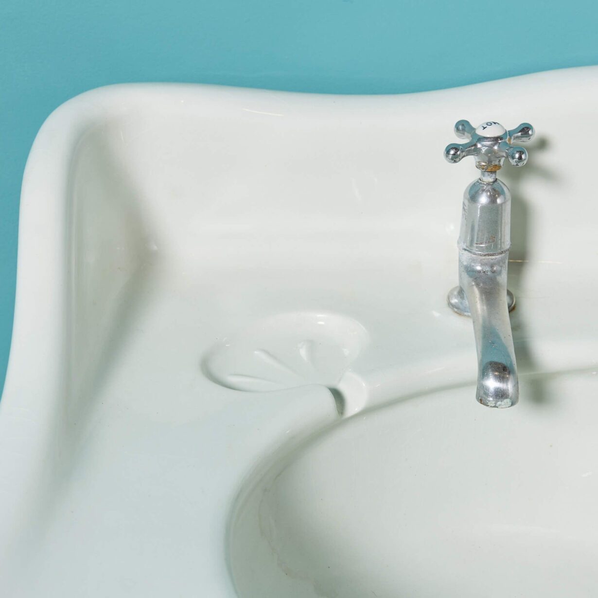 With its sweeping backsplash and rounded corners, this antique washbasin offers a pleasing design to suit many styles of bathroom. Features include original taps and two dainty oval shaped soap dishes.