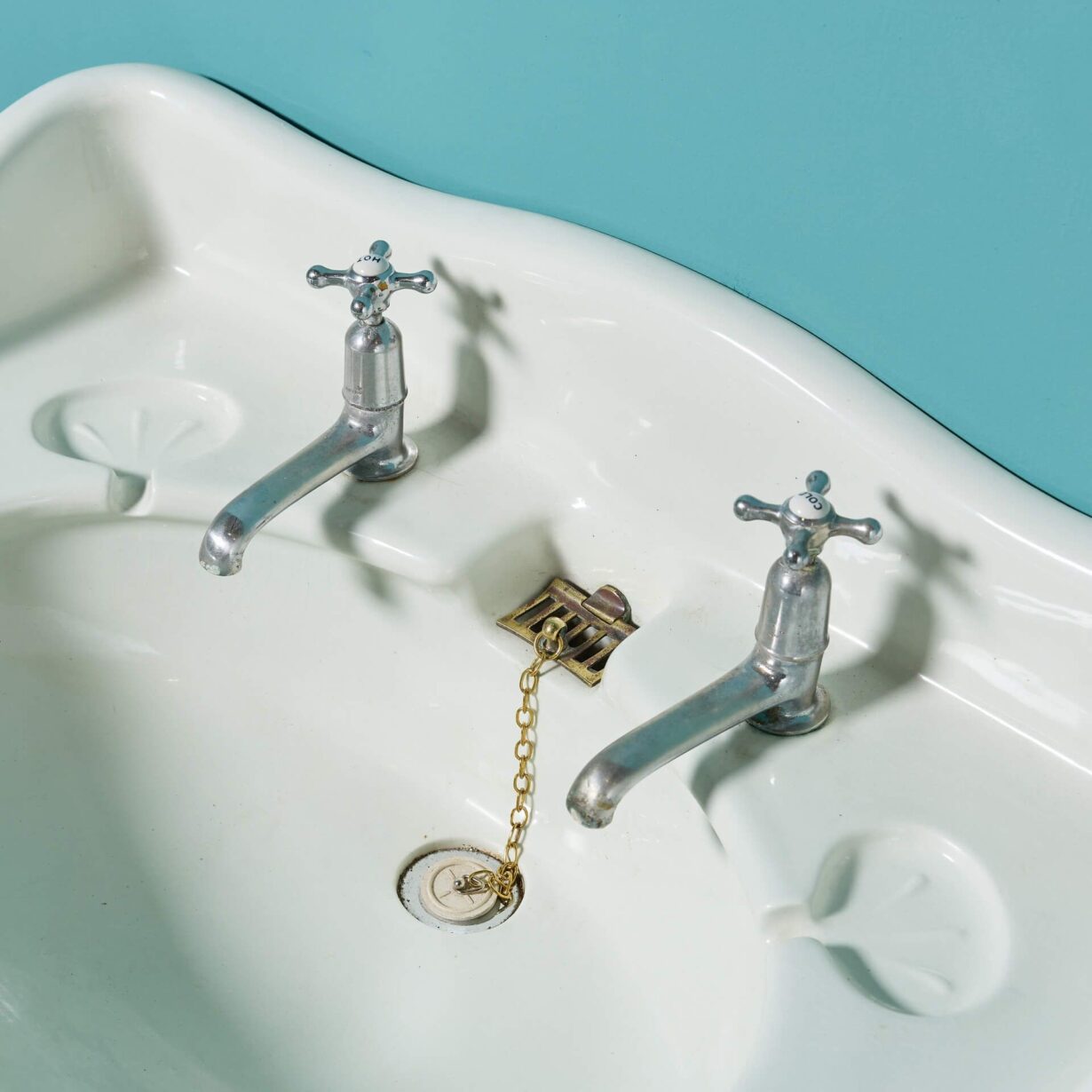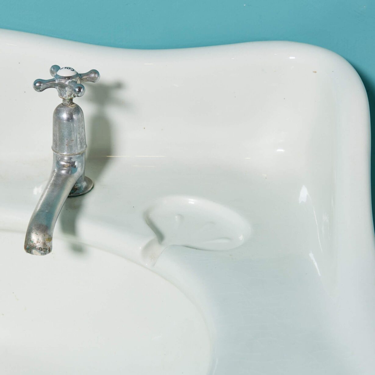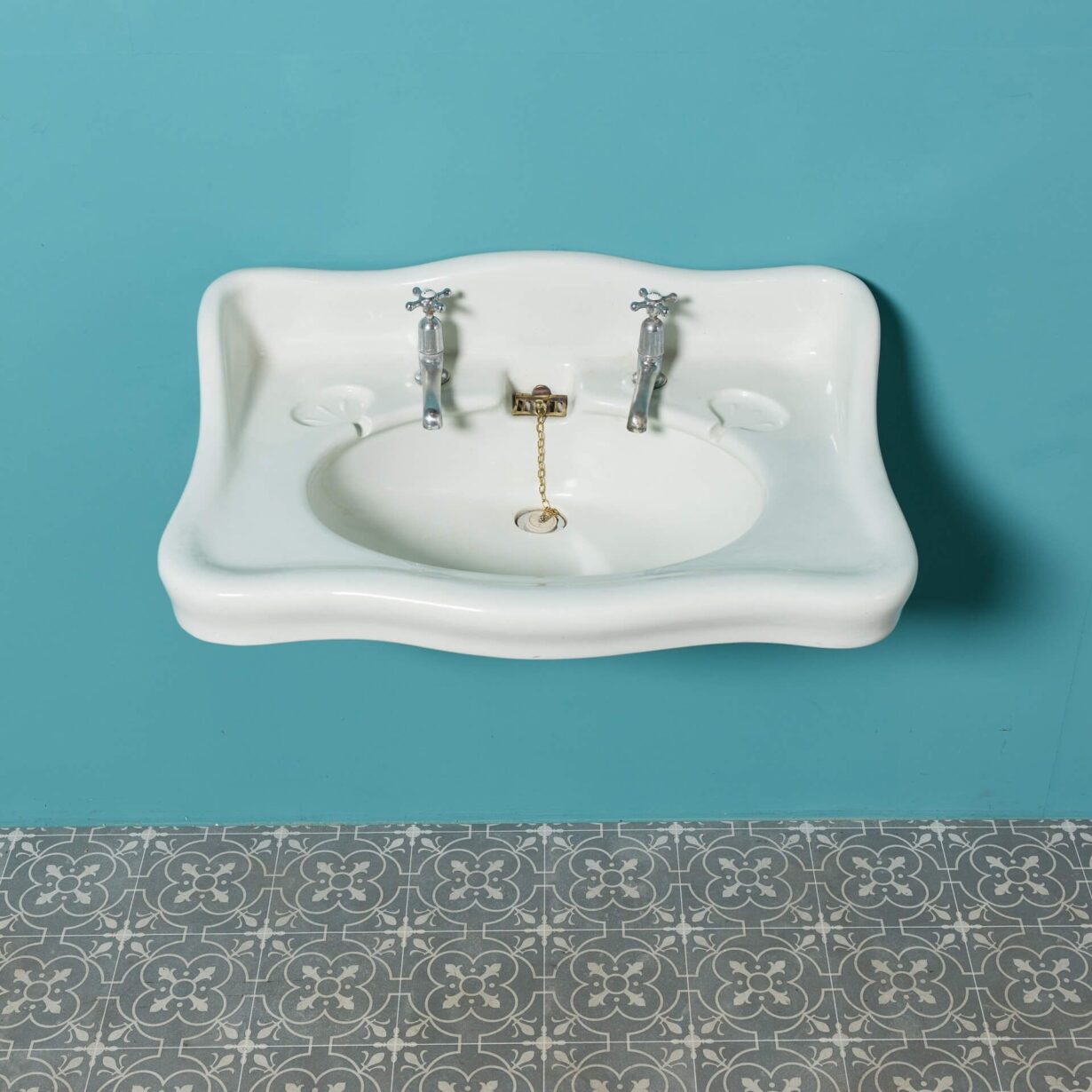 With its sweeping backsplash and rounded corners, this antique washbasin offers a pleasing design to suit many styles of bathroom. Features include original taps and two dainty oval shaped soap dishes.
