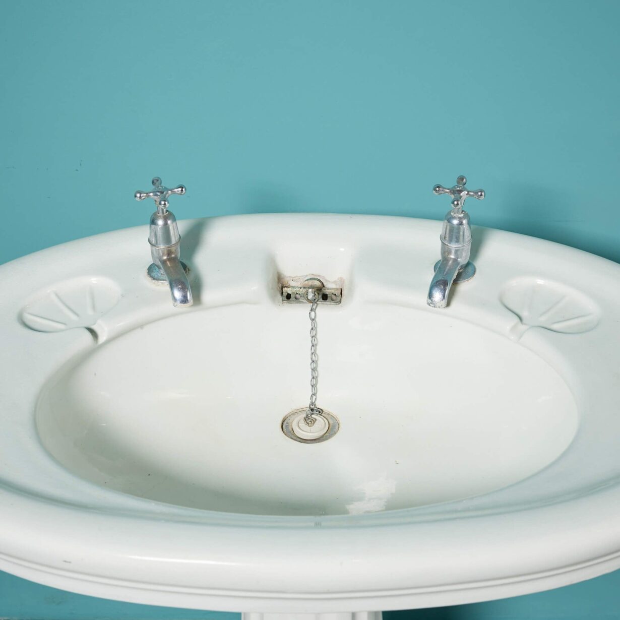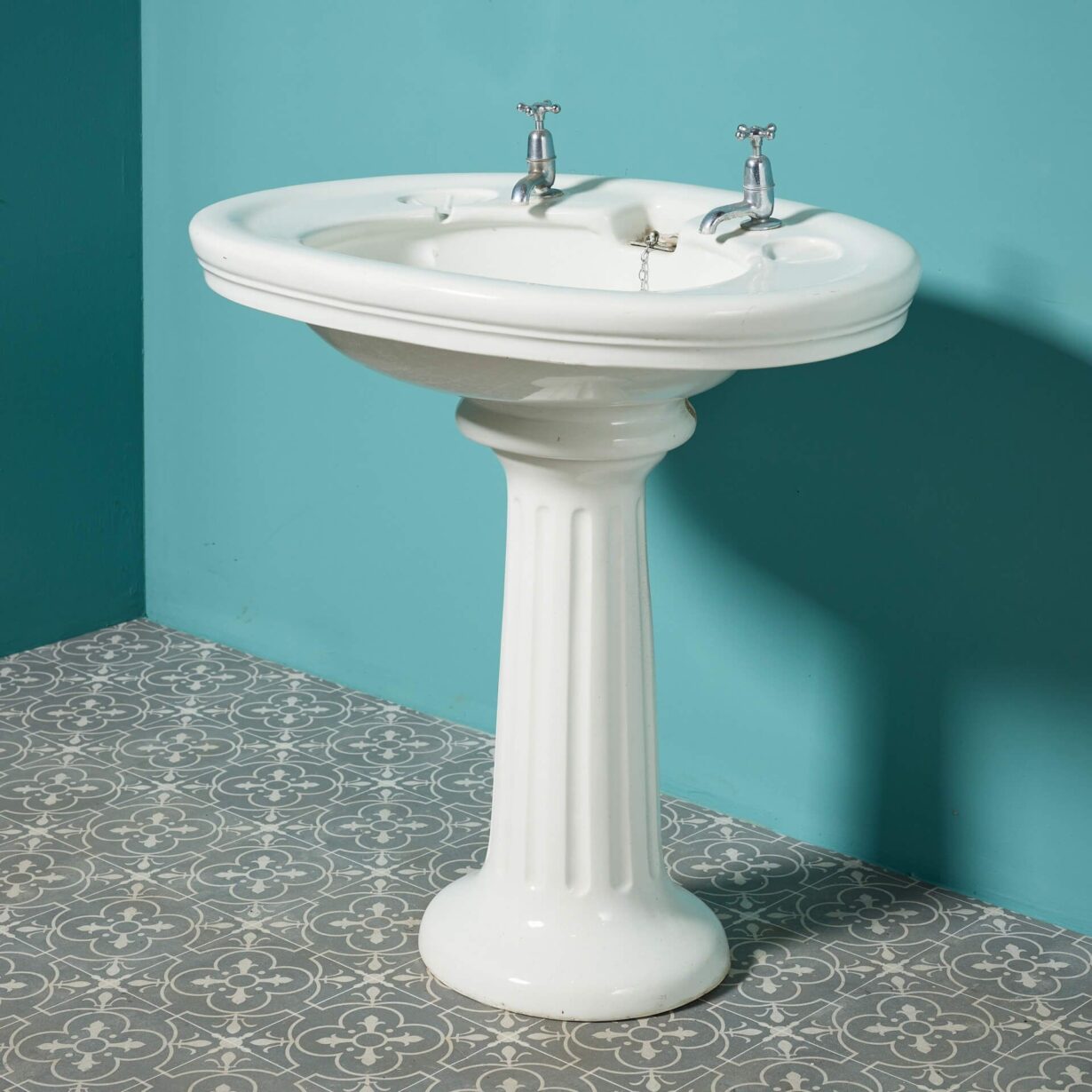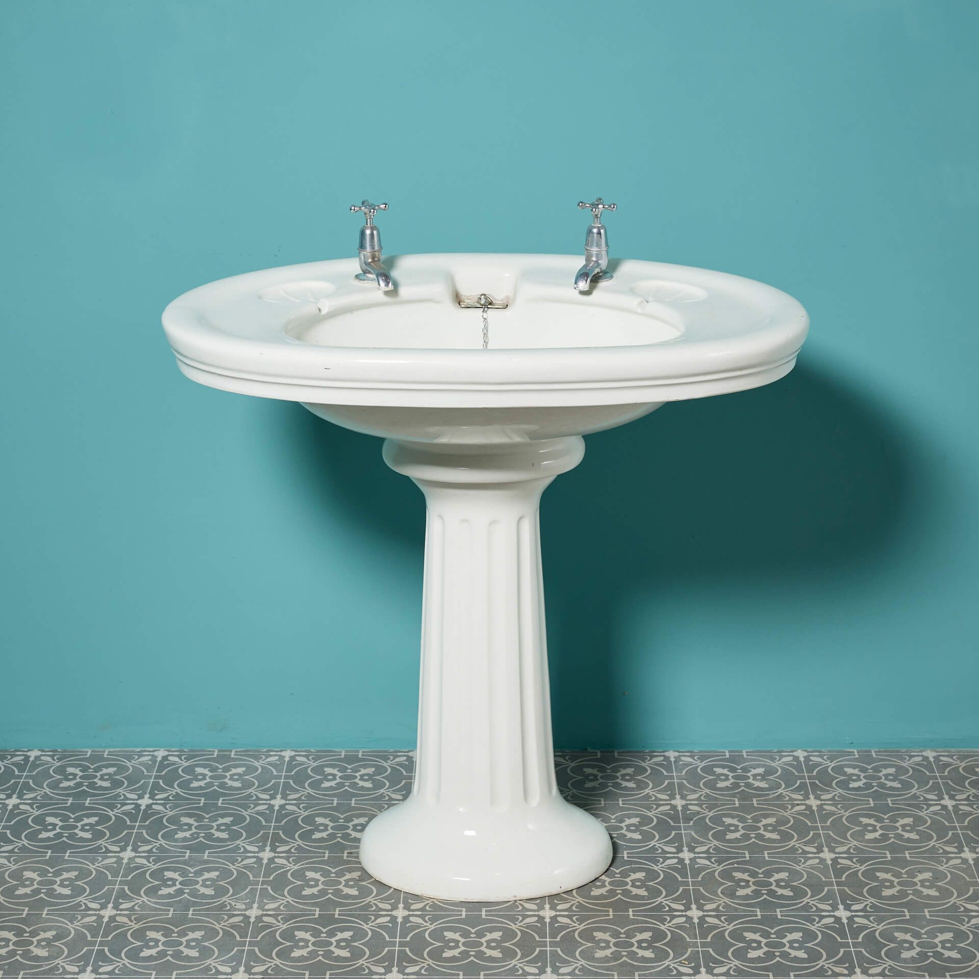 back to topAn Edwardian antique pedestal sink with a large oval shaped basin and fluted pedestal. With its pleasing shape and large scale, this porcelain sink is an elegant wash basin for a vintage bathroom or smart Edwardian style cloakroom. The sink is fitted with a plug chain and waste and is detailed to each side with oval, shell-shaped soap holders.