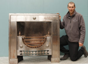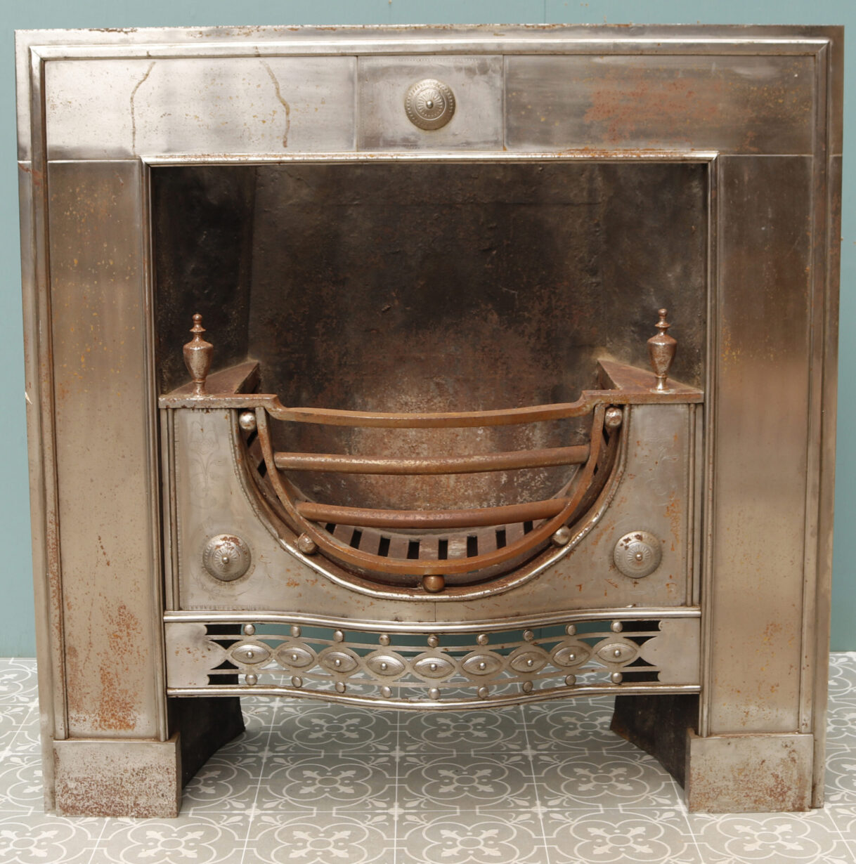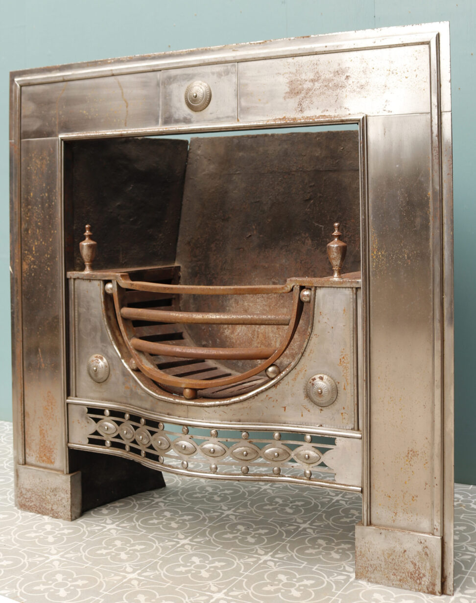 back to topEnglish 18th Century Style Register Fire Grate . A George III style register grate dating from the 20th century. This fire grate has shaped bars with a pierced and engraved fret. It is decorated with roundels and urn finials and is engraved in other areas. it was reclaimed from a barn in Norfolk.
