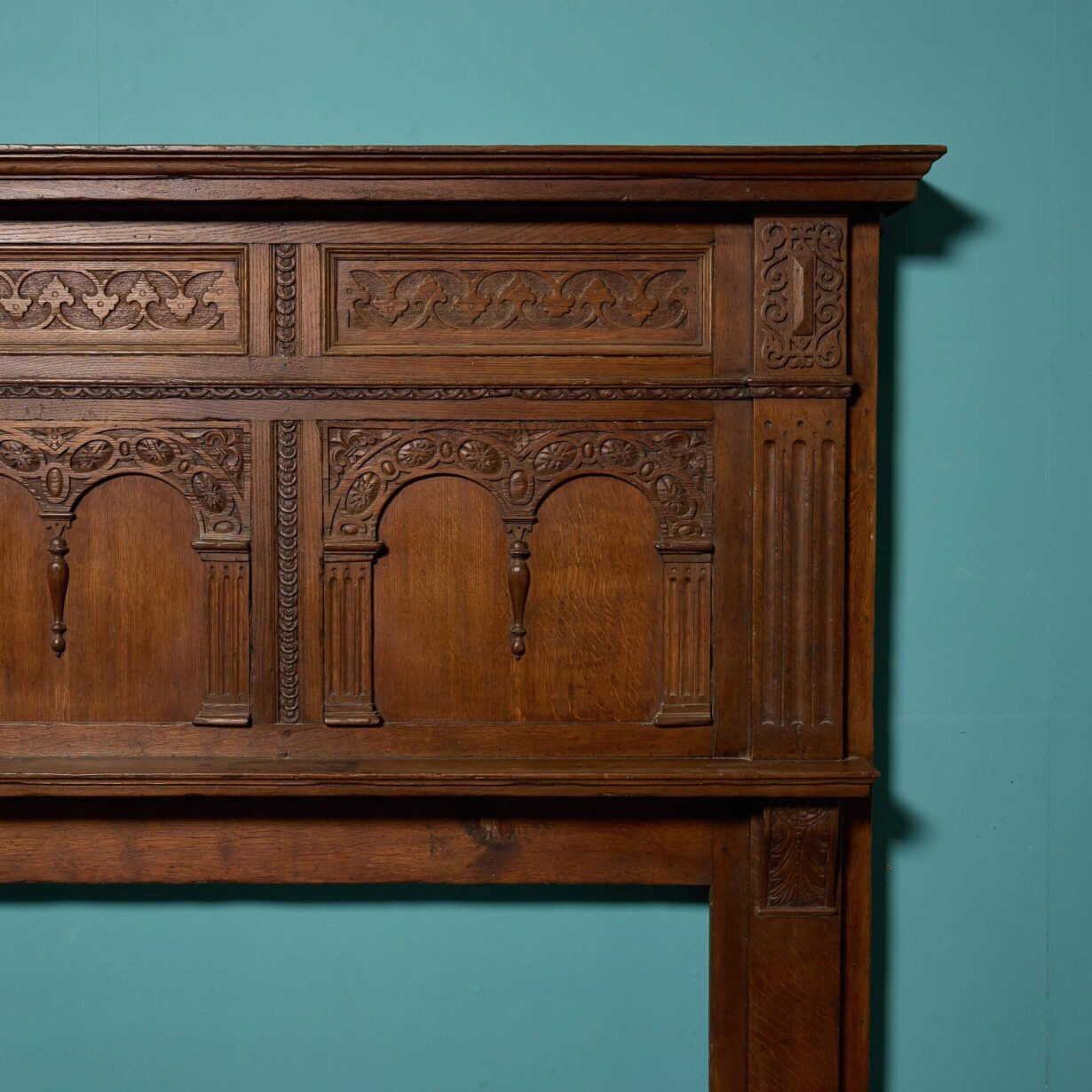 This large scale, beautifully handcarved fireplace is an impressive chimneypiece for any period interior thanks to its size, grandeur and appealing warm wood colour. Crafted in oak, the mantel is most ornate, carved with an array of scrolling and arched panels evocative of the handsome grandeur of the 15th century Jacobean period.