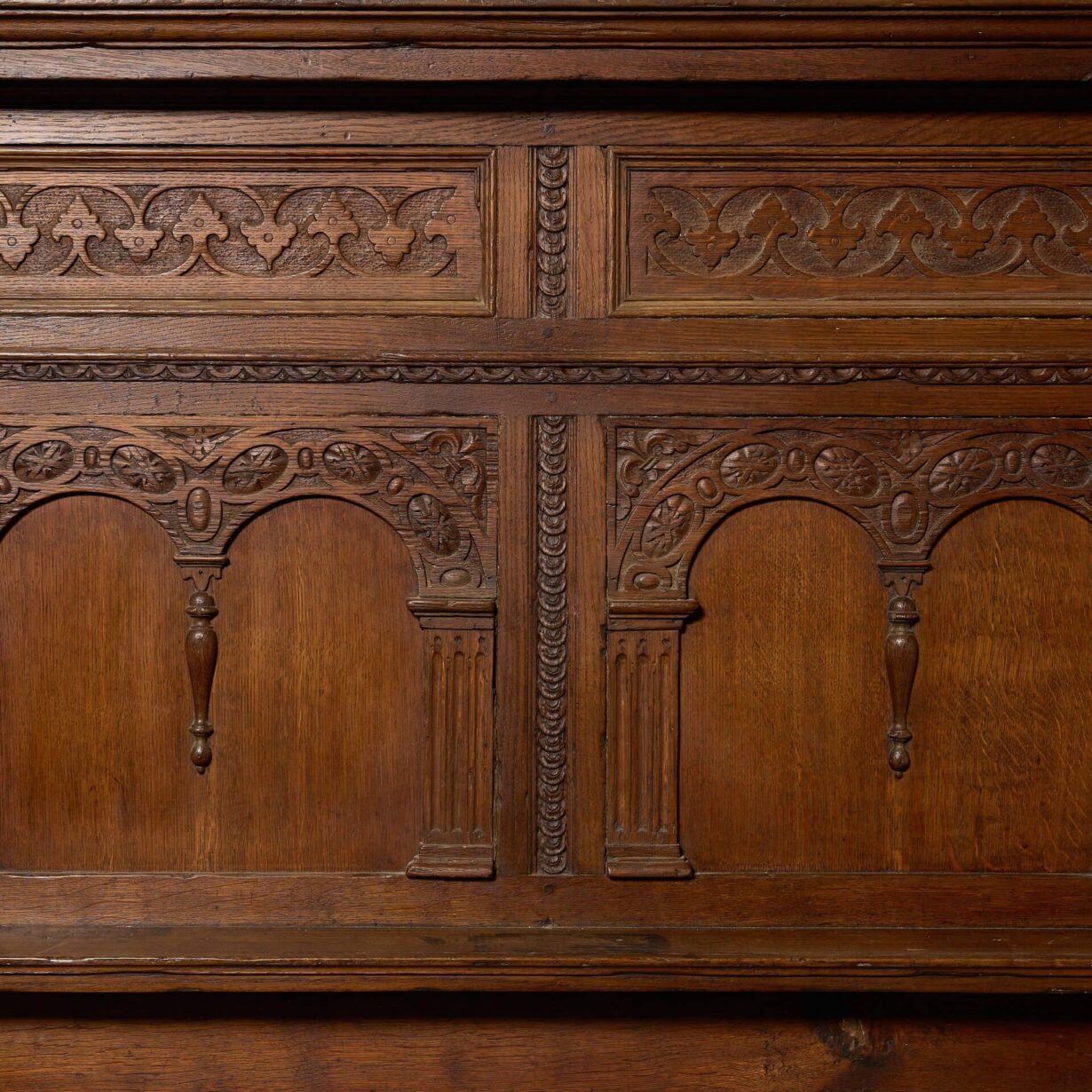 back to topA tall antique English Jacobean style fire surround dating from the Victorian era, constructed from earlier period components.