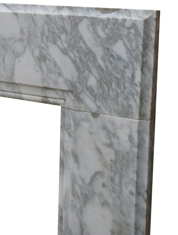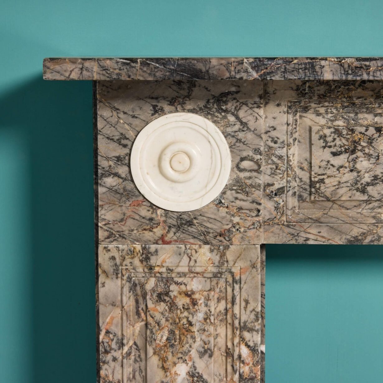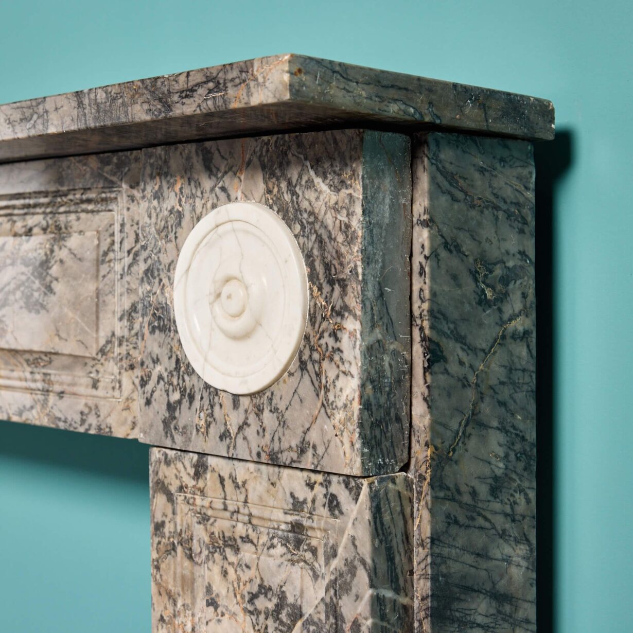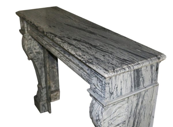 back to topAn elegant wide scale late 19th century English regency style antique marble fire surround, the marble of a rich grey tone similar to Ashburton. Its large scale makes this marble fireplace suitable for a main room in a period townhouse or regency style property, while its clean lines offer a simple and understated look. The natural variations of the grain make for a beautiful feature fireplace, subtly detailed with a panelled details to the frieze and jambs with bullseye roundels to the end blocks.
