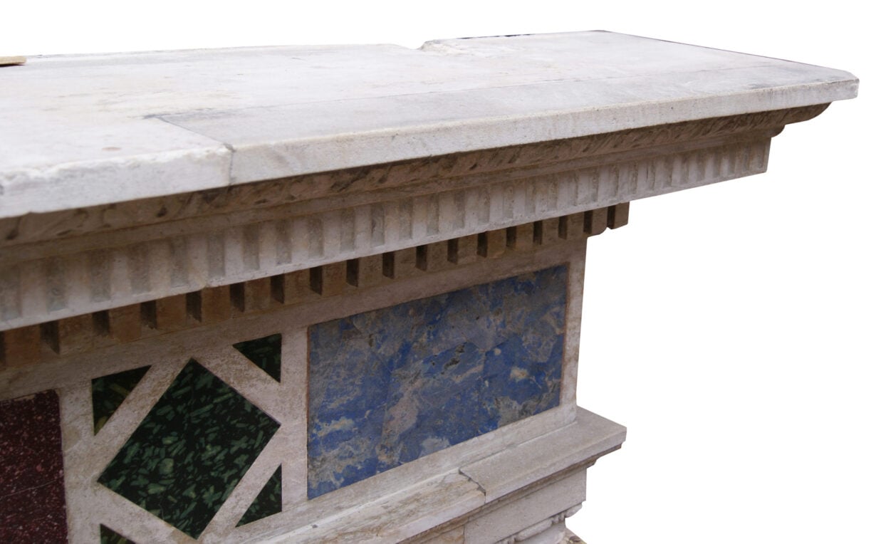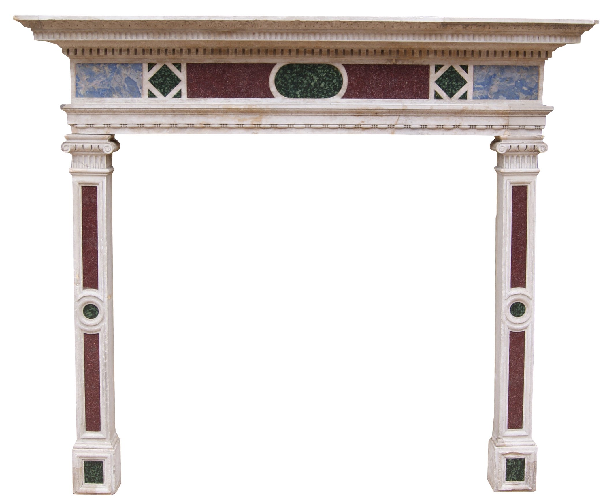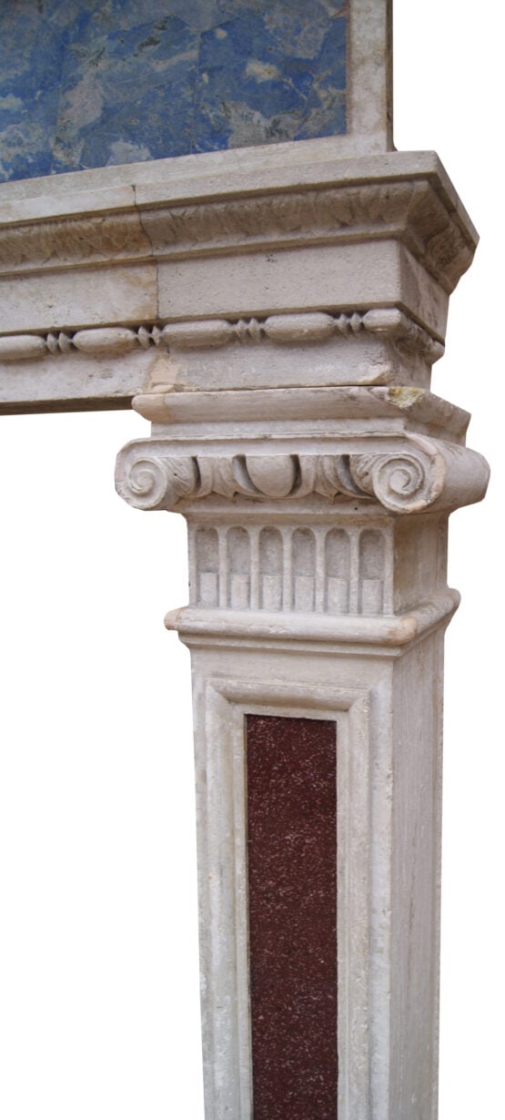 back to topEnglish Renaissance Revival Stone and Porphyry Fireplace. A 19th century Renaissance style fireplace carved from Istrian stone with semi-precious inlaid marble. The frieze panel inlaid with Egyptian Imperial red Porphyry, Ancient Green Peloponnesian Porphyry and lazurite. Supported on similarly panelled jambs. The jambs surmounted by carved ionic capitals.