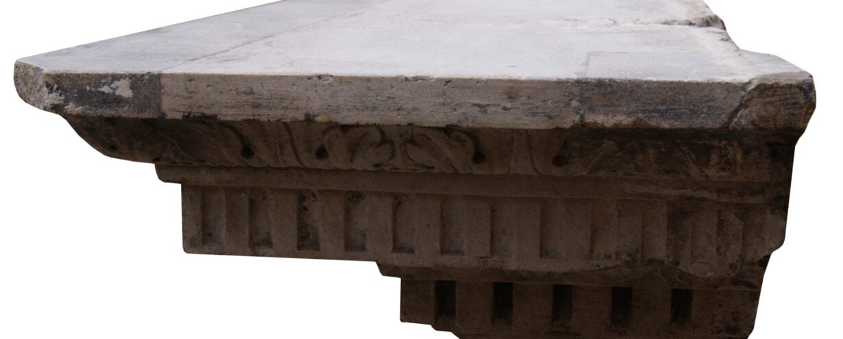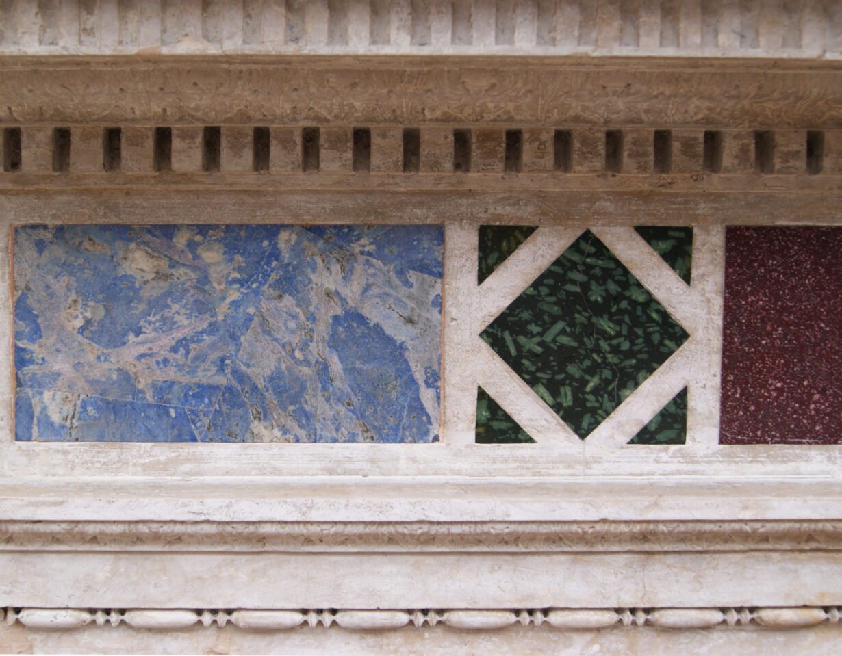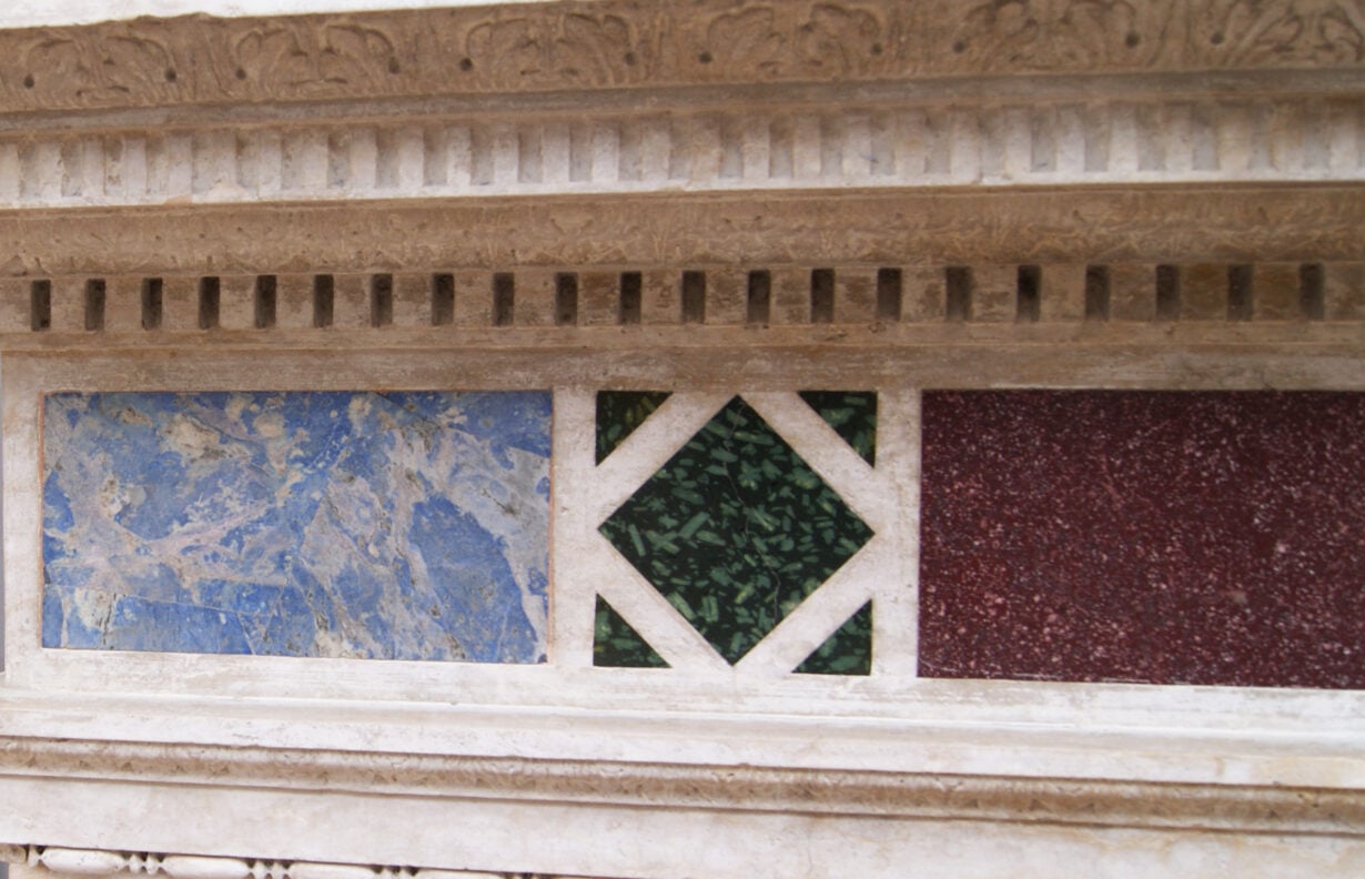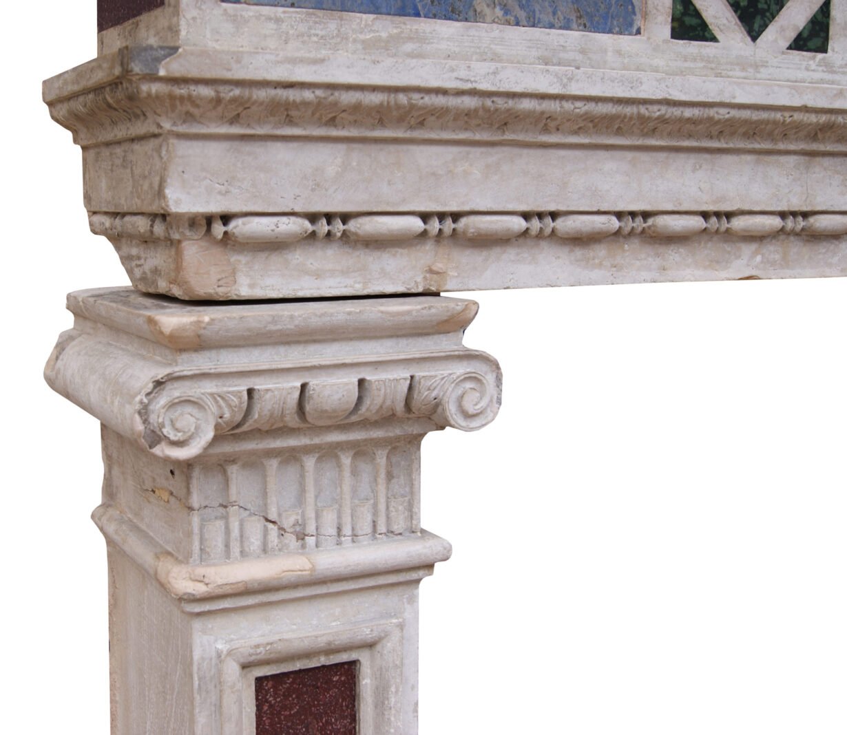 back to topEnglish Renaissance Revival Stone and Porphyry Fireplace. A 19th century Renaissance style fireplace carved from Istrian stone with semi-precious inlaid marble. The frieze panel inlaid with Egyptian Imperial red Porphyry, Ancient Green Peloponnesian Porphyry and lazurite. Supported on similarly panelled jambs. The jambs surmounted by carved ionic capitals.