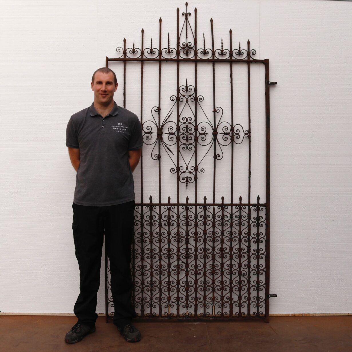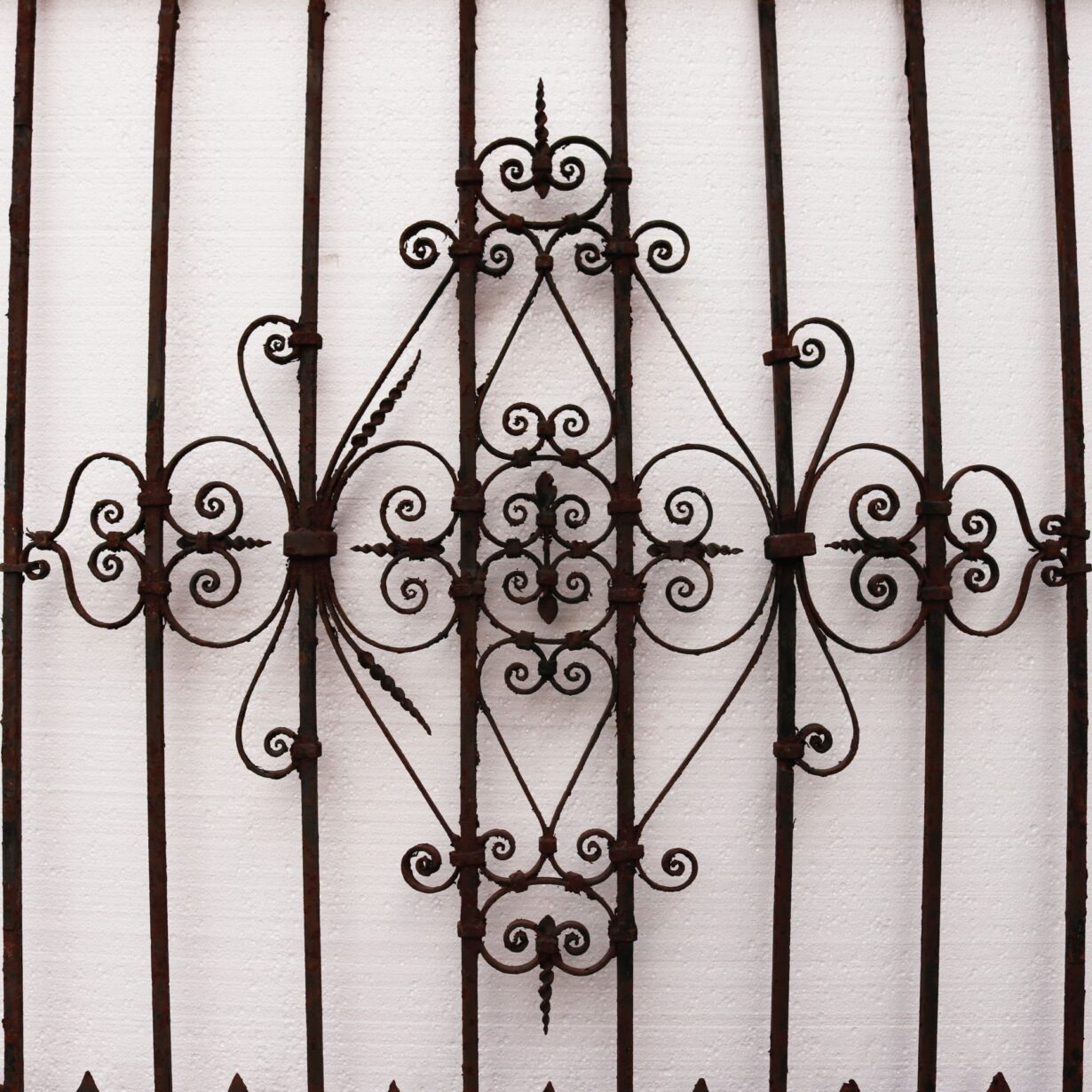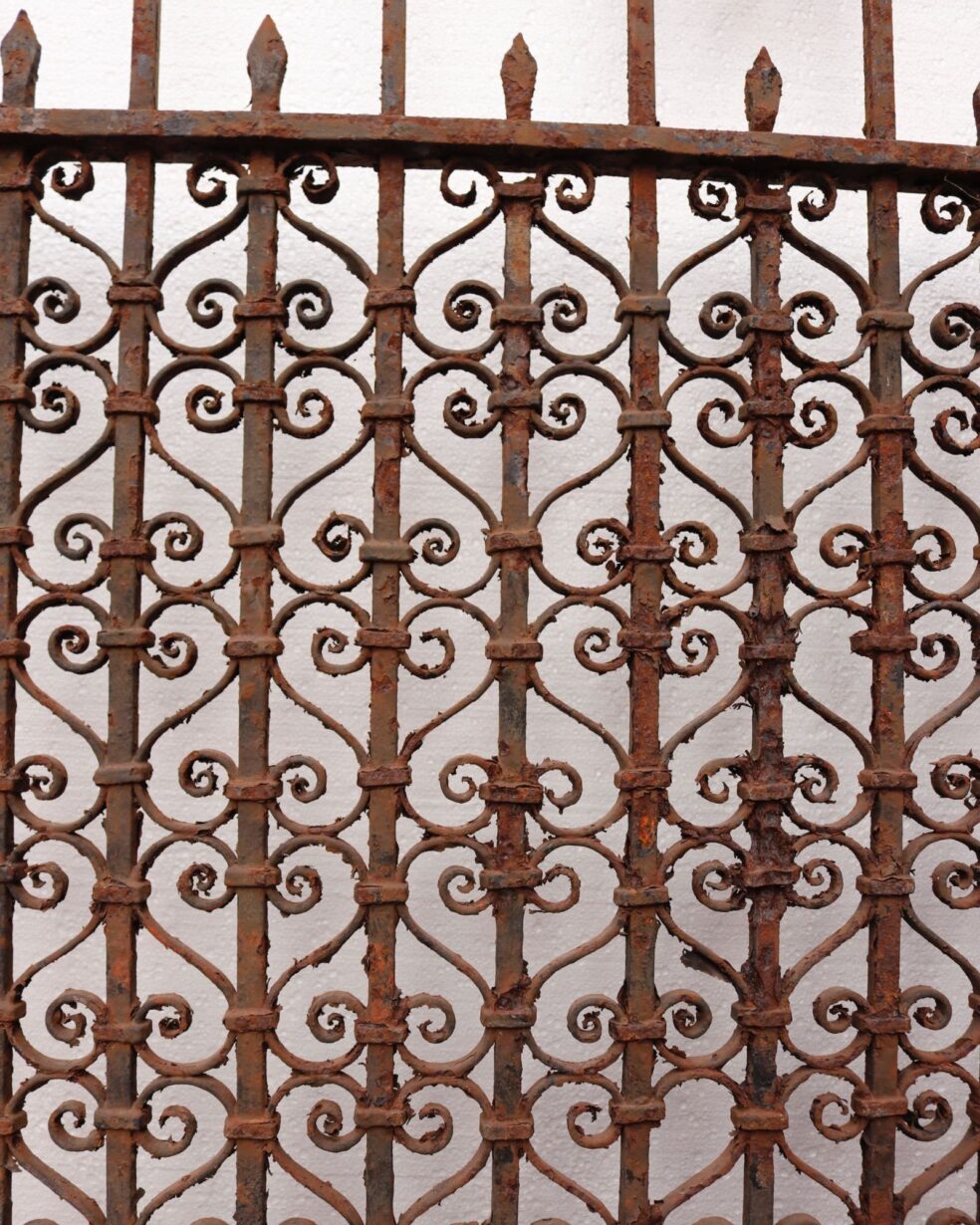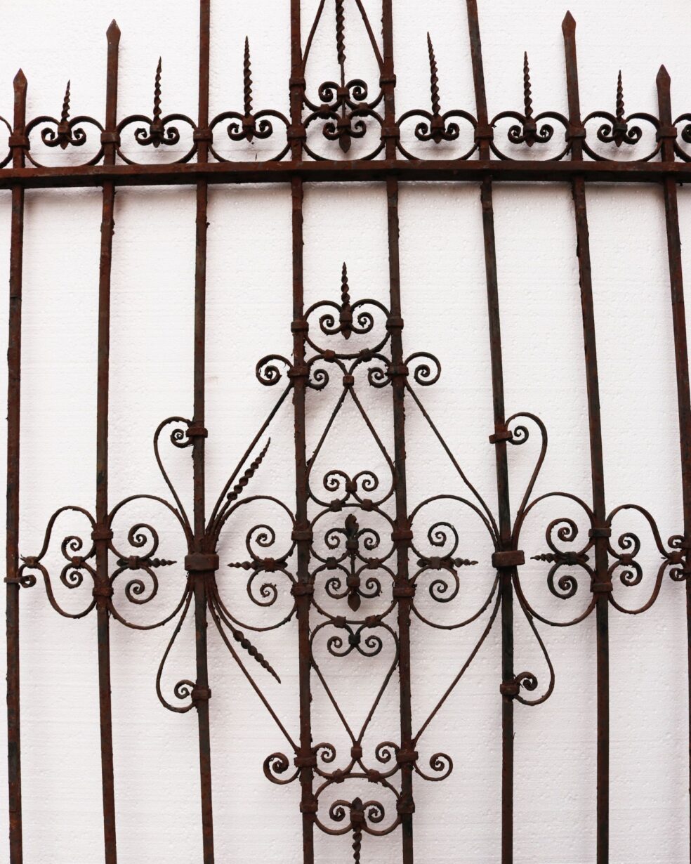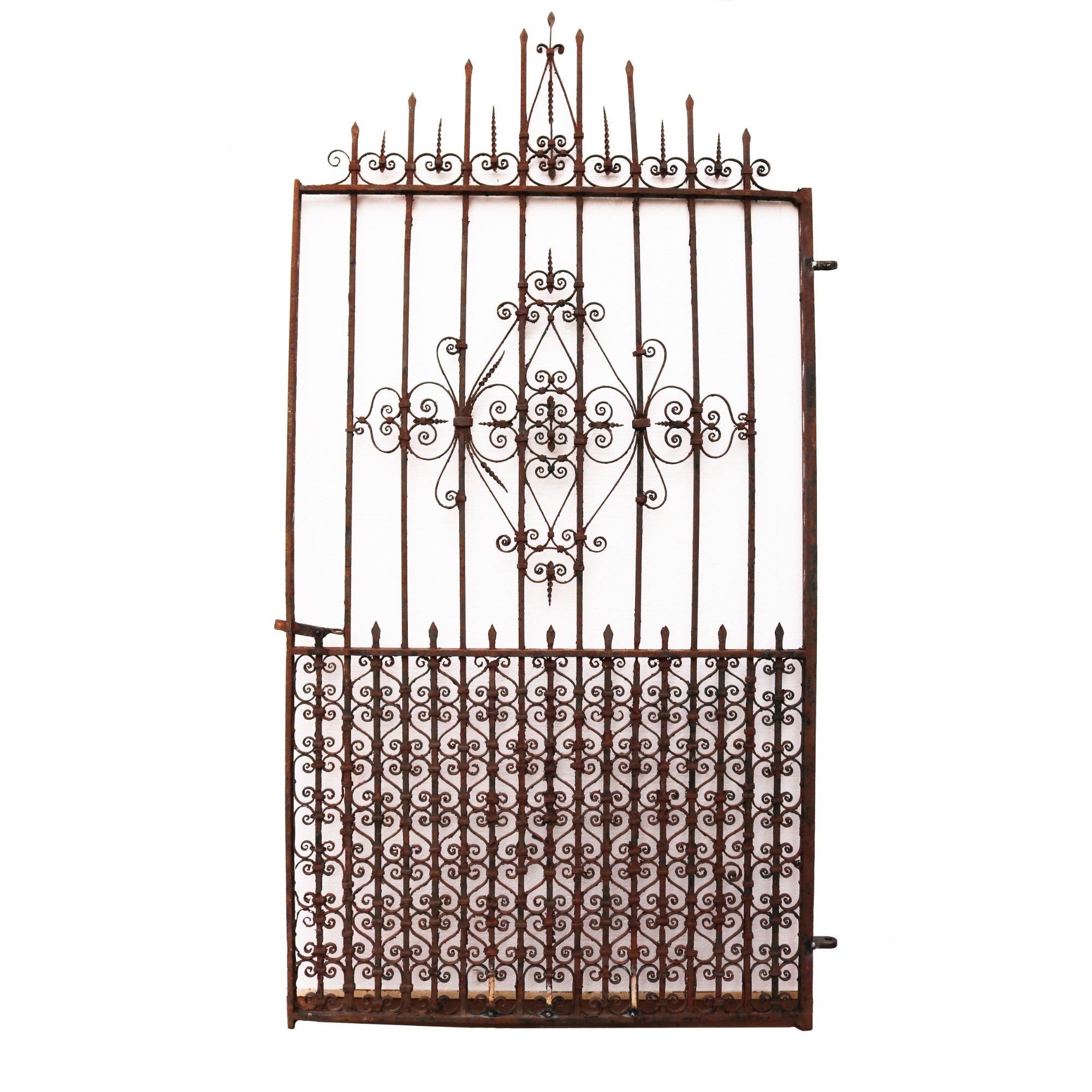 back to topEnglish Victorian wrought iron garden gate originating from circa 1870. Its unusual design shows scrolls coming together in an array of patterns, while spikes shoot out from its top, making it a unique focal point of any garden, courtyard, or patio. This tall gate comes with original hinges and latch, further highlighting the craftsmanship of its blacksmith.