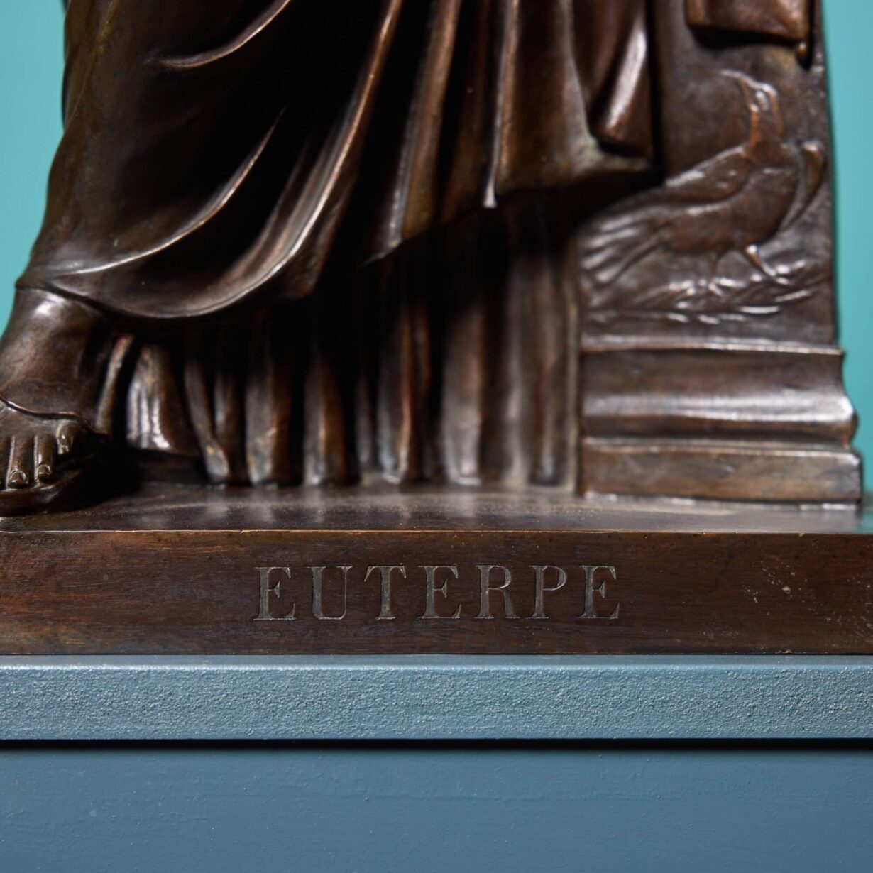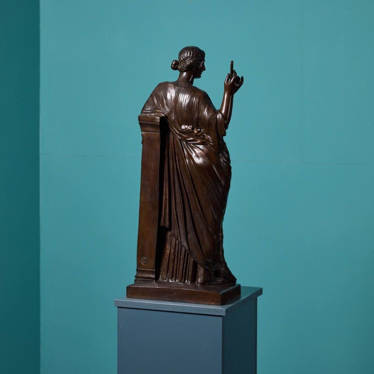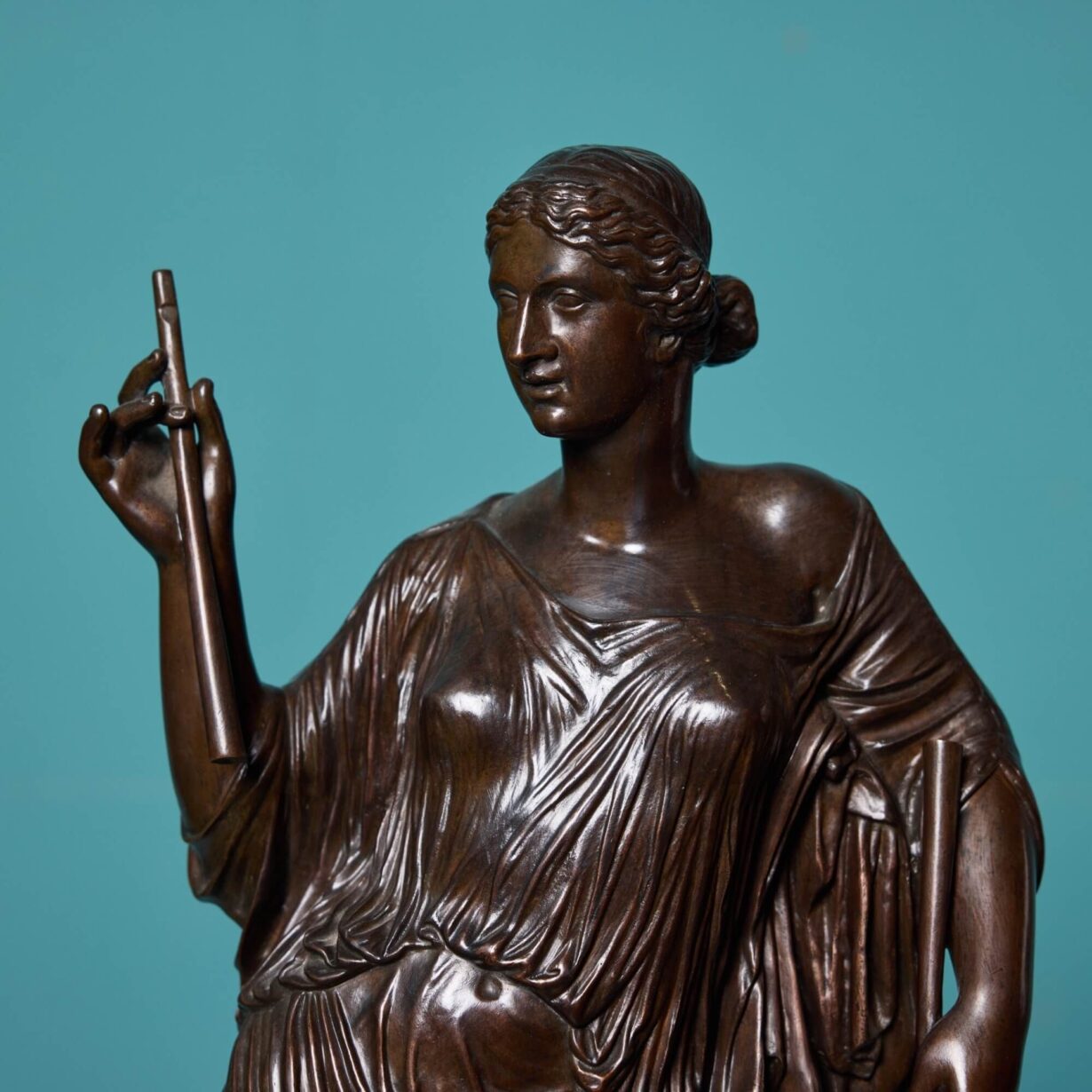 back to topA bronze sculpture of Euterpe attributed to French metalworker Ferdinand Barbedienne (1810-1892). Embellished to the reverse with the official stamp of the Collas et Barbedienne foundry: ‘Reduction Mecanique, A. Collas Brevete’. Standing at approximately 89cm tall, this Barbedienne bronze is of larger scale than other depictions of Euterpe by the French foundry, making it a rare find.
