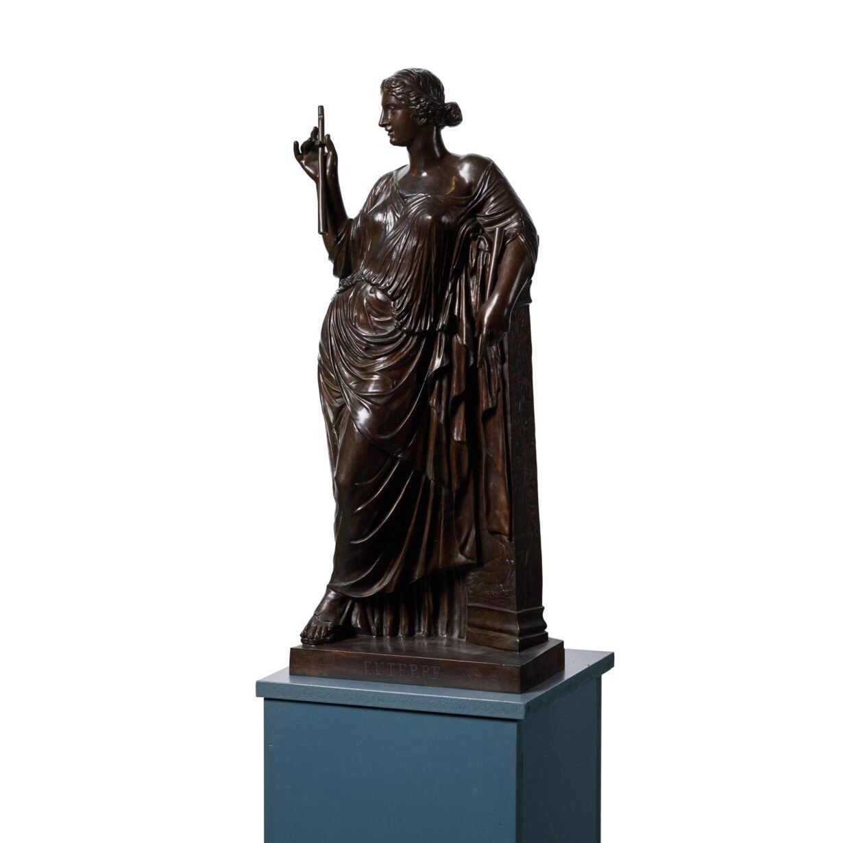 Euterpe was one of the nine Greek Muses, known as the Goddess of Music, Song and Dance. She leans against a decorated pedestal and holds a flute in her right hand. It is a striking sculpture for an interior, capturing the presence of the full-scale antique in beautiful detail.