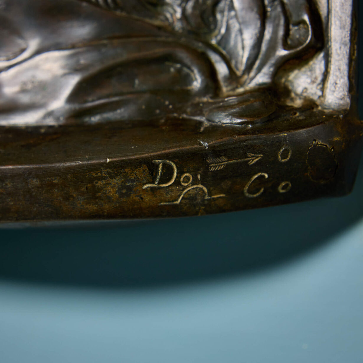 The sculpture is mounted to a light blue wooden panel, framed in a light oak. The front edge of the relief is marked with a cypher made up of letters and symbols.