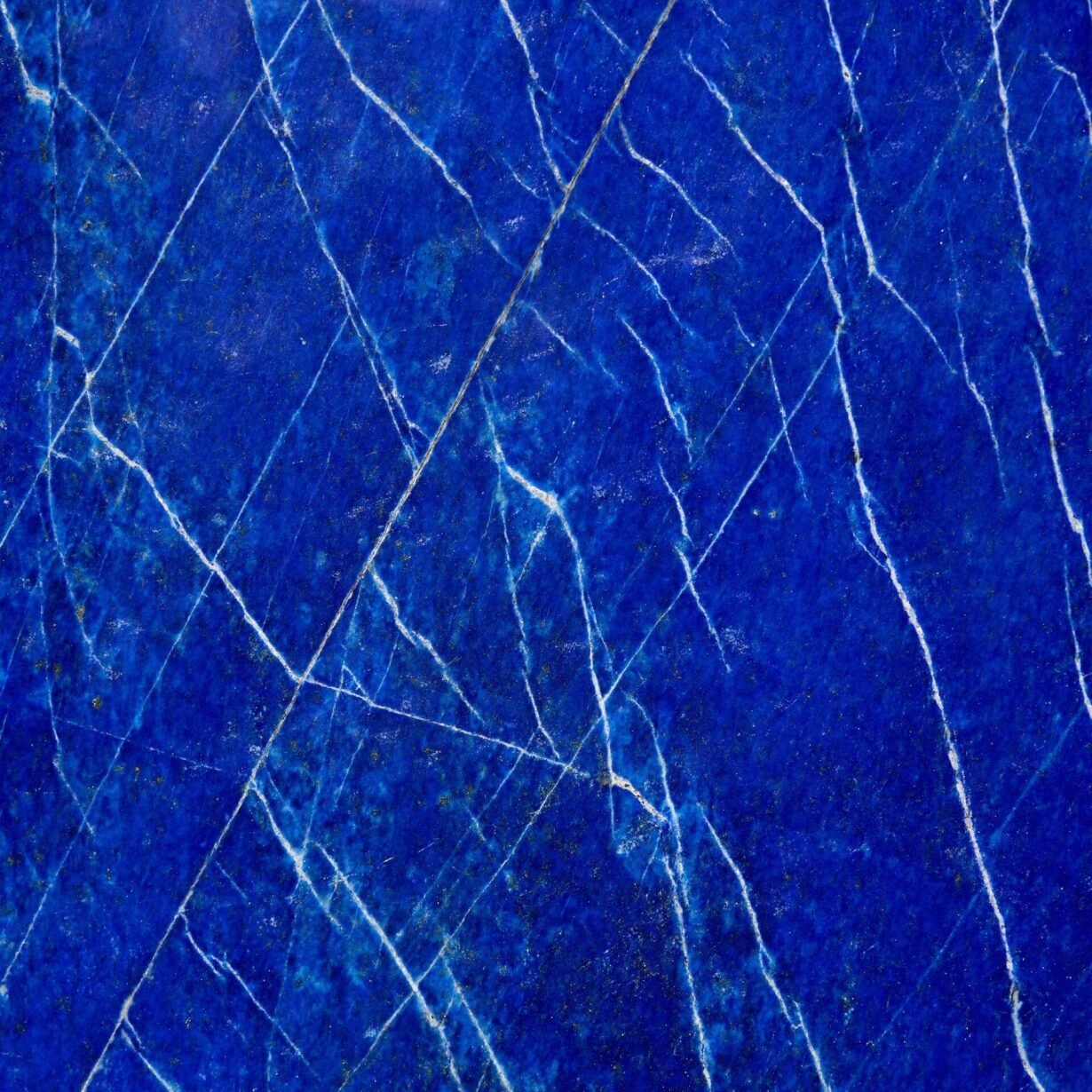 Lazurite is the main component of lapis lazuli and accounts for the stone’s intense blue colour. The best quality lapis lazuli is intense dark blue, with minor patches of white calcite and brassy yellow pyrite.