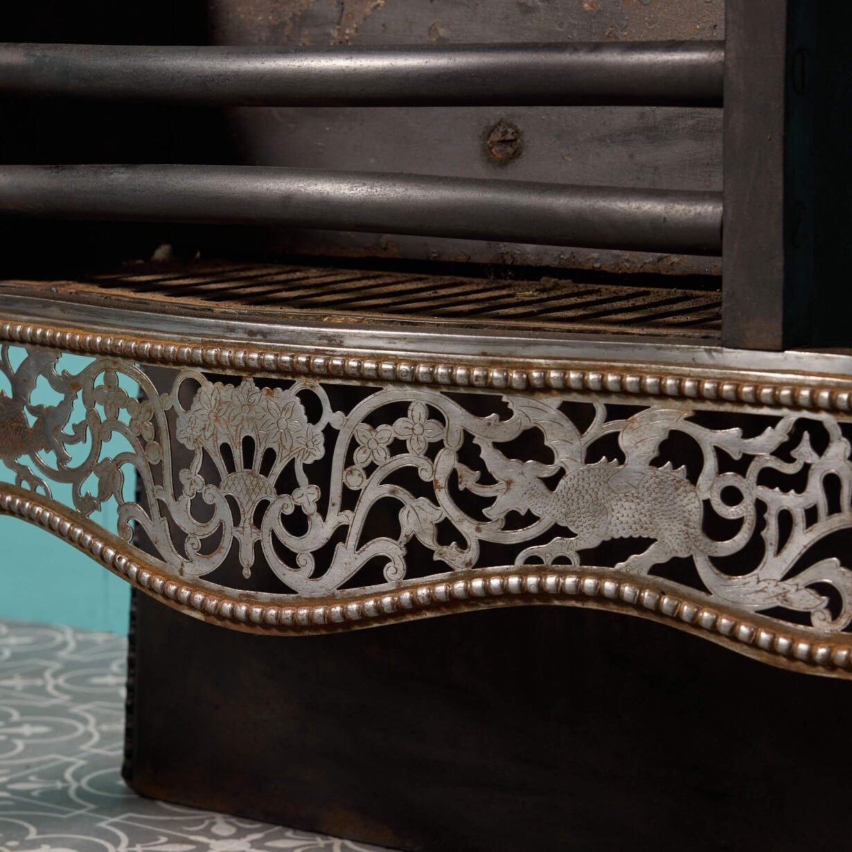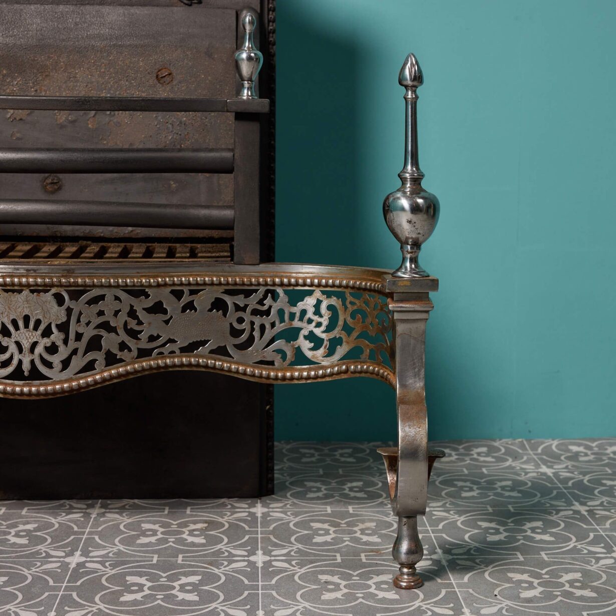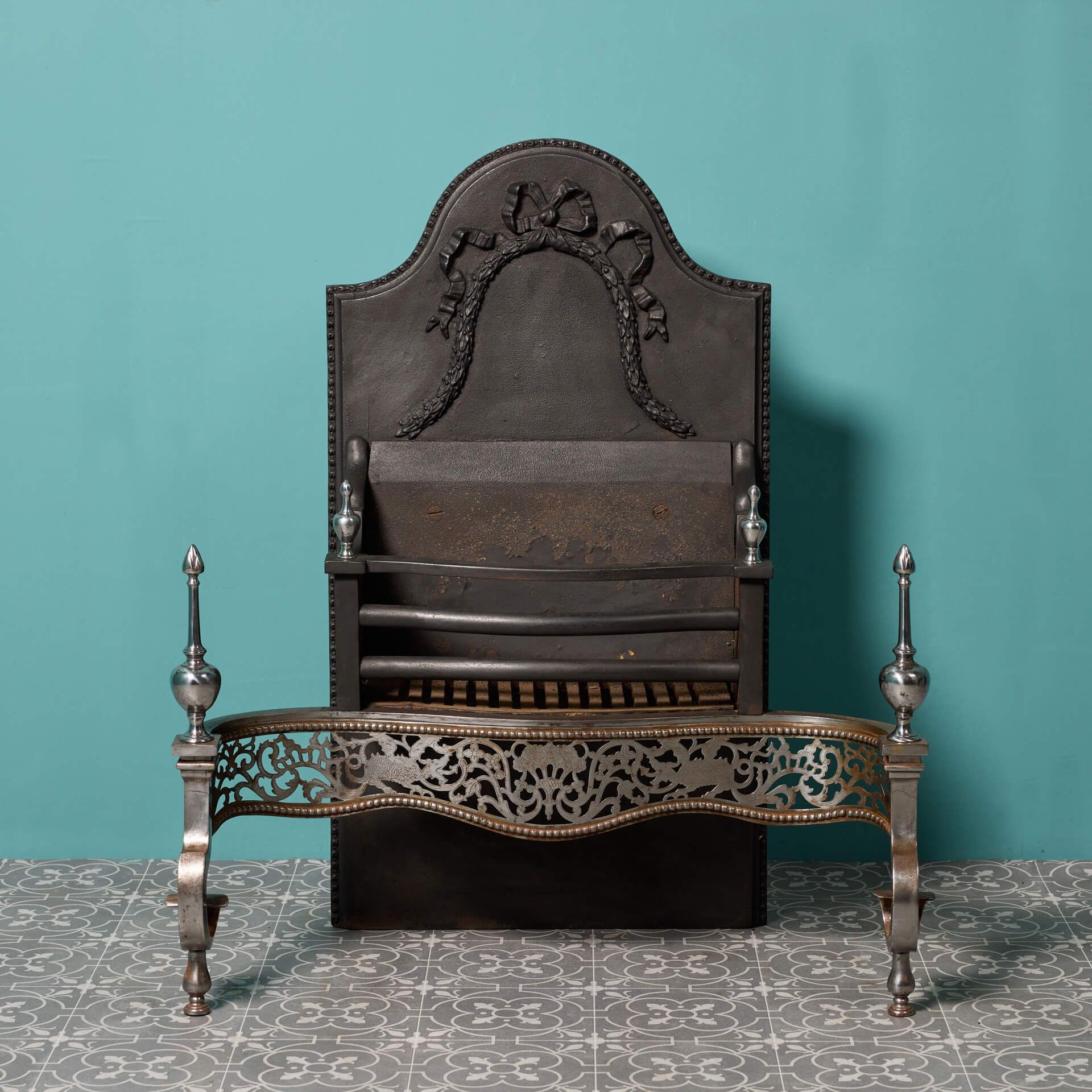 back to topA large antique George III style polished steel fire grate. In Victorian style, this three barred grate sits above a finely cut and pierced apron. Depictions of mythical beasts and flowers are amidst scrolling stylised foliage and surmounted by a pair of small steeple finials.