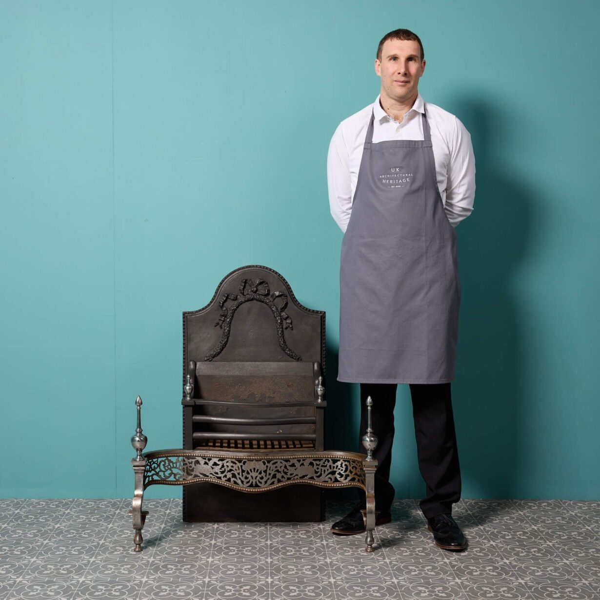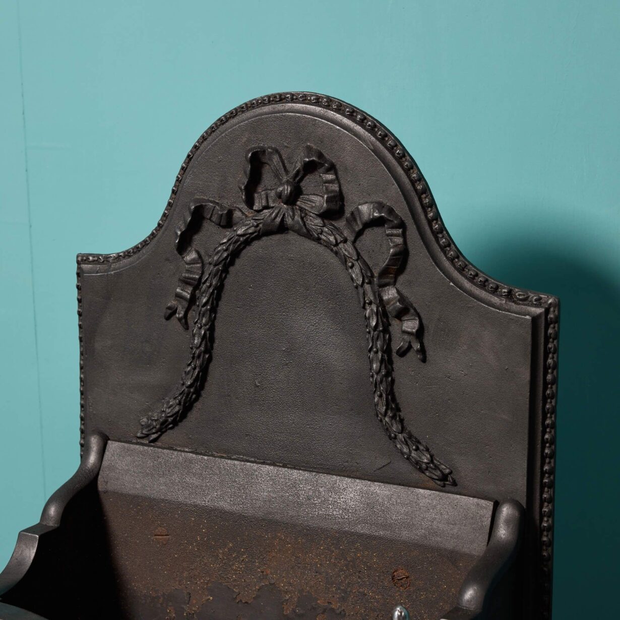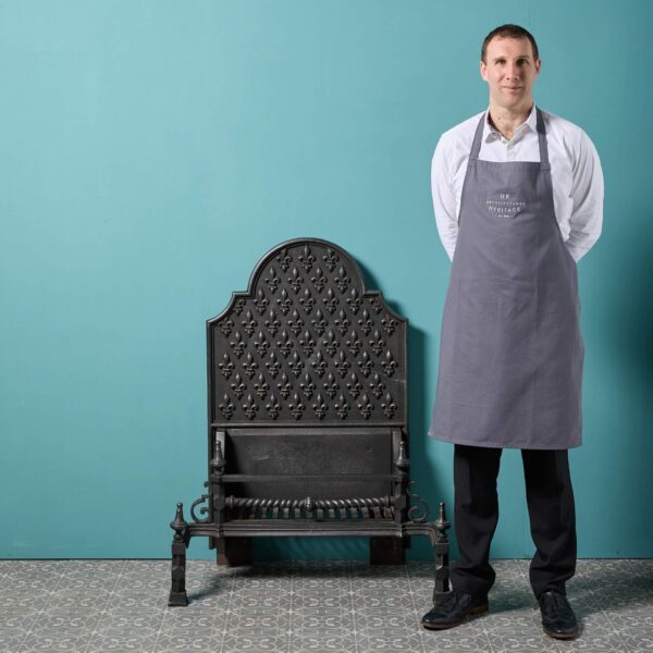 back to topA large antique George III style polished steel fire grate. In Victorian style, this three barred grate sits above a finely cut and pierced apron. Depictions of mythical beasts and flowers are amidst scrolling stylised foliage and surmounted by a pair of small steeple finials.