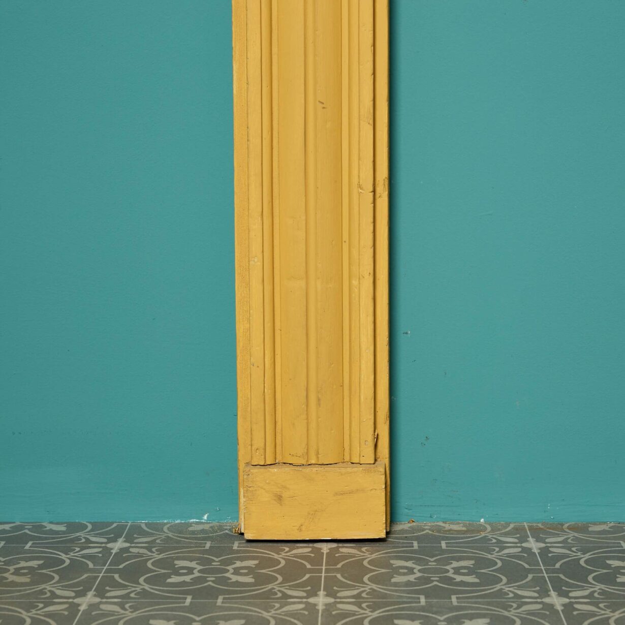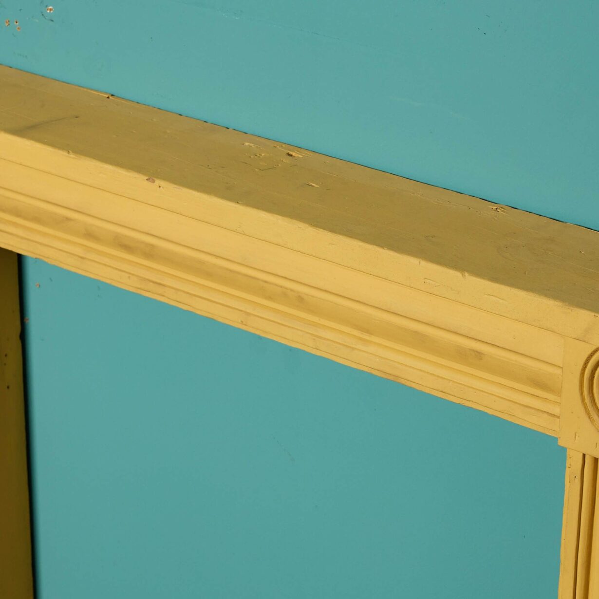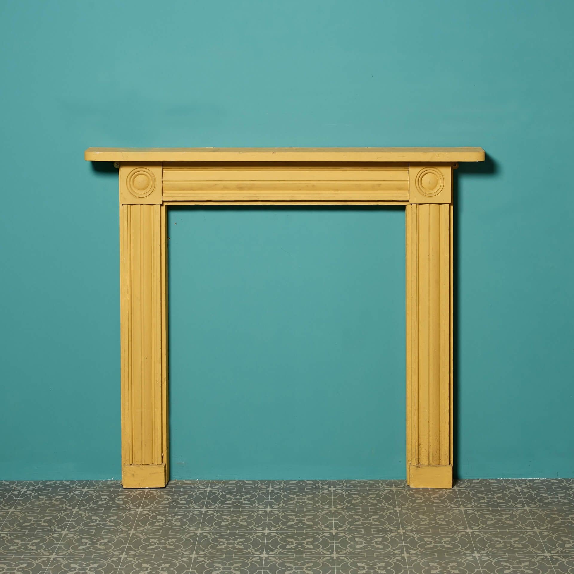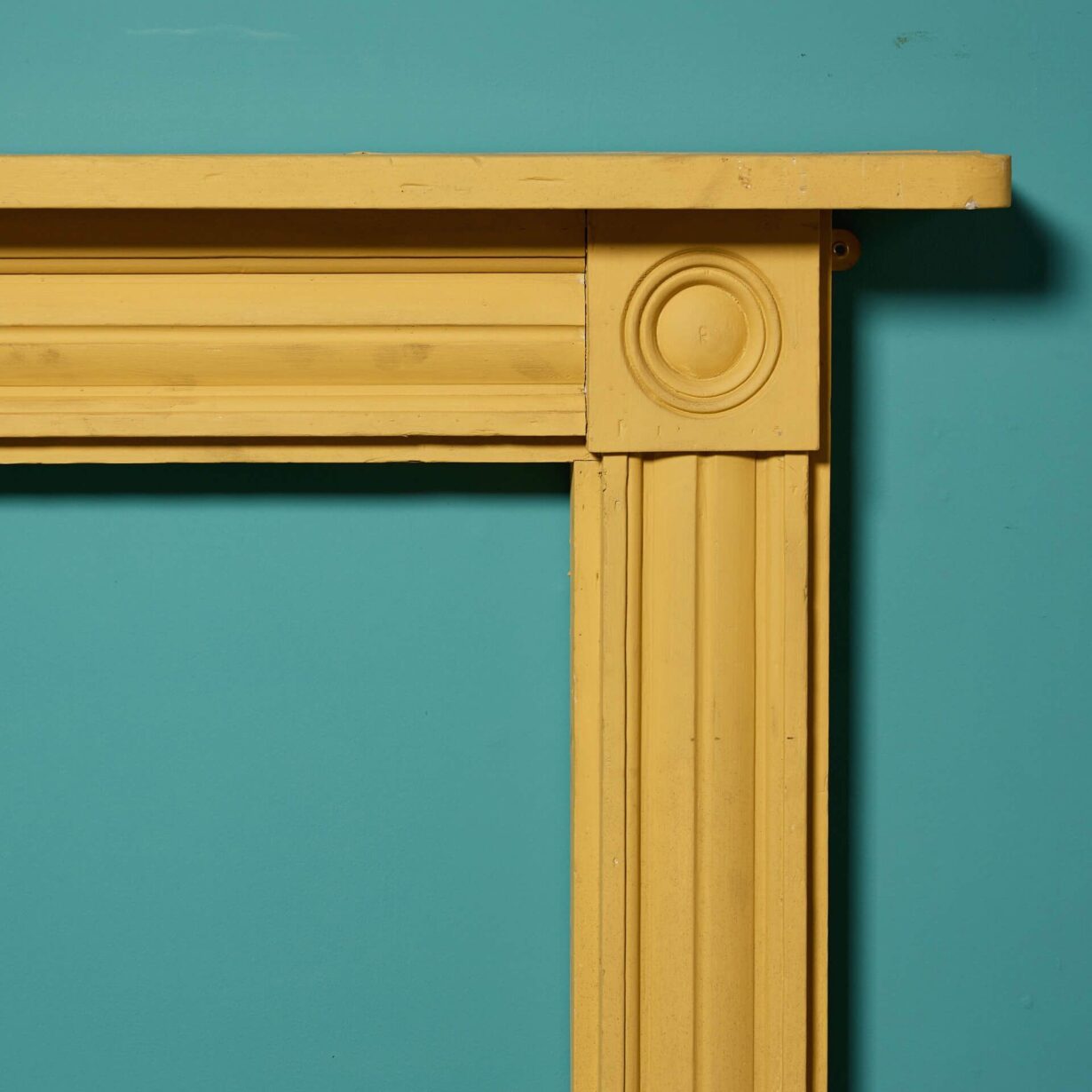 Painted with a bold yellow finish, this fireplace is ornamented with round details called ‘bullseye’ to both end blocks between a smart frieze and slender jambs.