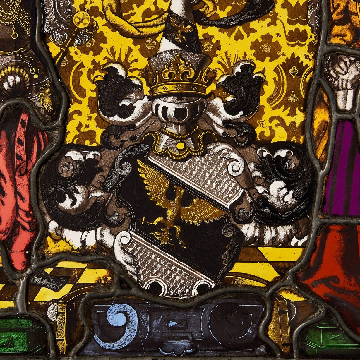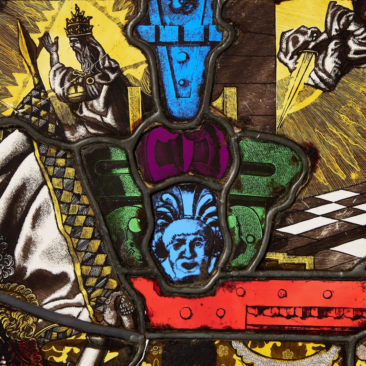 back to topA mid 19th century German antique stained glass window depicting an exceptionally detailed and colourful scene with heraldic and ecclesiastical themes. The design centres around a coat of arms to the lower half, possibly of German origin, between two figures, one of which is dressed in armour and carries a flag. Above is a re-telling of the religious story of Adam of Eve.