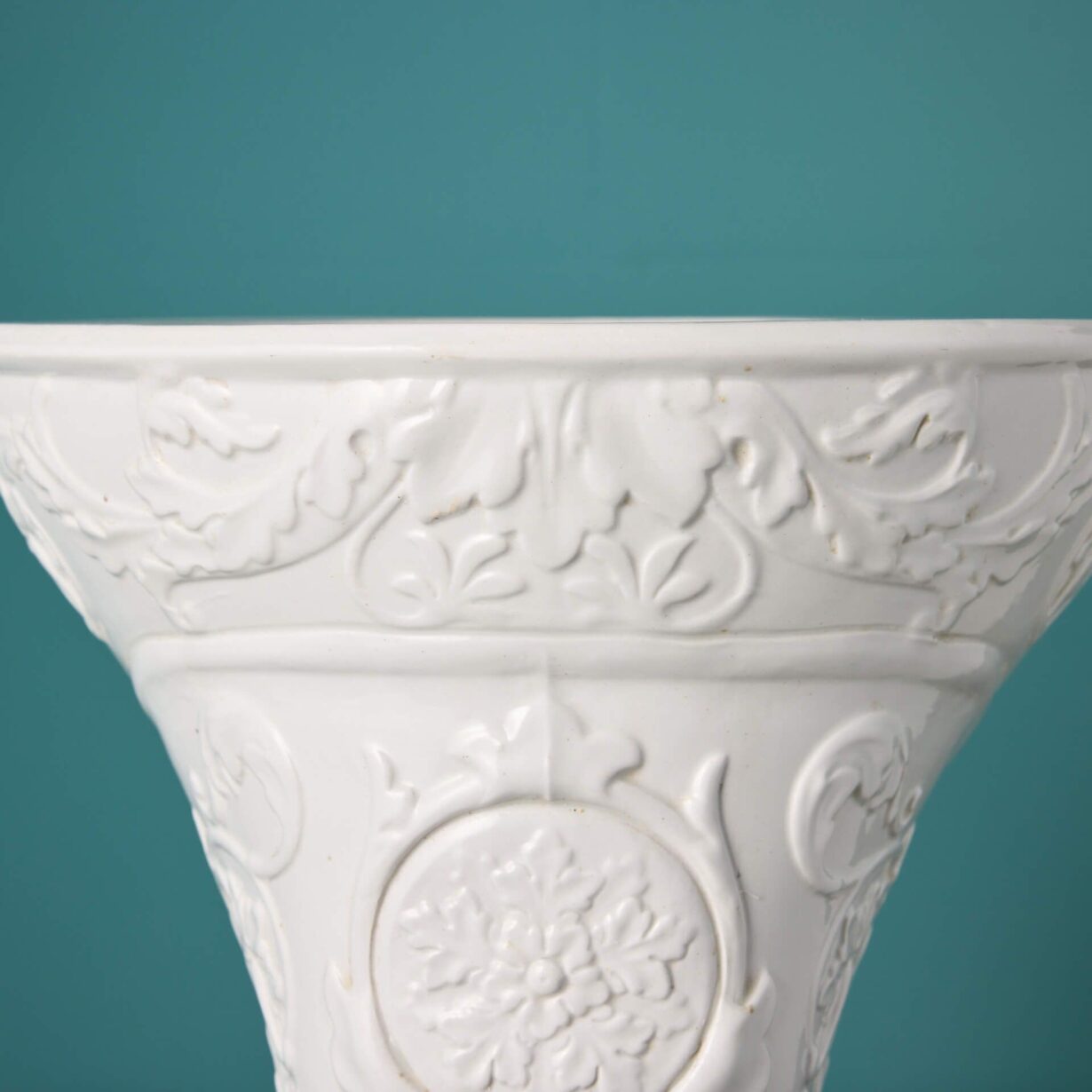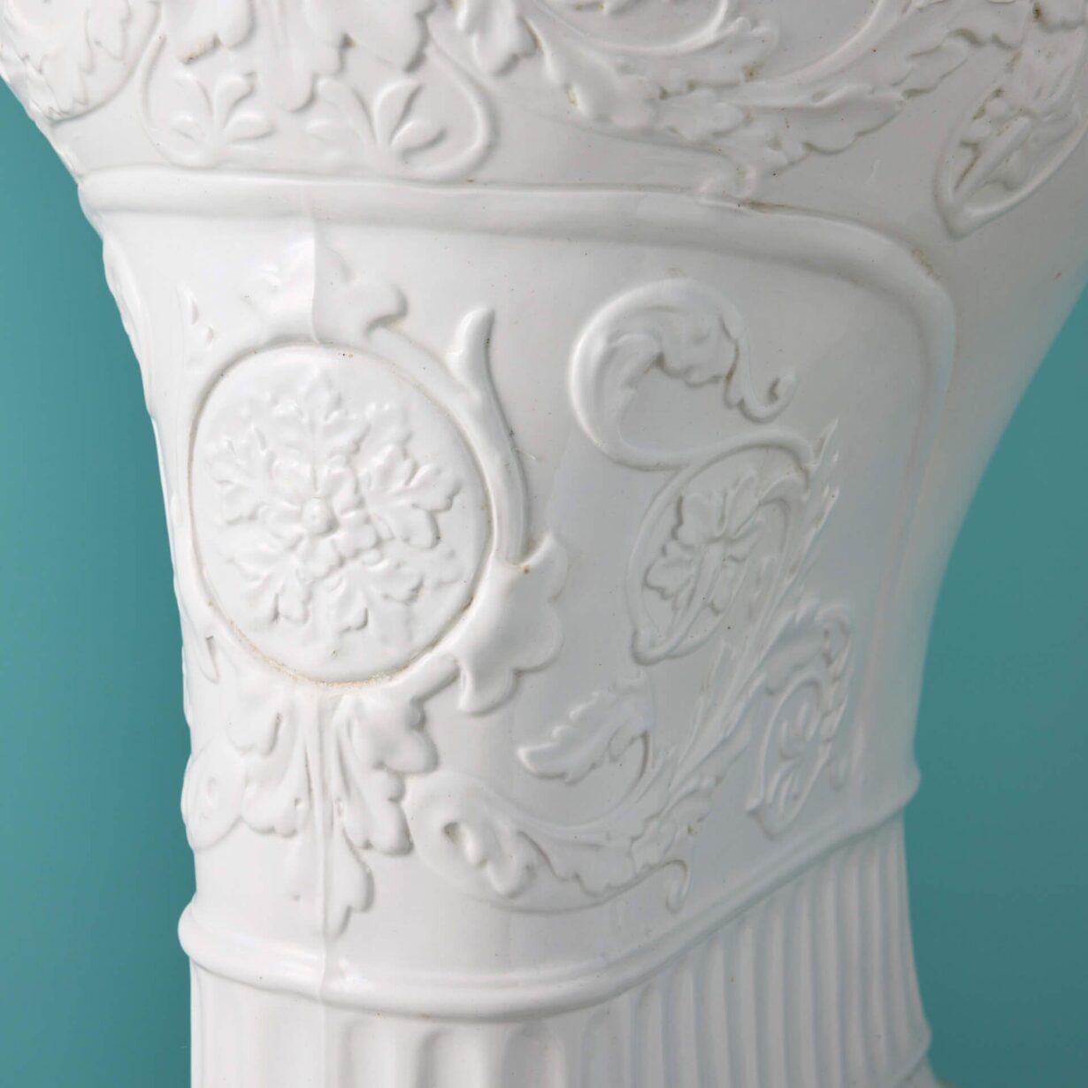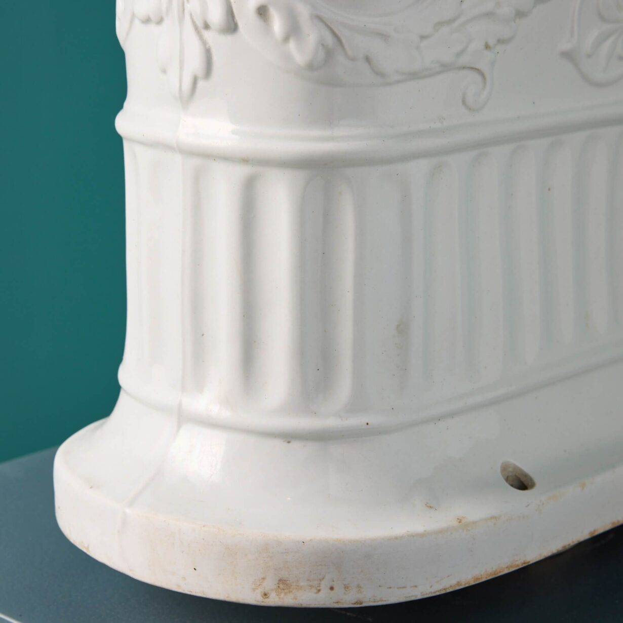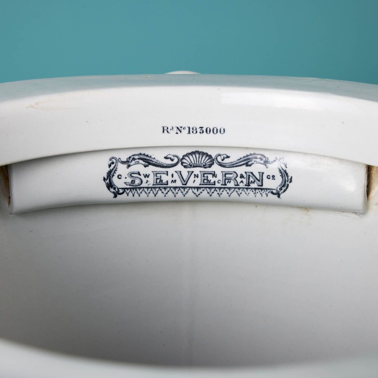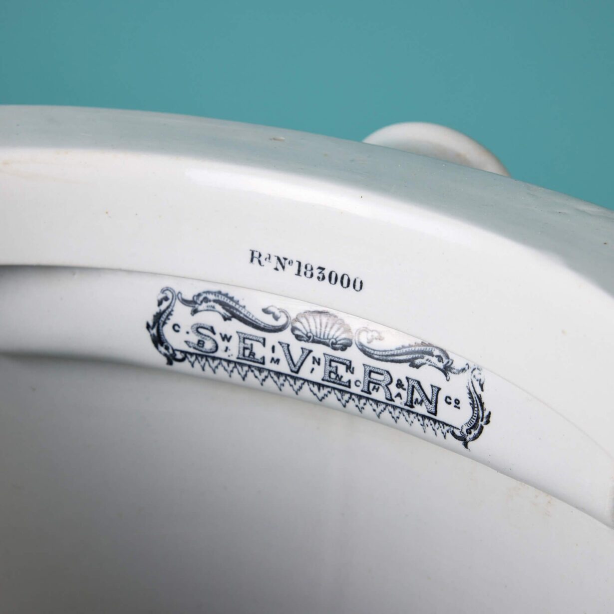 back to topAn excellent condition glazed white porcelain embossed antique toilet by Charles Winn & Co. circa 1890. This model is the ‘Severn’ No. 183000 and features beautiful, embossed relief decoration to the outside that brings elegance to any period bathroom or vintage ensuite. It is designed for use with a high level cistern and the waste exits through the base.