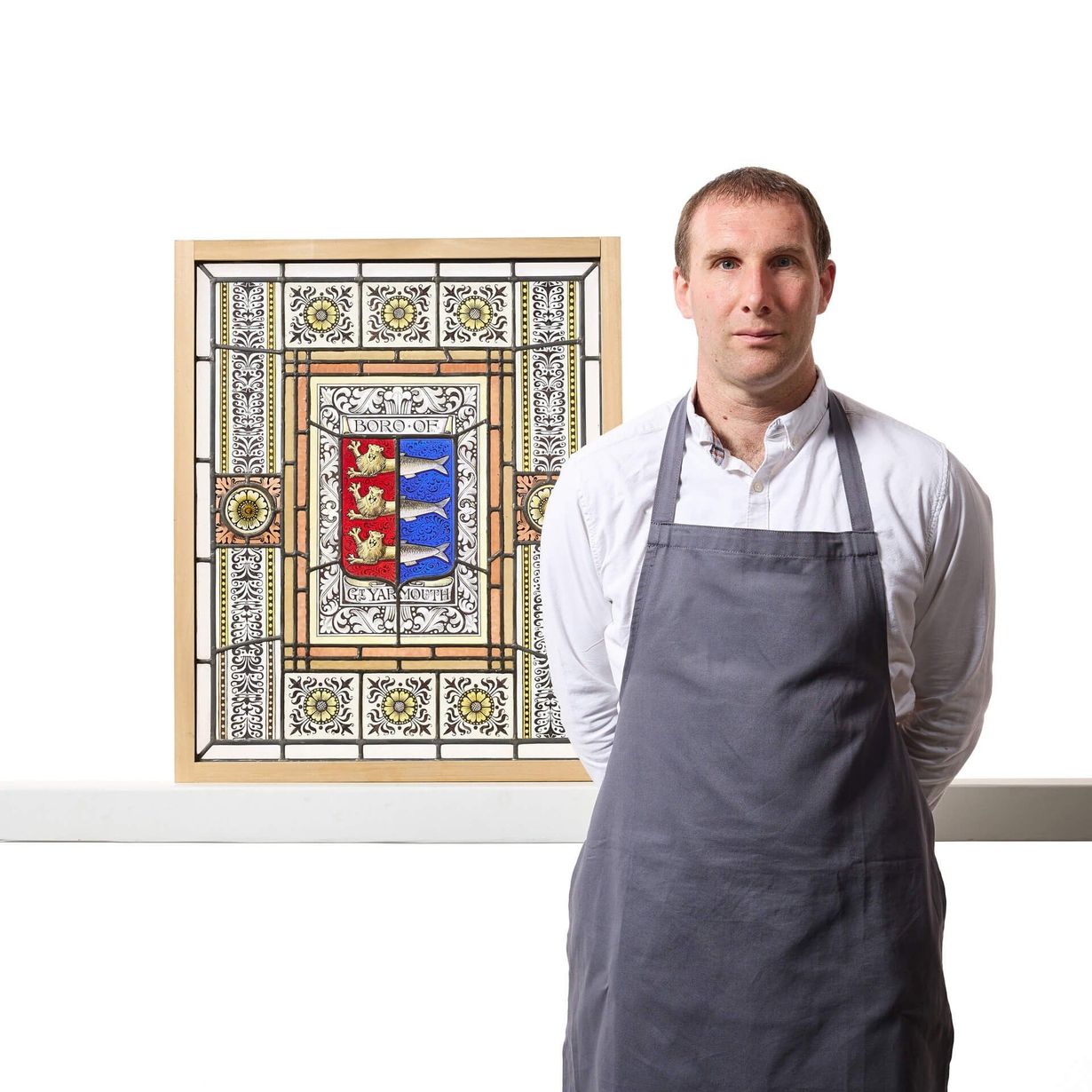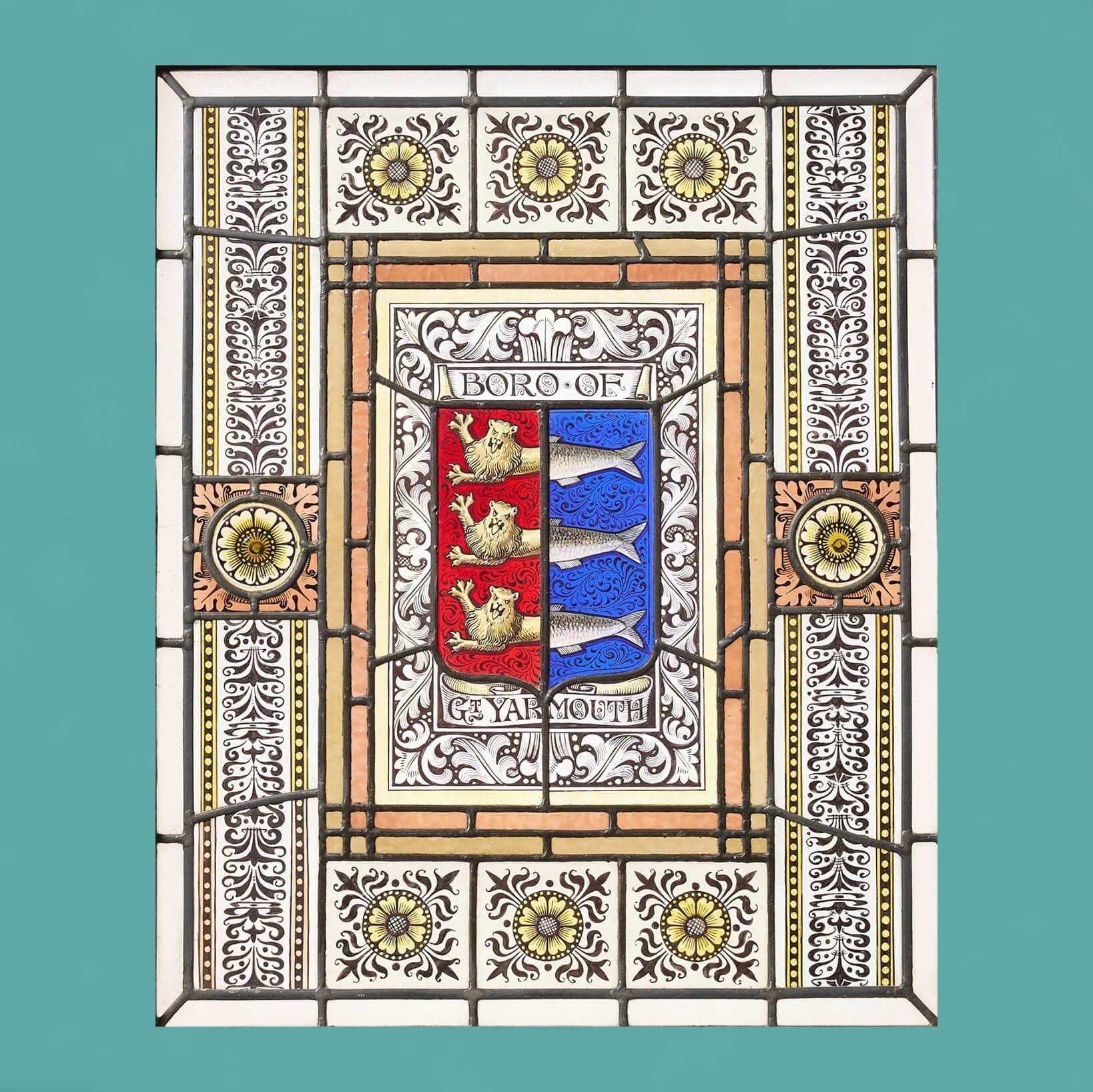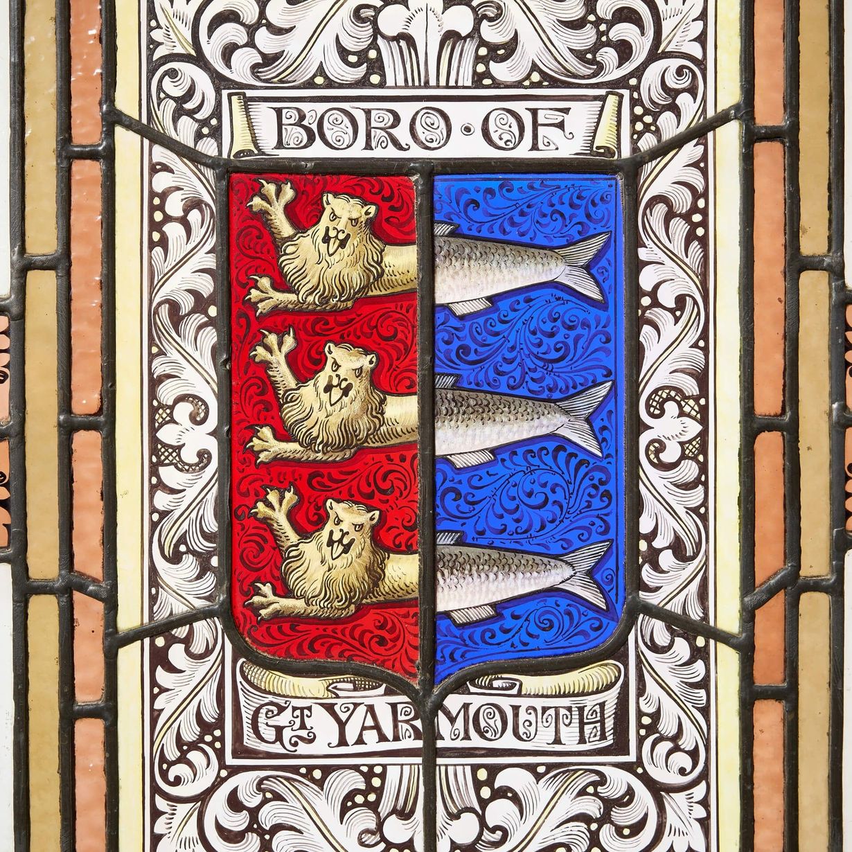 back to topA late 19th / early 20th century stained glass window bearing the coat of arms of Great Yarmouth. This crest dates back to the 14th century, detailing a shield with half lions to one side and half fish to the other.