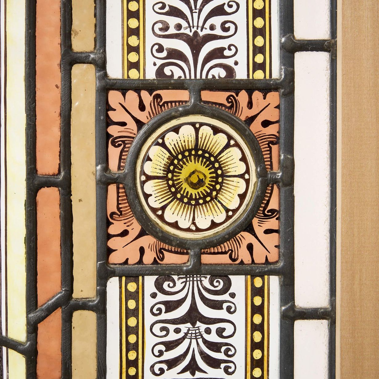 Dating from the cusp of the 20th century, this antique stained glass window celebrates this historic armorial, centring the coat of arms within an ornate foliate border.