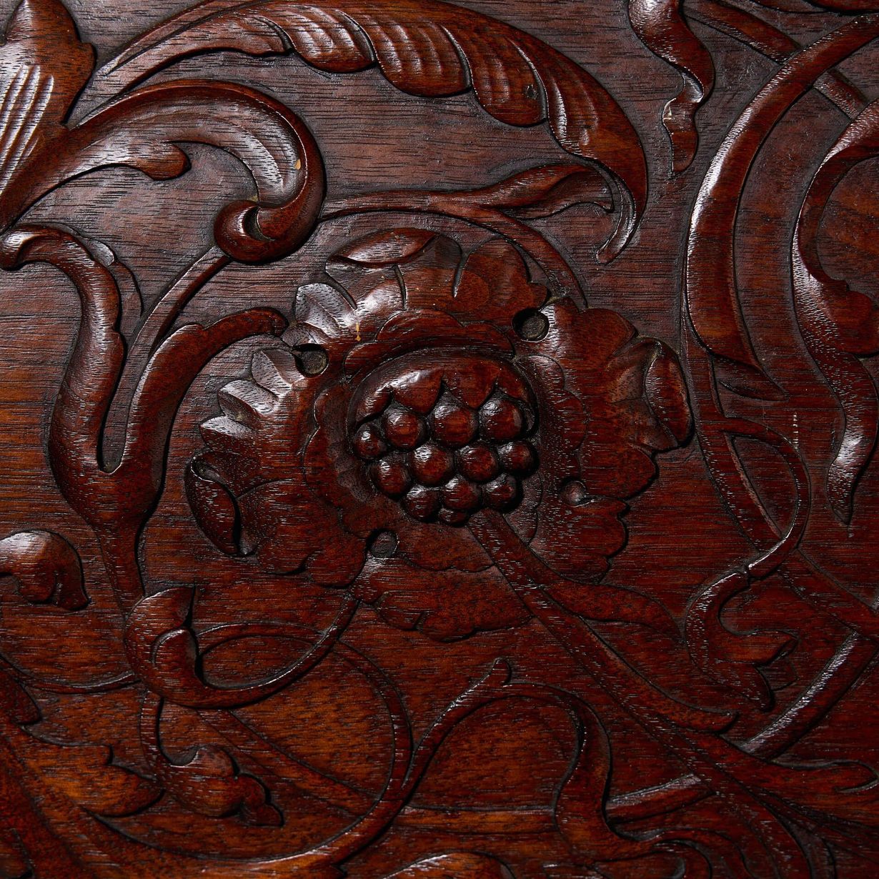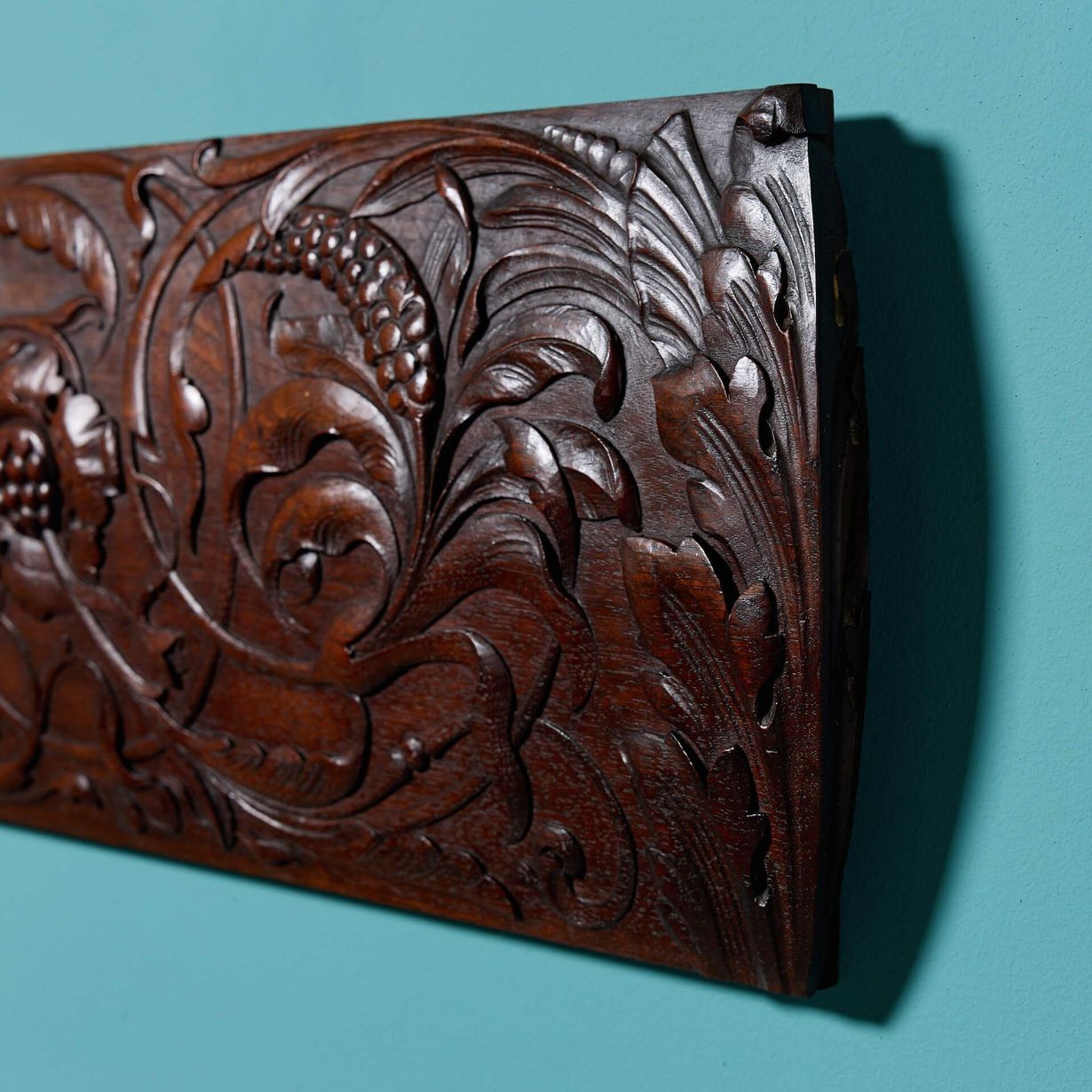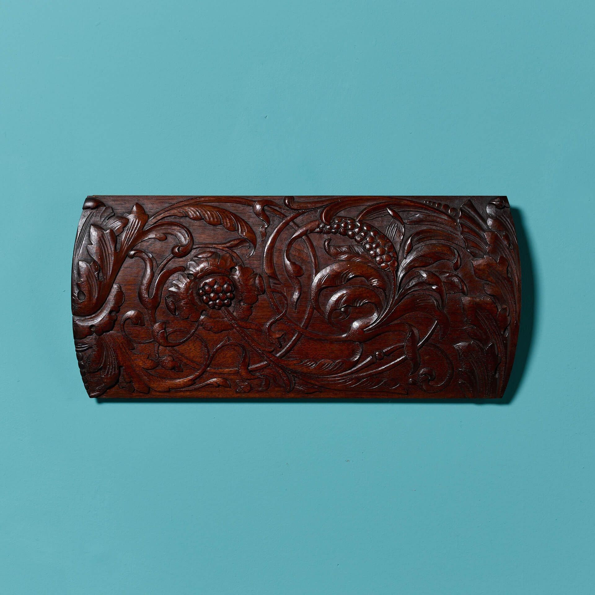 back to topA late 19th century mahogany decorative wall panel, beautifully handcarved with scrolling florals, foliage and berries.