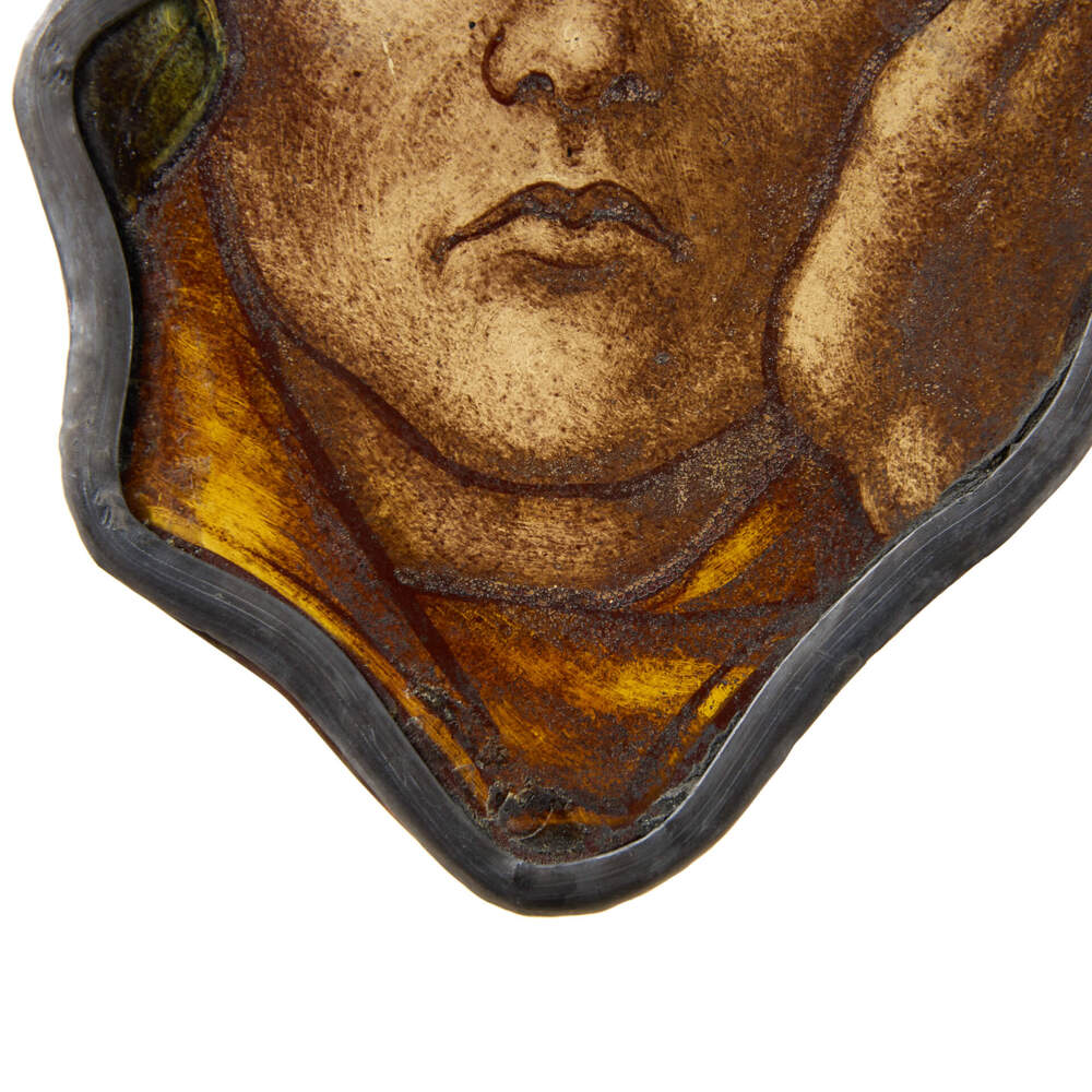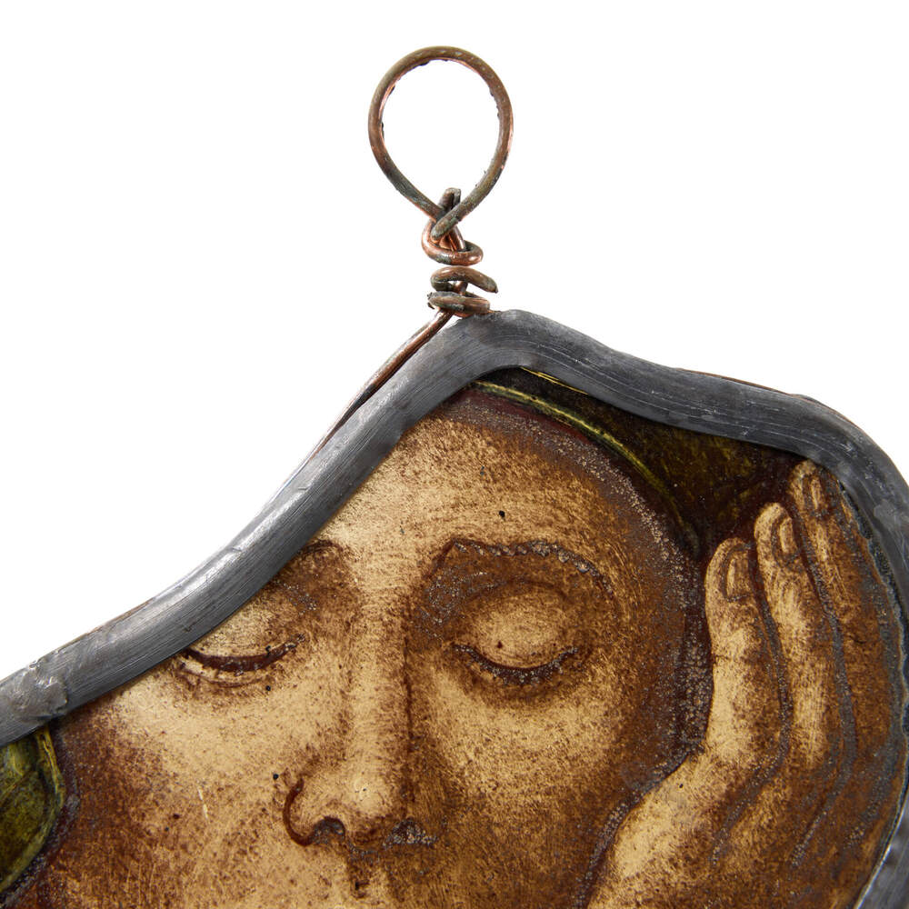 back to topA small early 19th century antique stained glass window hanging depicting a fragment of a post-medieval woman resting her face on her hand with eyes closed, circa 1800.