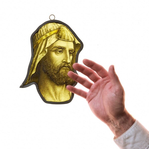 This is just one of various stained and hand painted panels we are selling that once formed part of this striking church window. Hang in a window or in front of a light source to bring its colours and character to life.